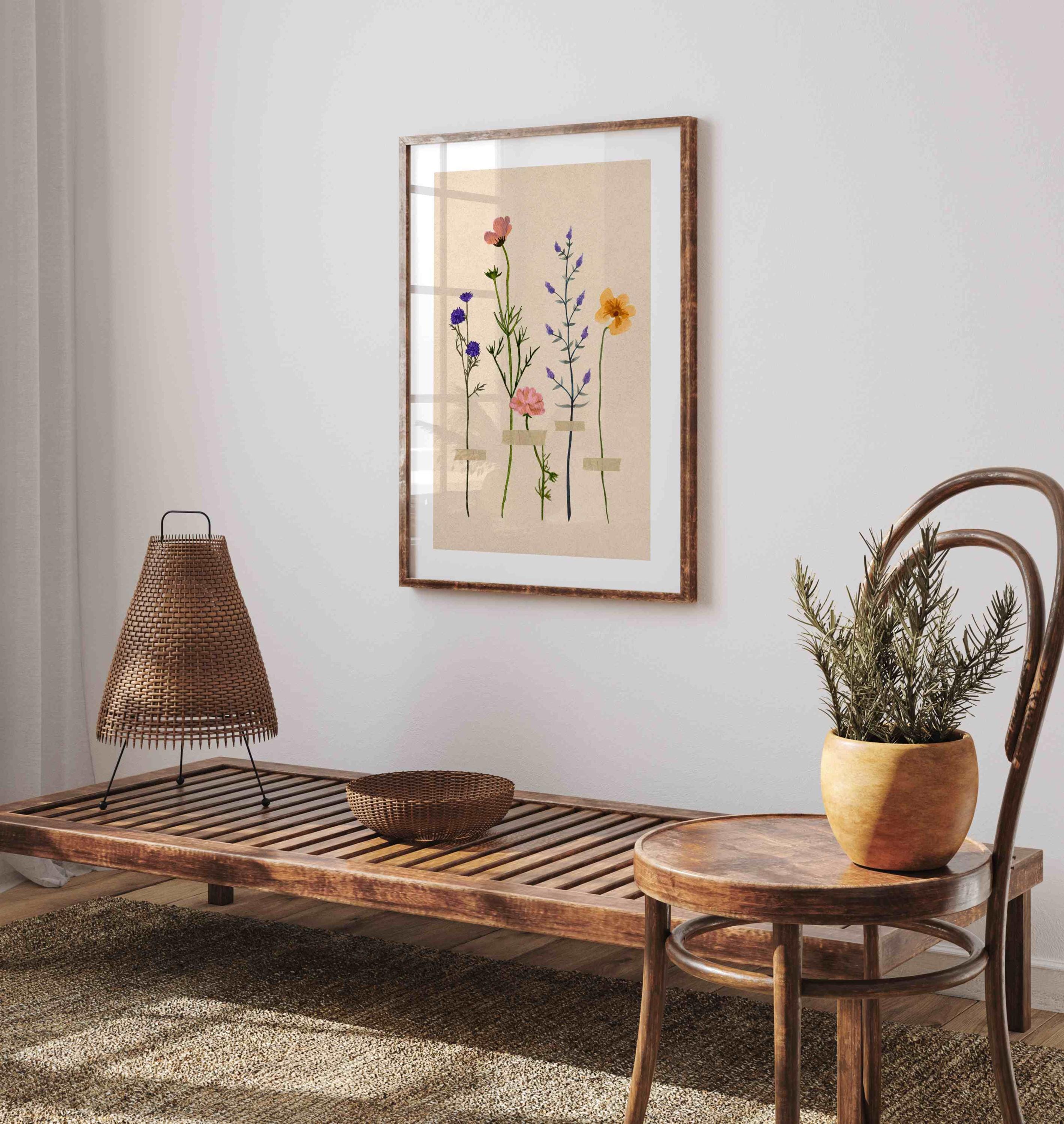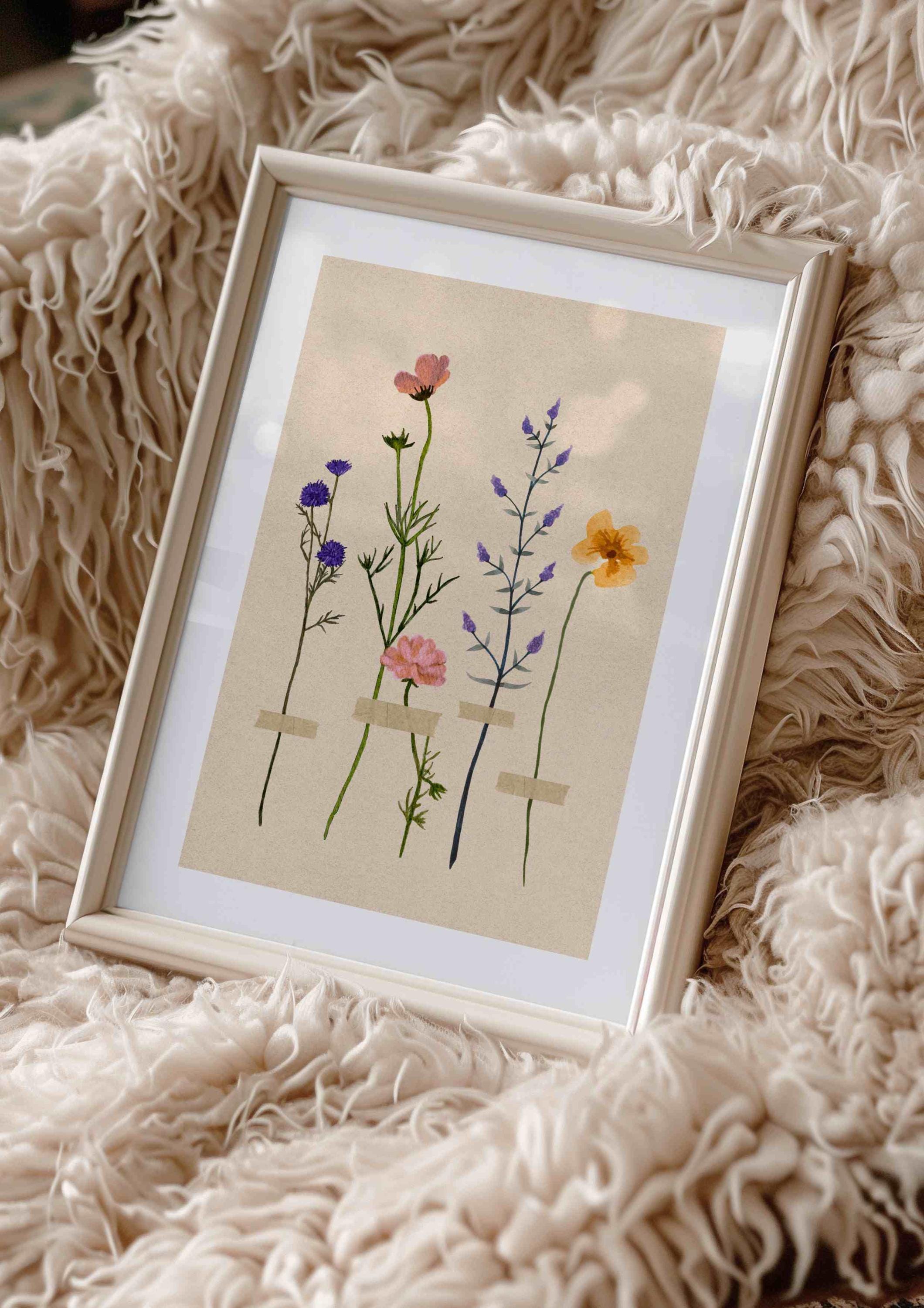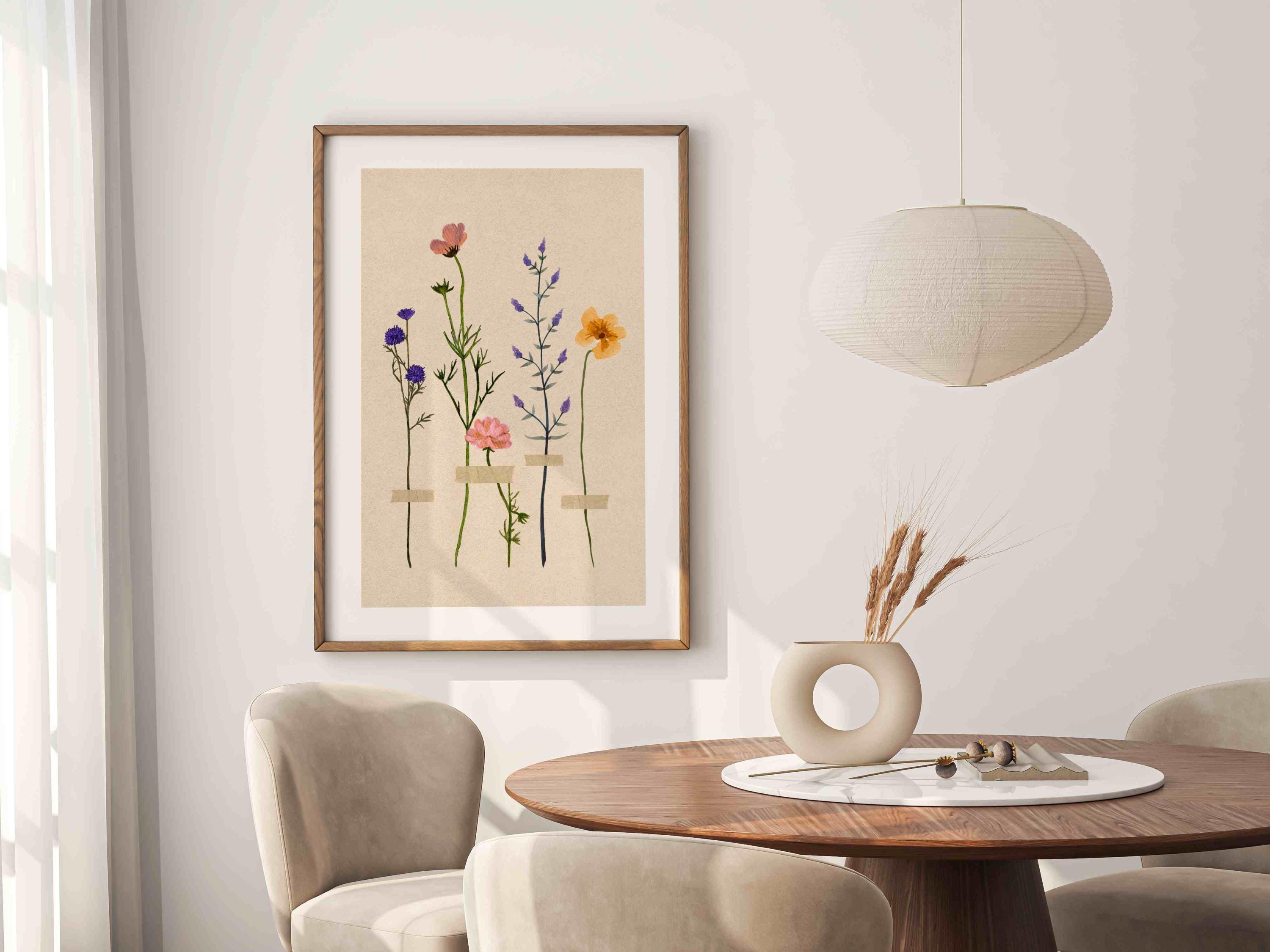 Vintage style wildflower print featuring pressed botanical illustrations on a soft, neutral background. The gentle colors and simple layout create a calm, timeless look that suits cottagecore, minimalist, or rustic interiors. An easy piece to style on its own or alongside other botanical prints.