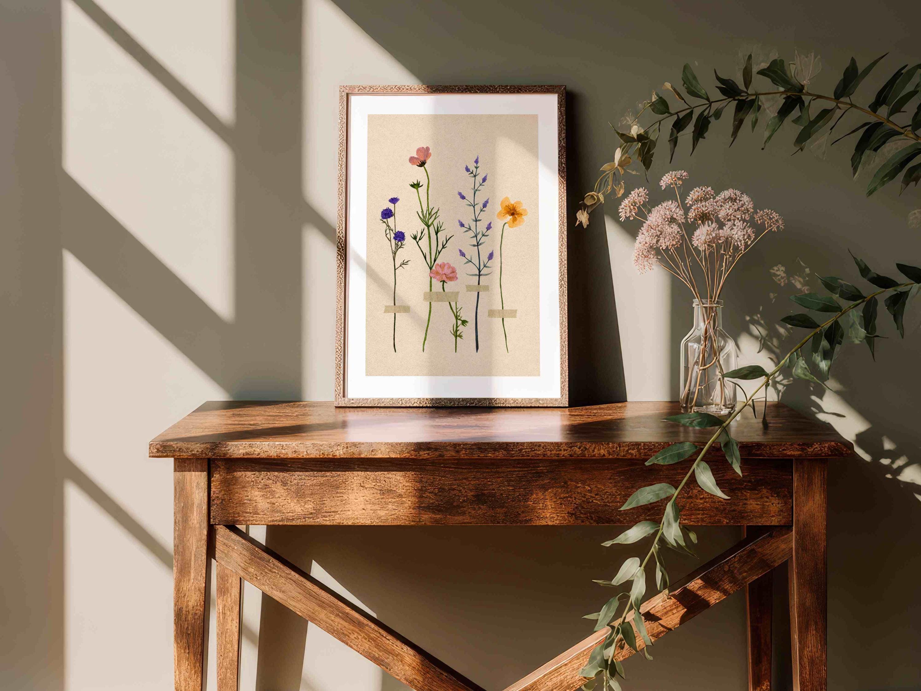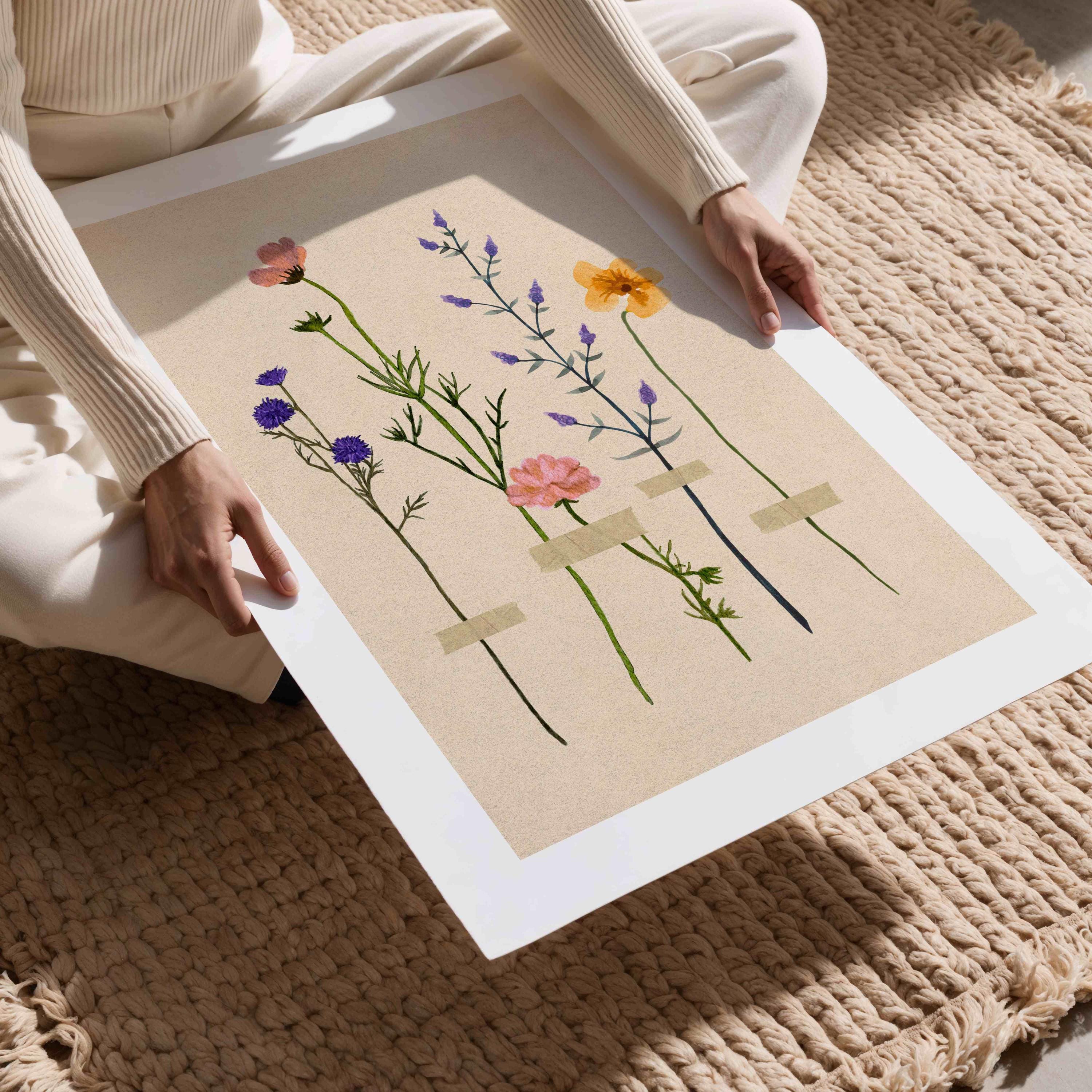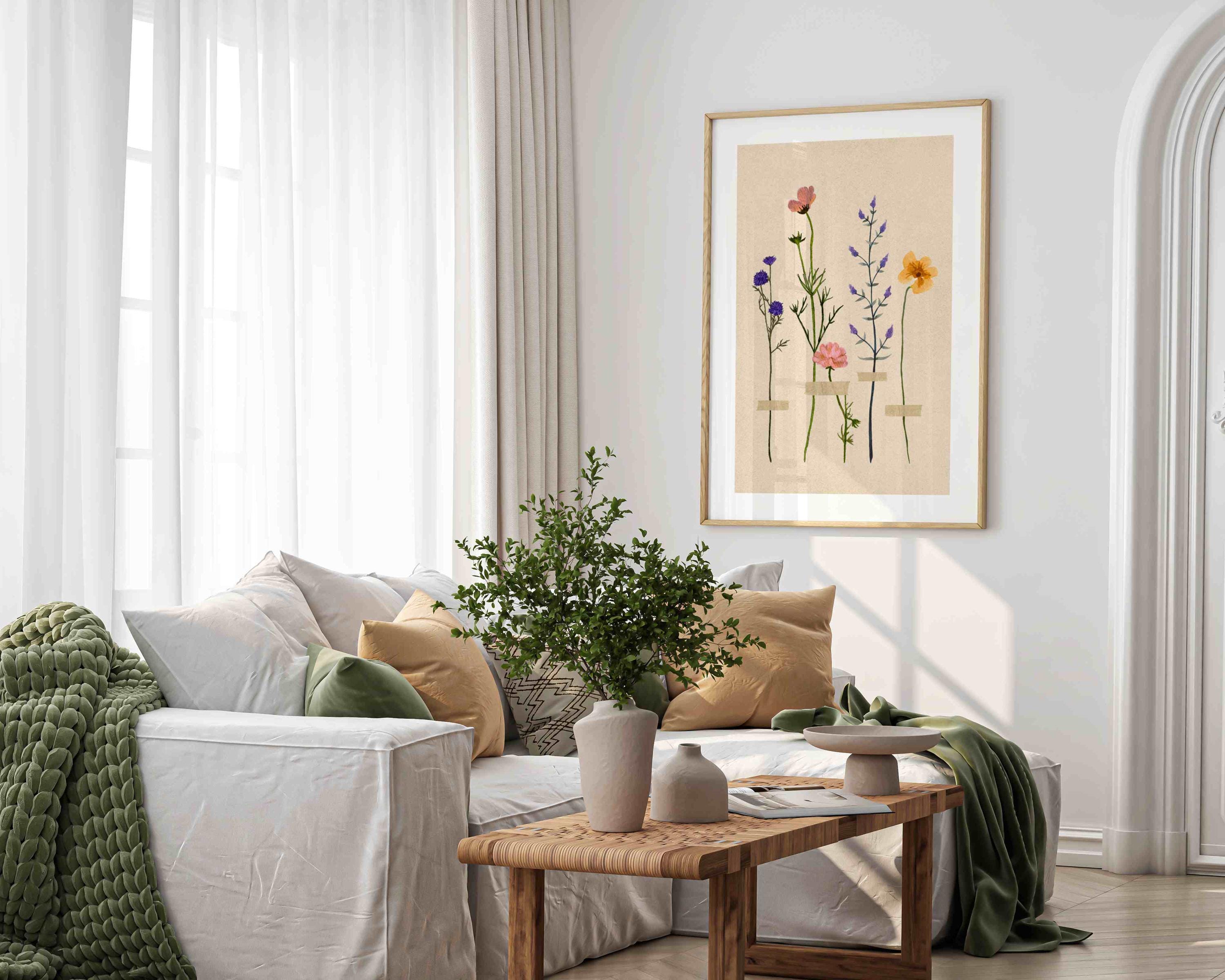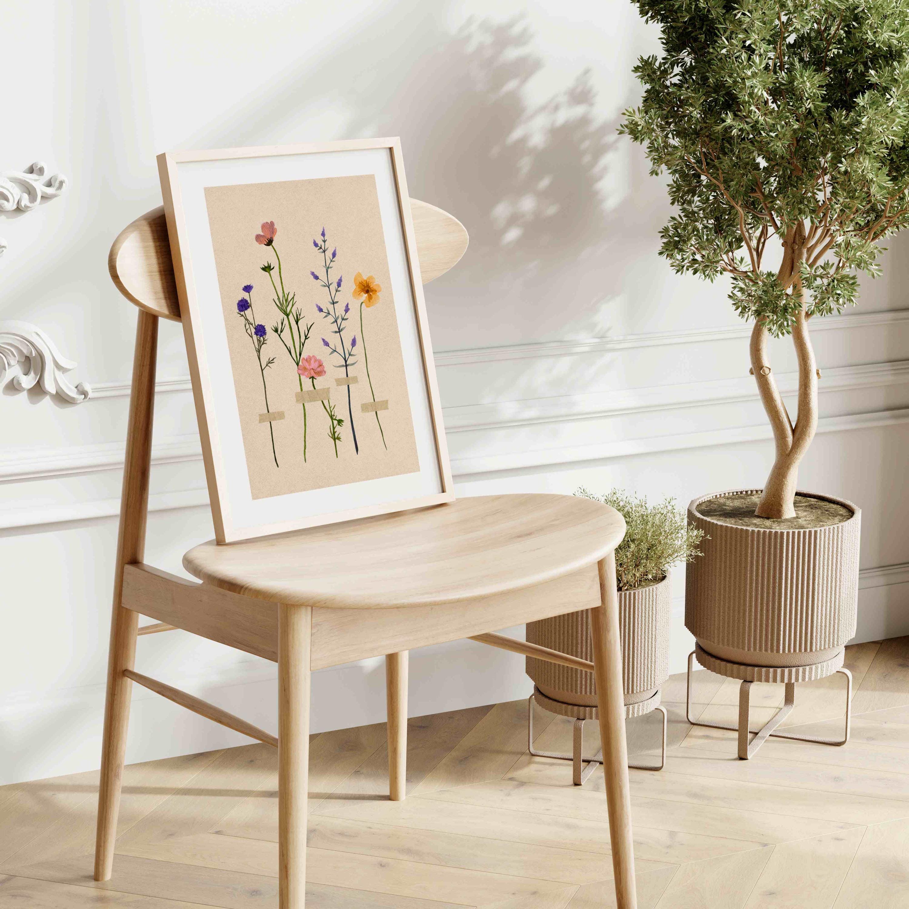 Vintage style wildflower print featuring pressed botanical illustrations on a soft, neutral background. The gentle colors and simple layout create a calm, timeless look that suits cottagecore, minimalist, or rustic interiors. An easy piece to style on its own or alongside other botanical prints.