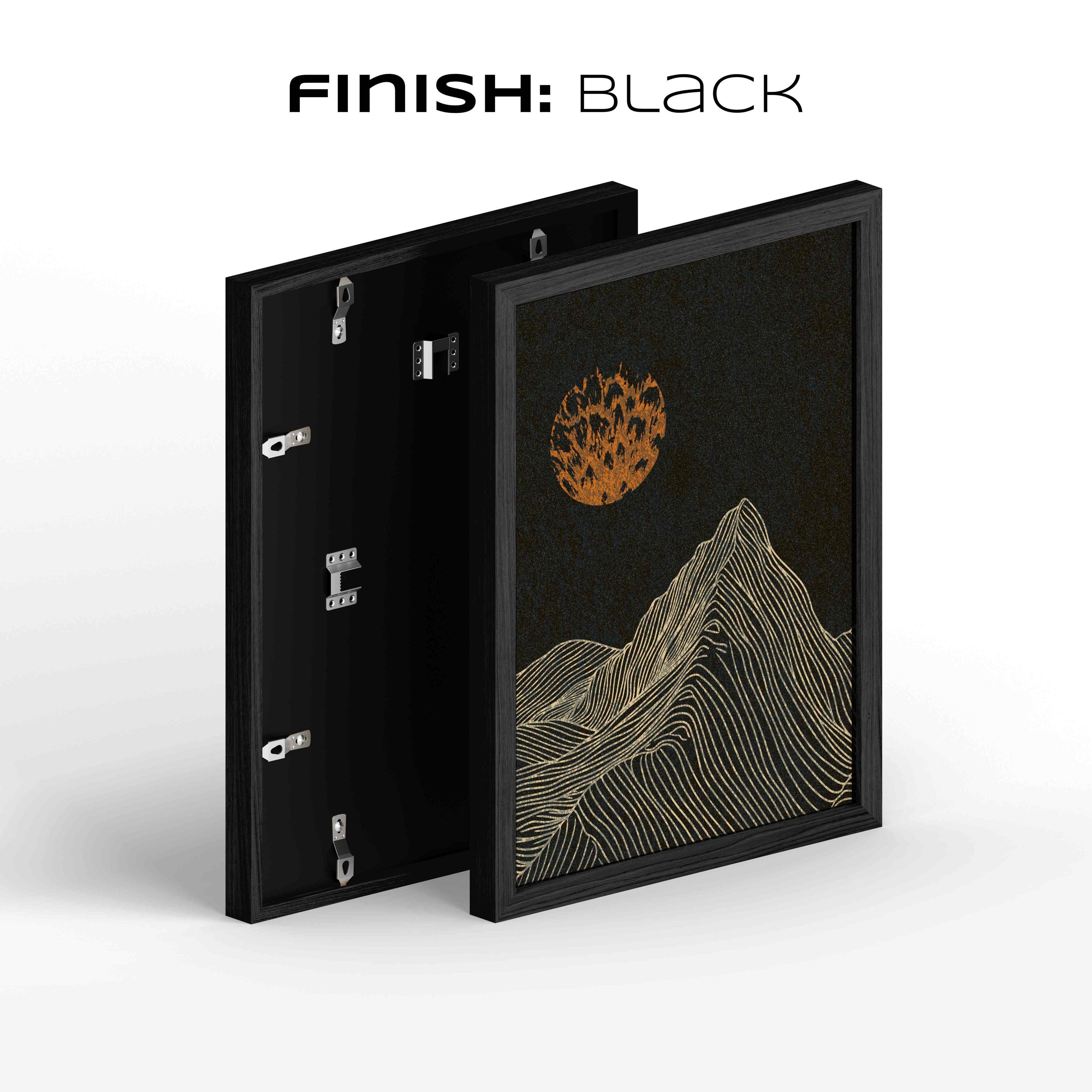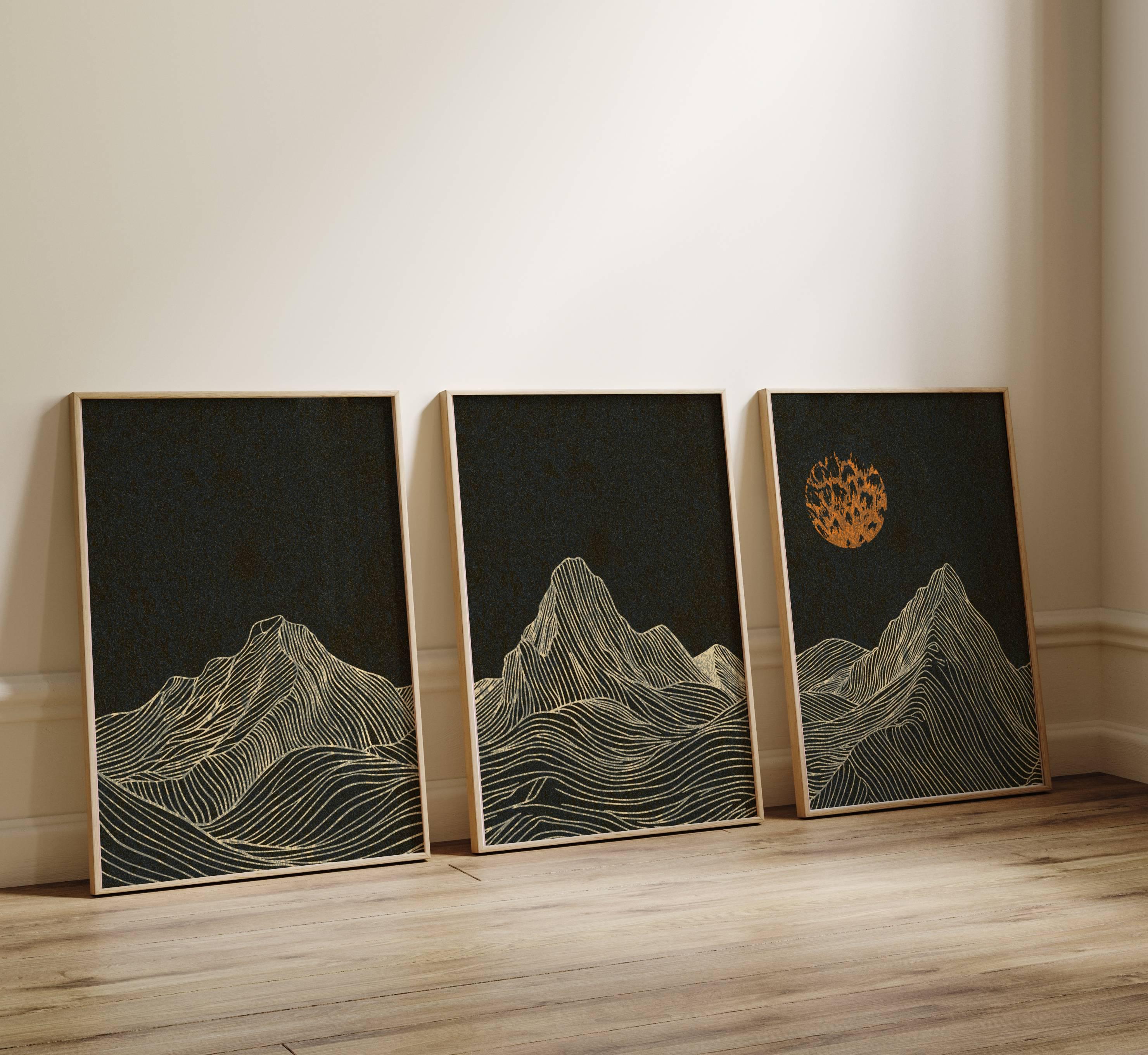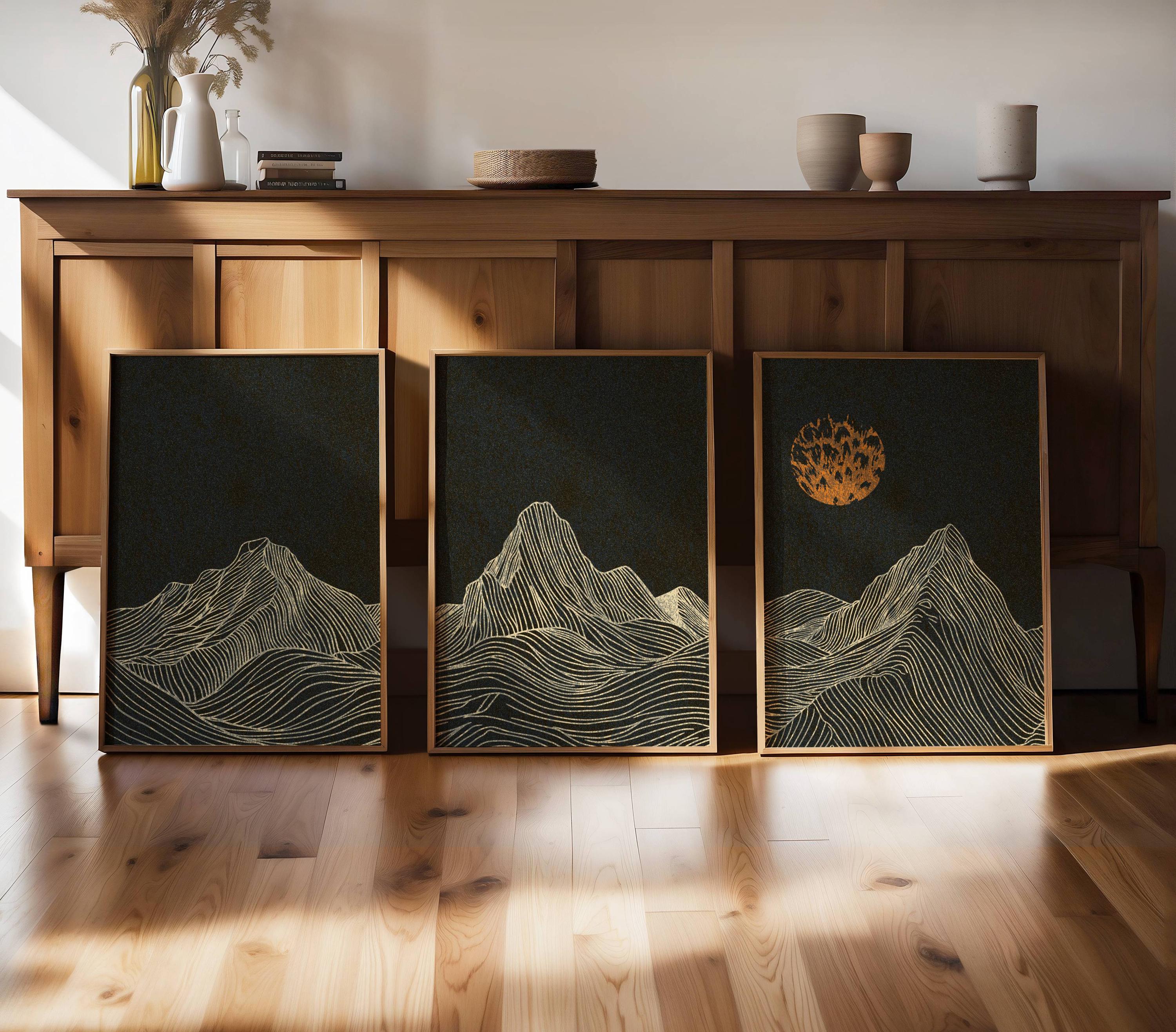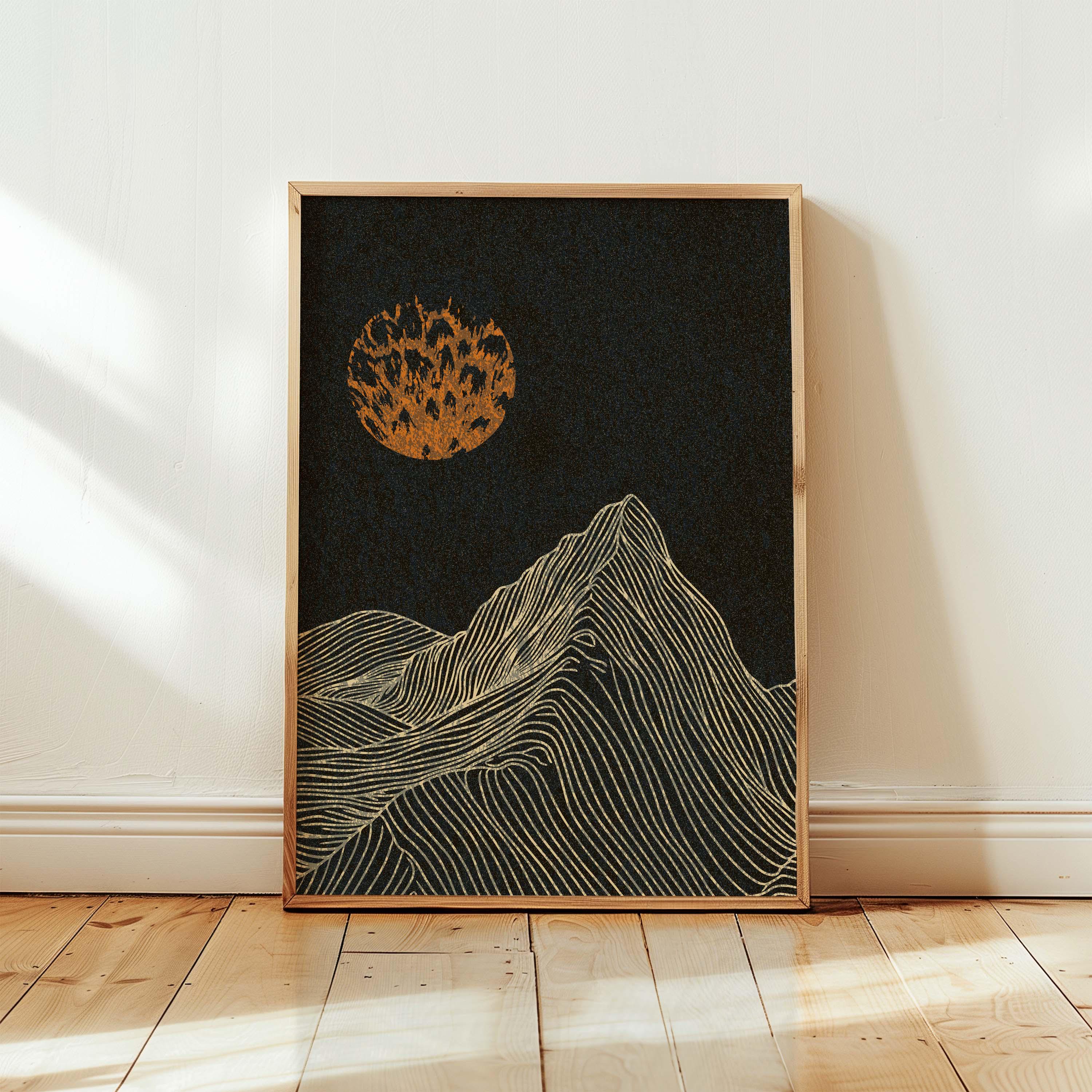 Framed mountain wall art set featuring a minimalist night landscape with full moon in a black, burnt orange and cream color palette. This abstract nature set is designed to be displayed as a triptych, creating a stunning focal point on your wall. Perfect for enhancing up any modern or contemporary space, be it your living room, bedroom, office or anywhere else.