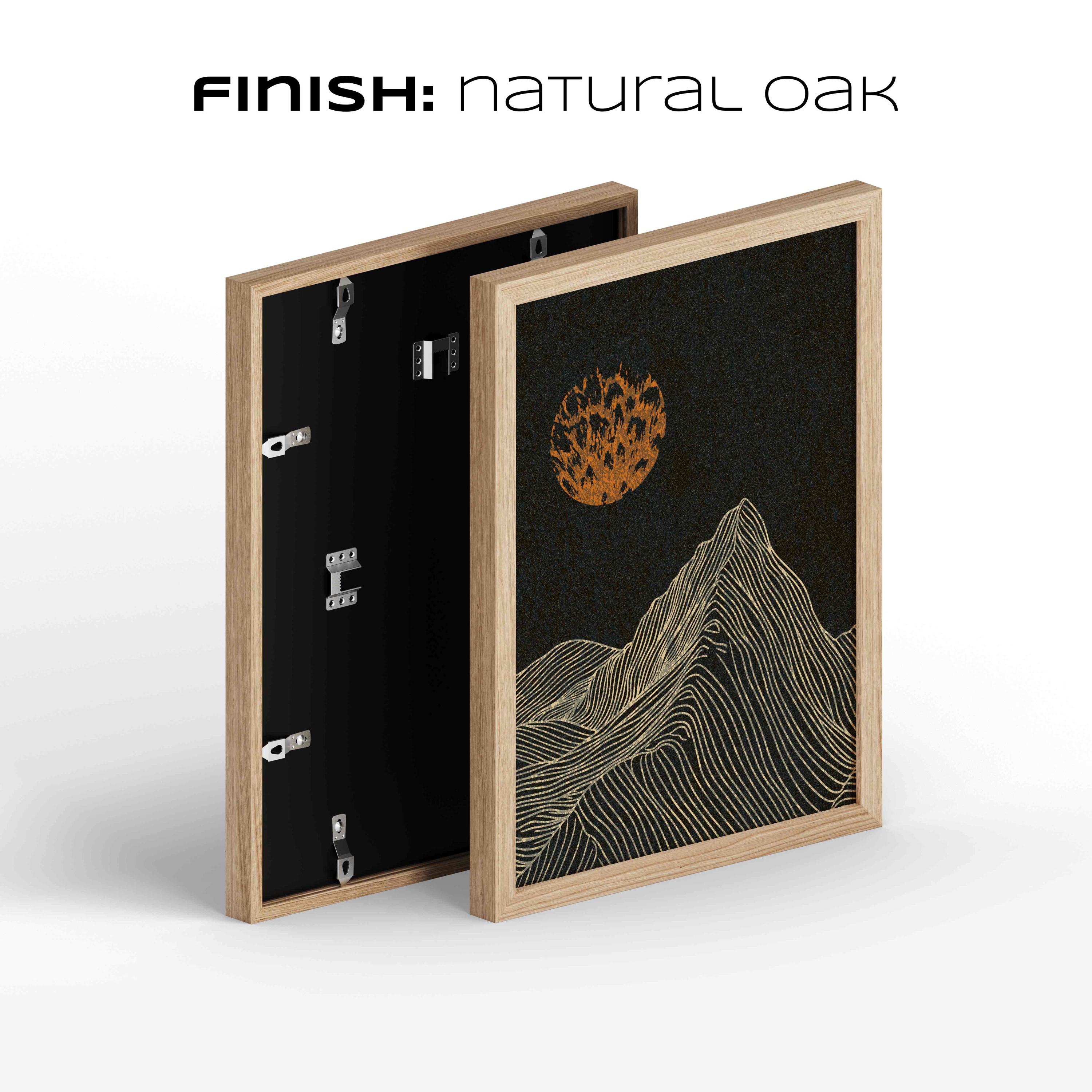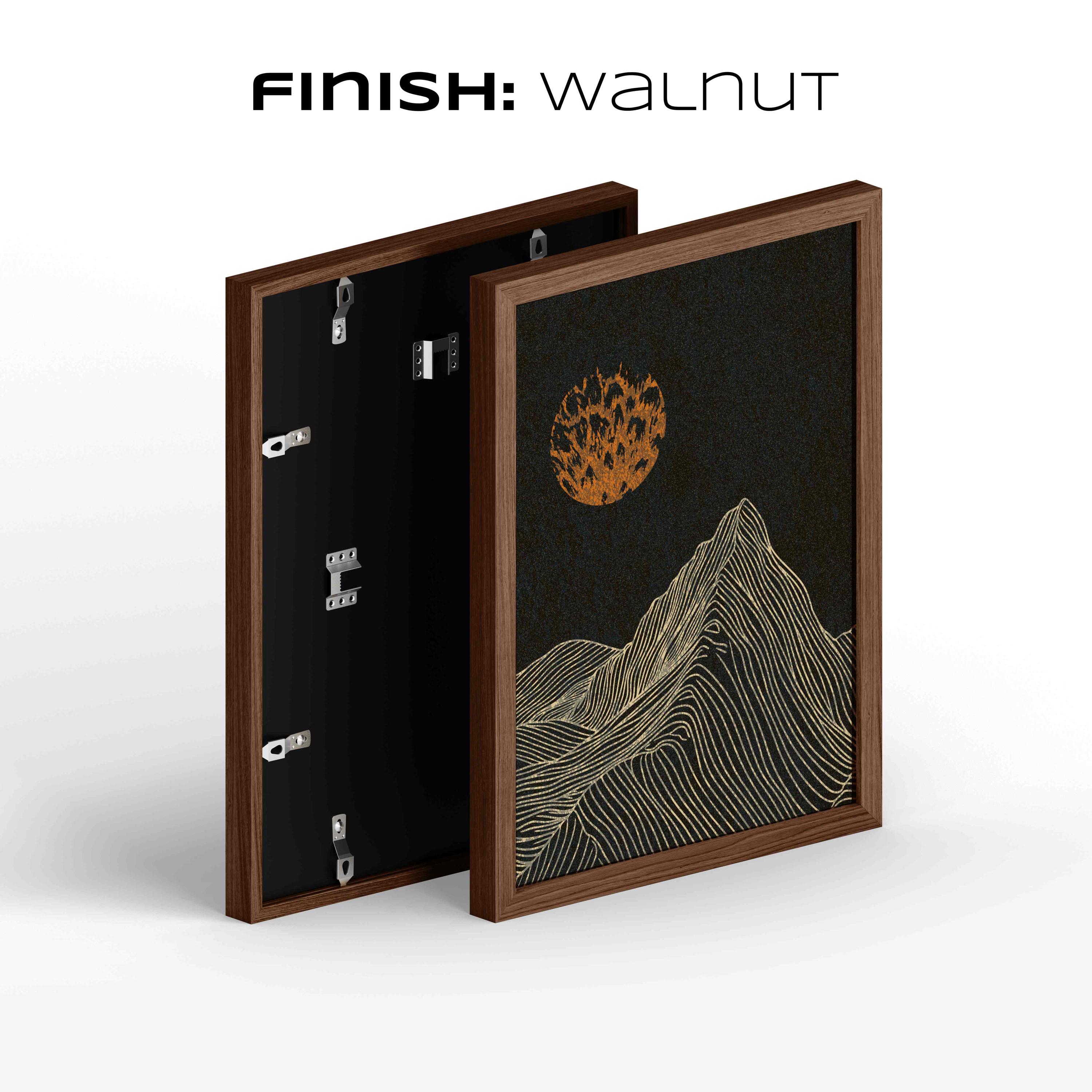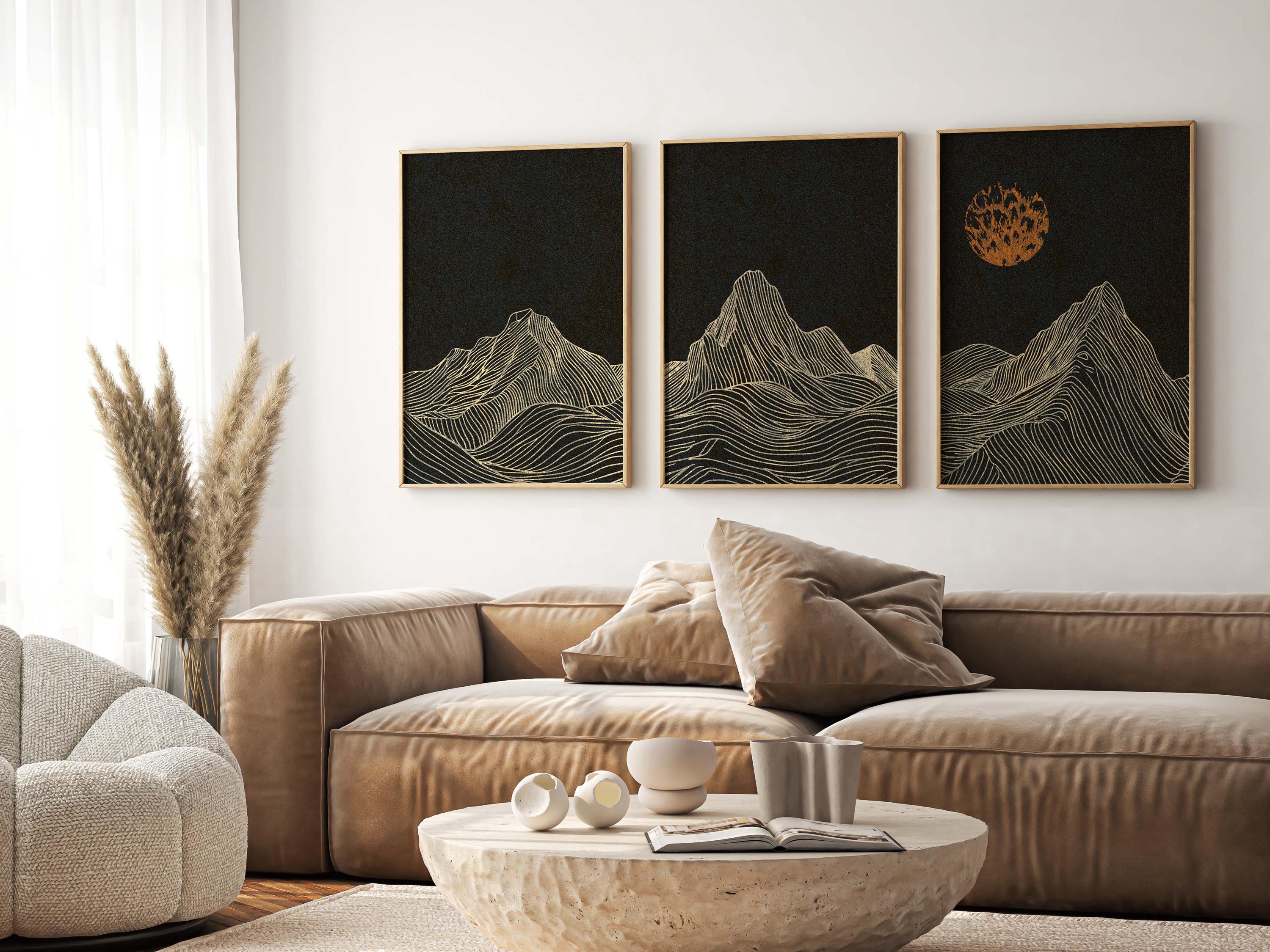 Framed mountain wall art set featuring a minimalist night landscape with full moon in a black, burnt orange and cream color palette. This abstract nature set is designed to be displayed as a triptych, creating a stunning focal point on your wall. Perfect for enhancing up any modern or contemporary space, be it your living room, bedroom, office or anywhere else.