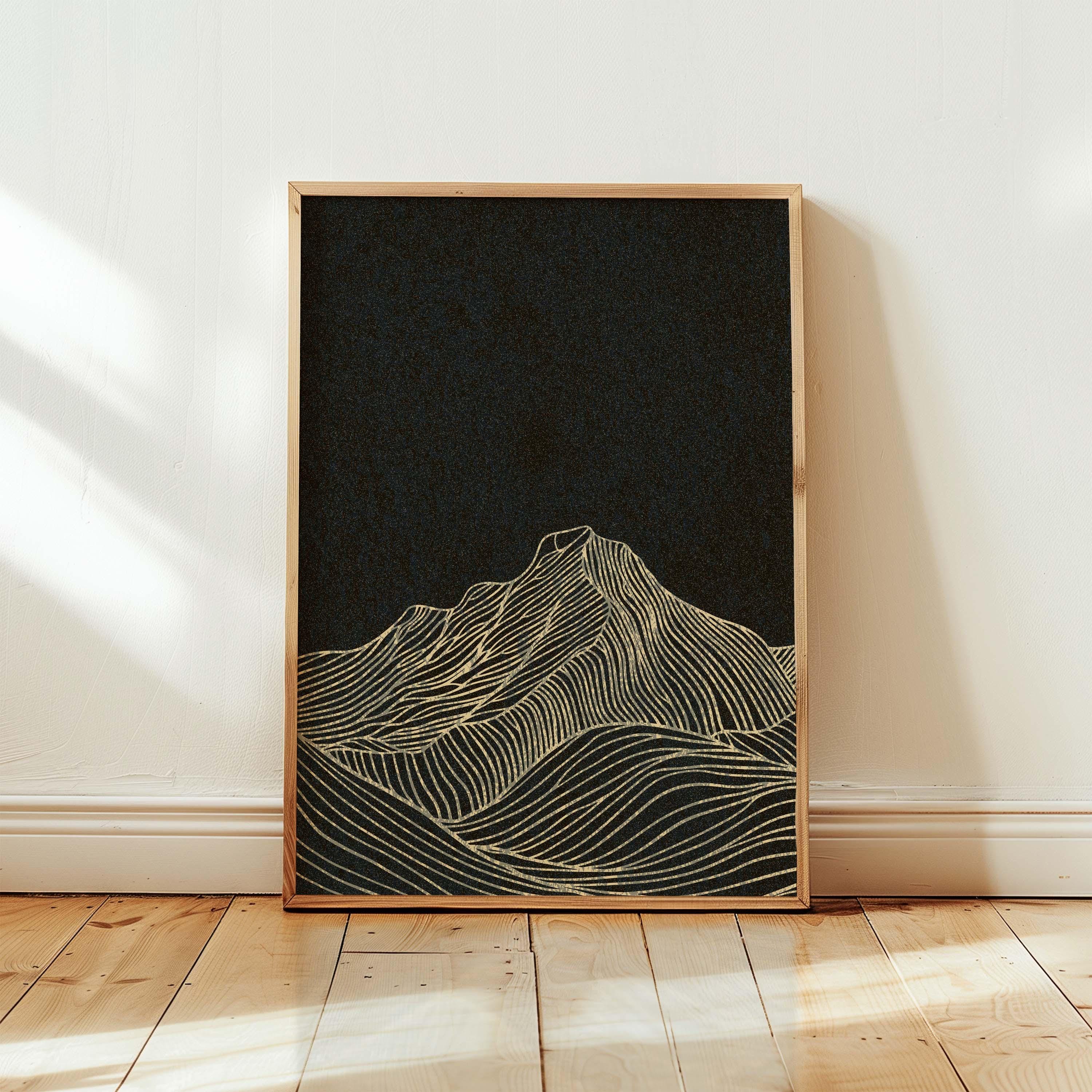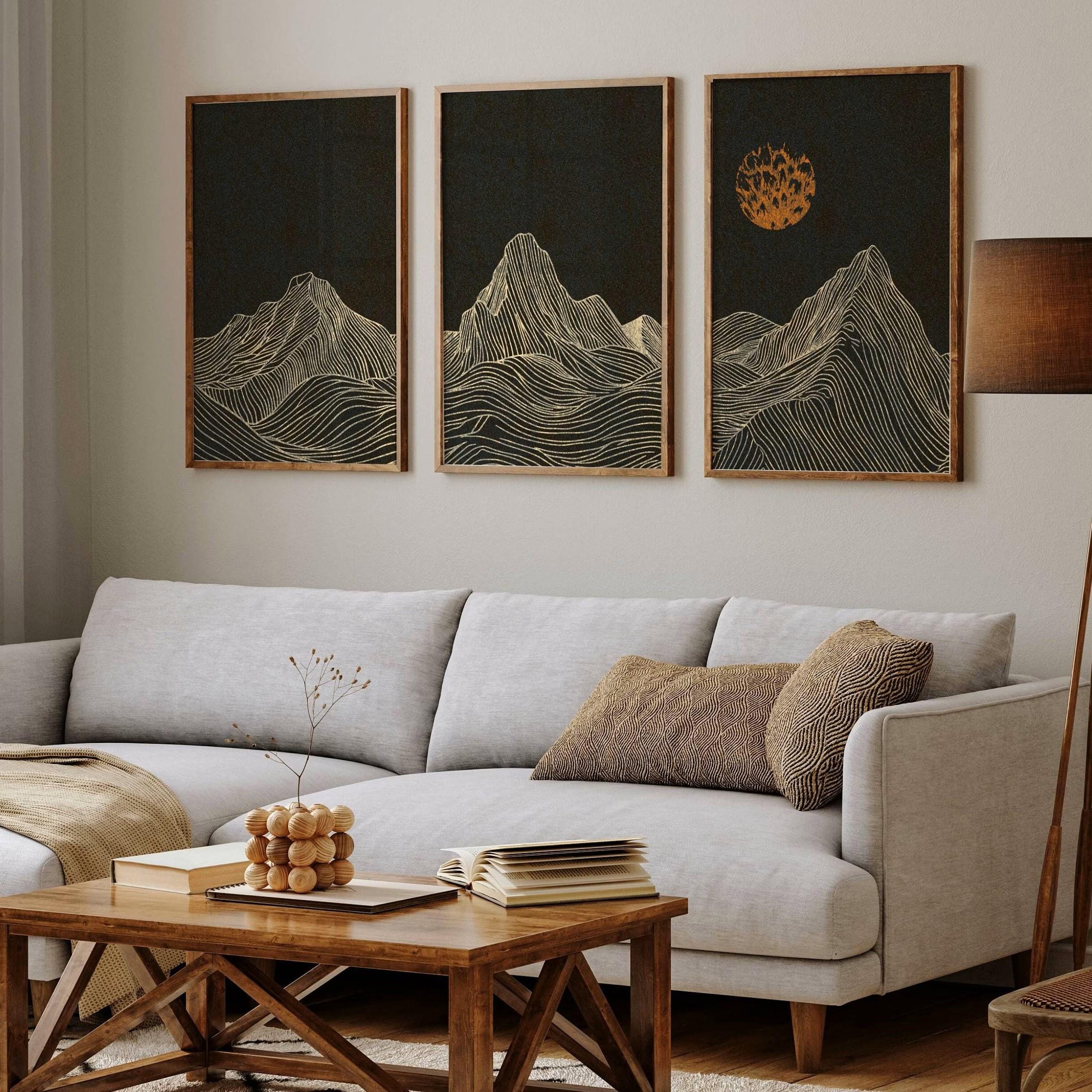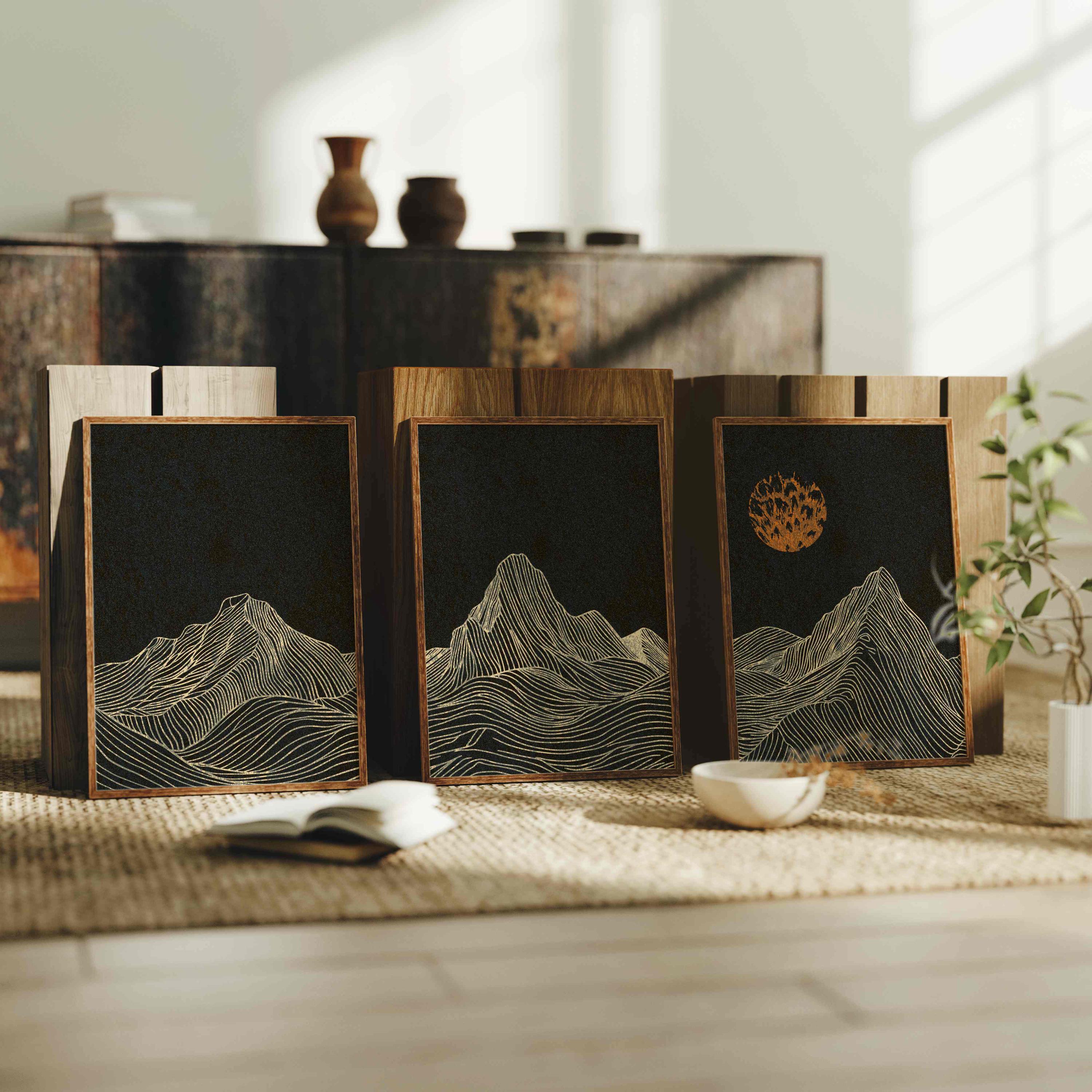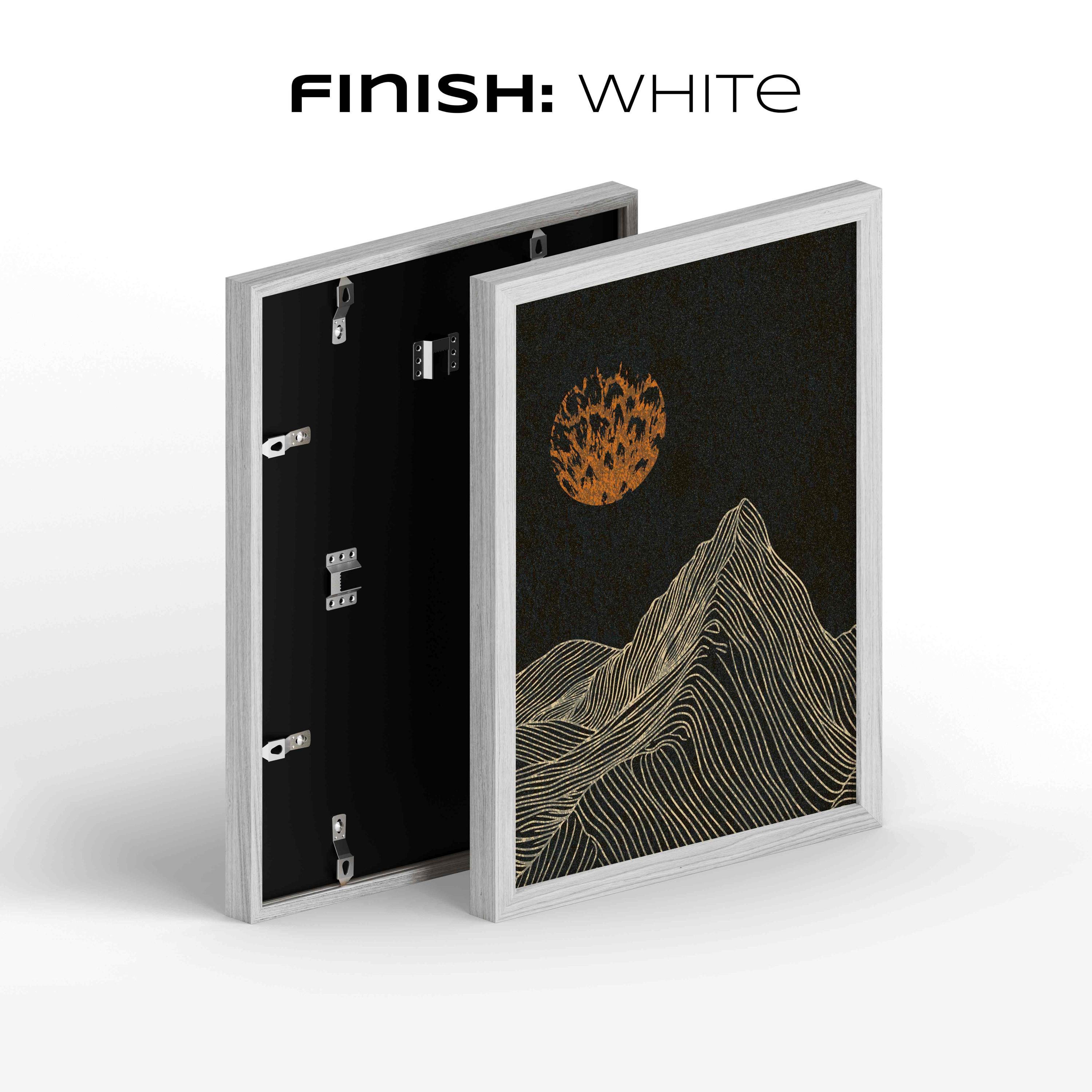 Framed mountain wall art set featuring a minimalist night landscape with full moon in a black, burnt orange and cream color palette. This abstract nature set is designed to be displayed as a triptych, creating a stunning focal point on your wall. Perfect for enhancing up any modern or contemporary space, be it your living room, bedroom, office or anywhere else.
