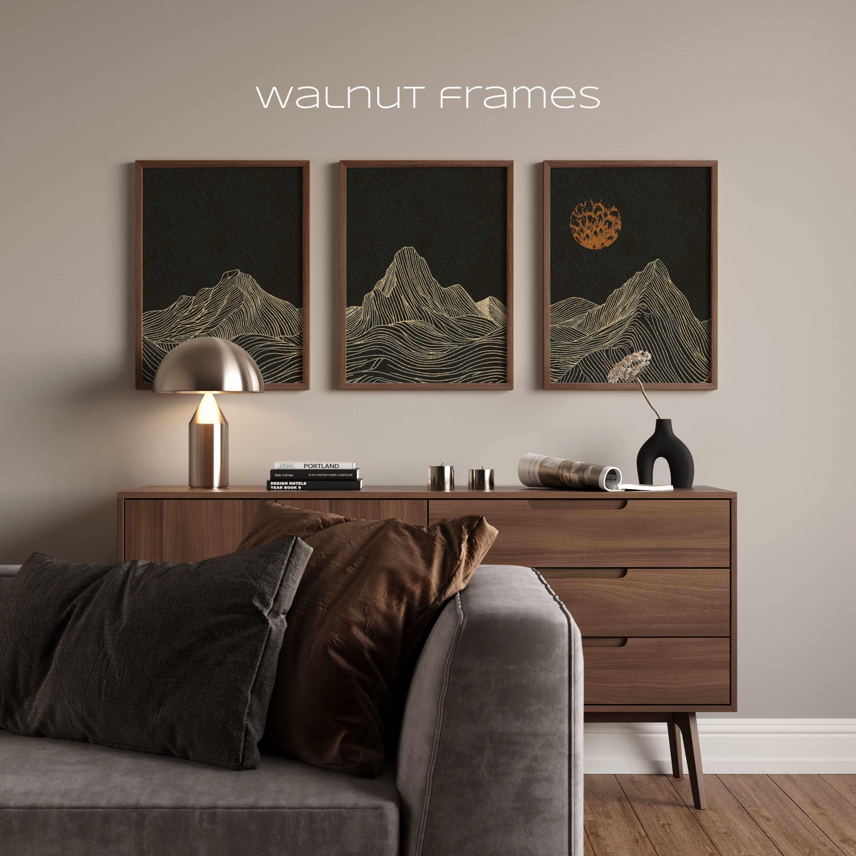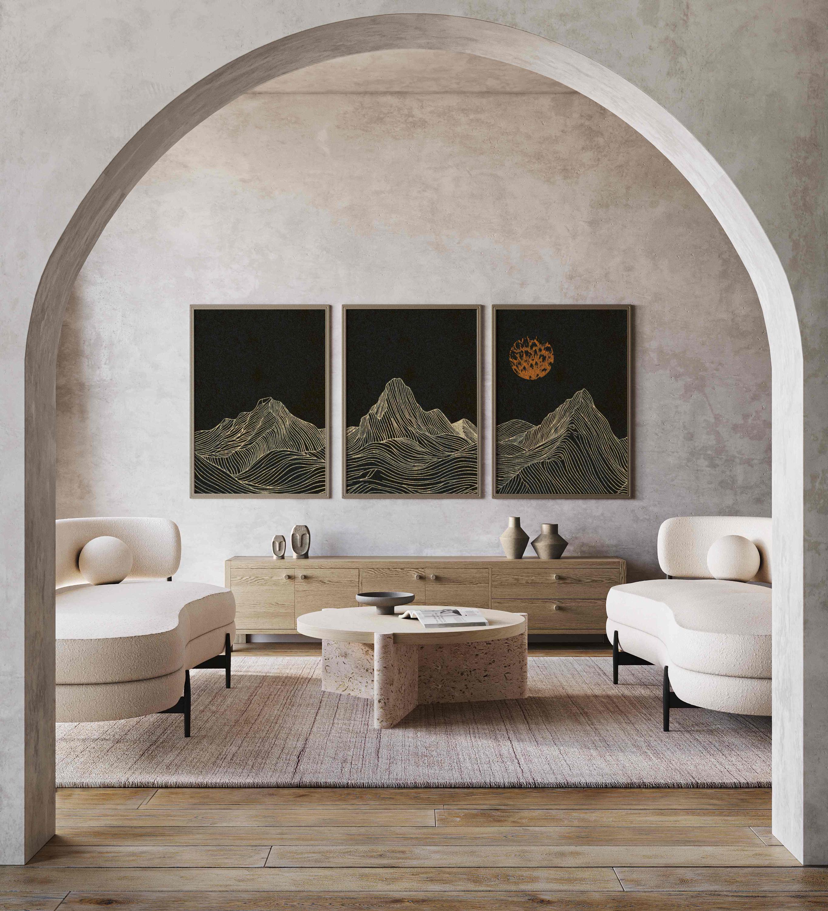 Framed minimalist mountain triptych featuring a moody night landscape in a black, burnt orange and cream color palette. Inspired by Japandi design, this set of three prints brings a calm, grounded feel to any space, making it perfect for Scandinavian, modern, or neutral interiors.