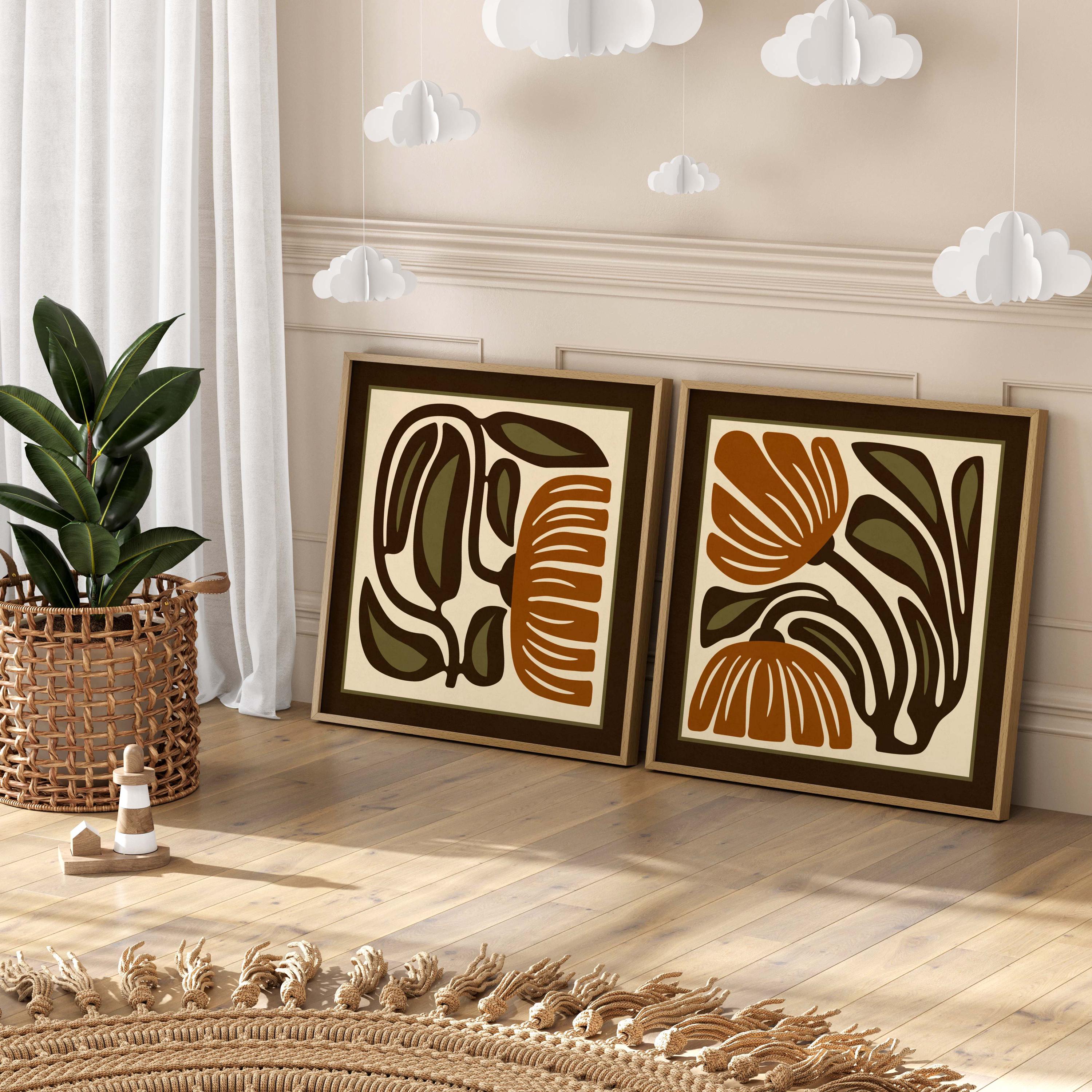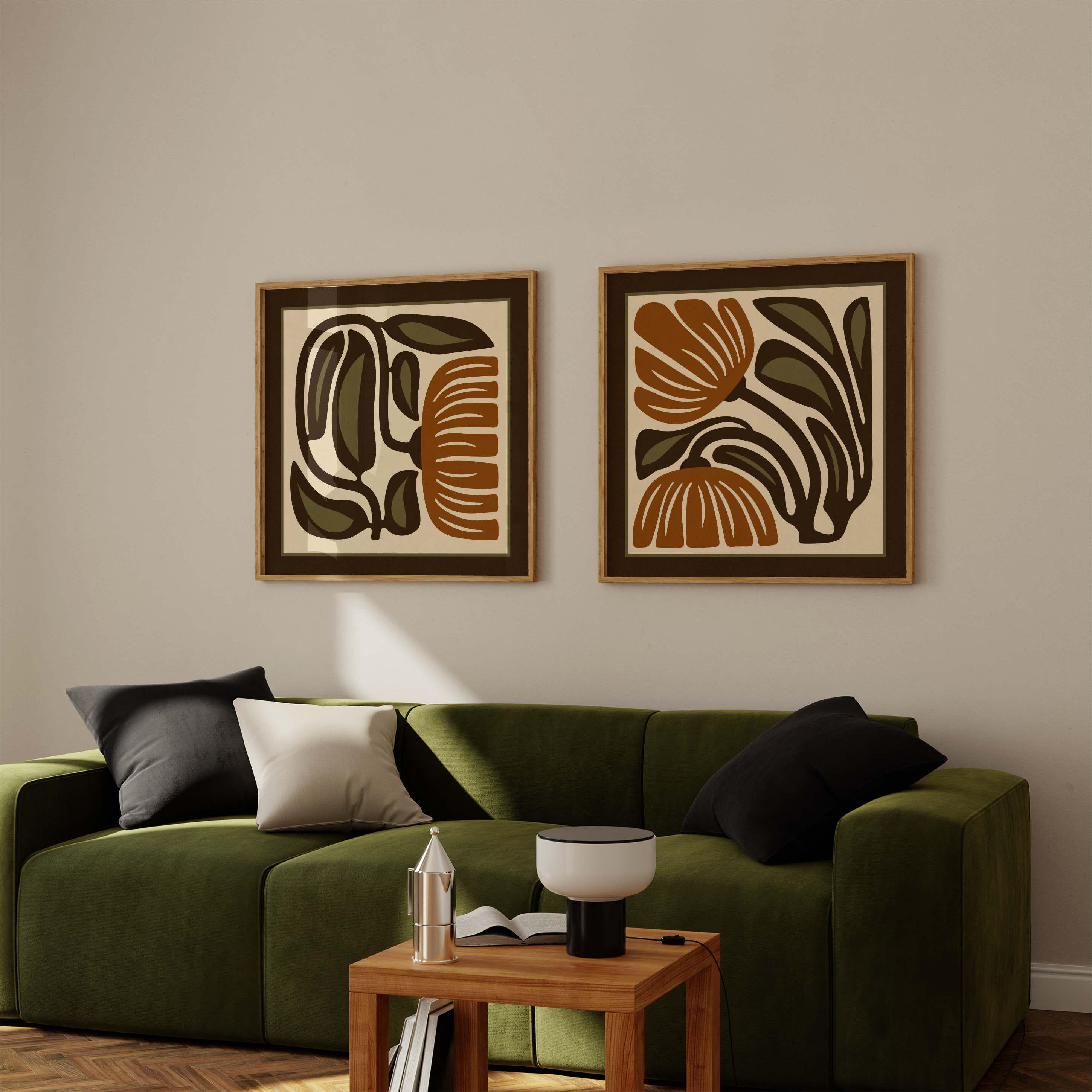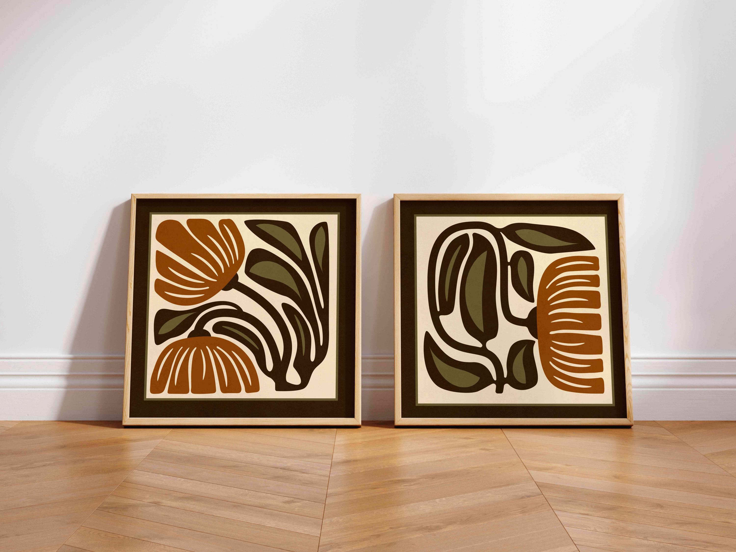 Abstract retro floral print set inspired by Matisse botanical shapes and groovy 70s design. This earthy flower duo features warm terracotta blooms, deep espresso brown leaves and olive green details layered over a soft cream background, and finished off with a dark brown border.