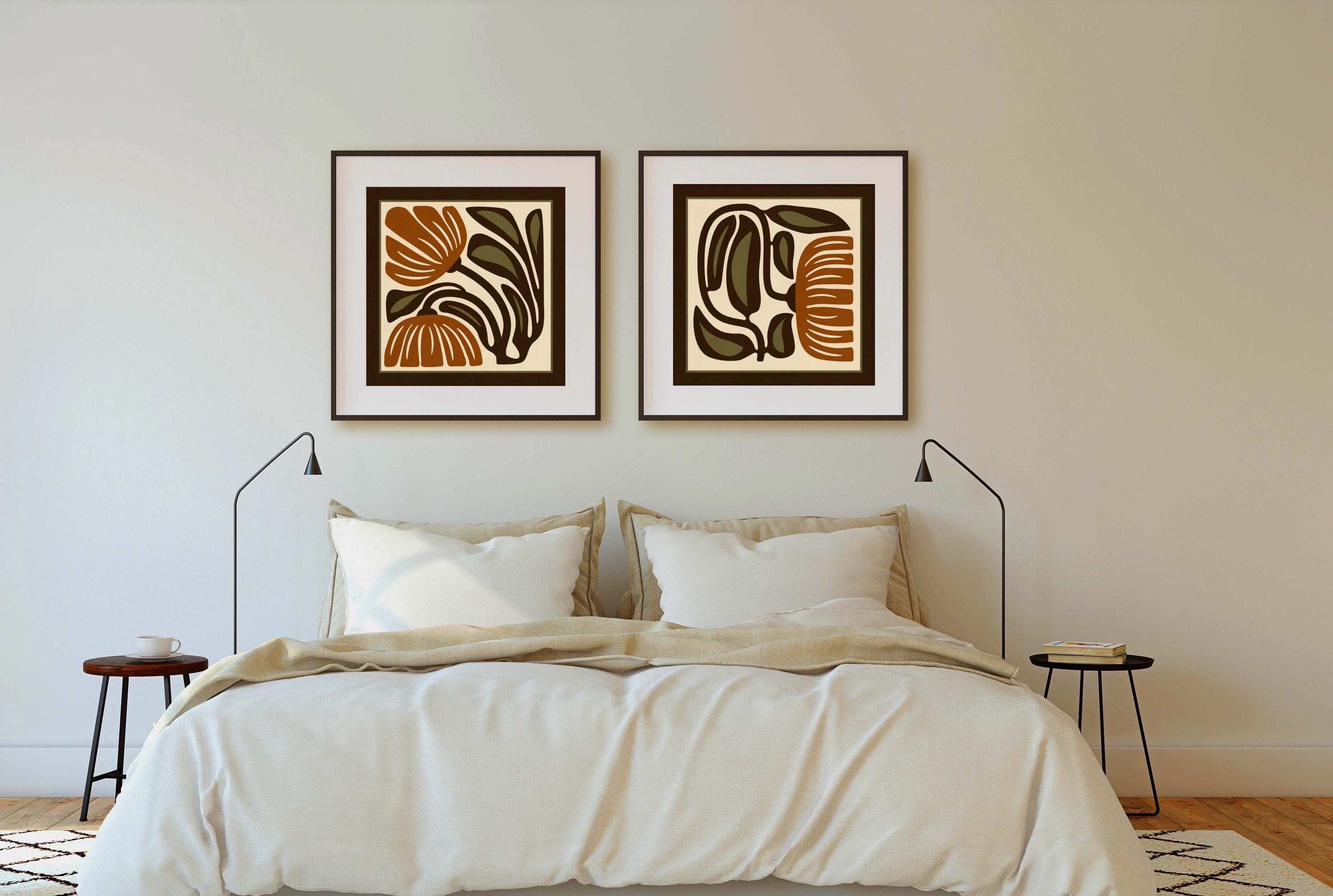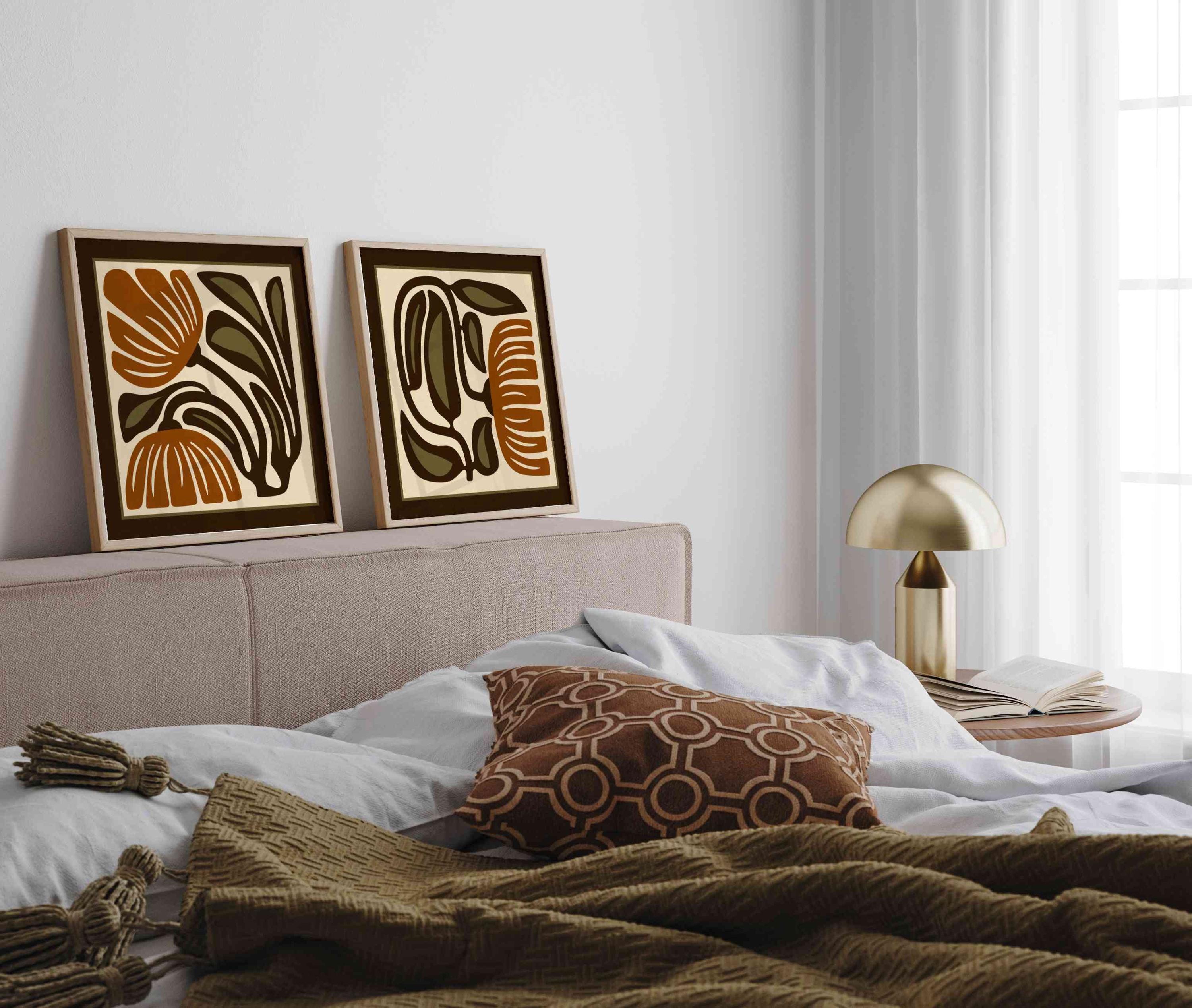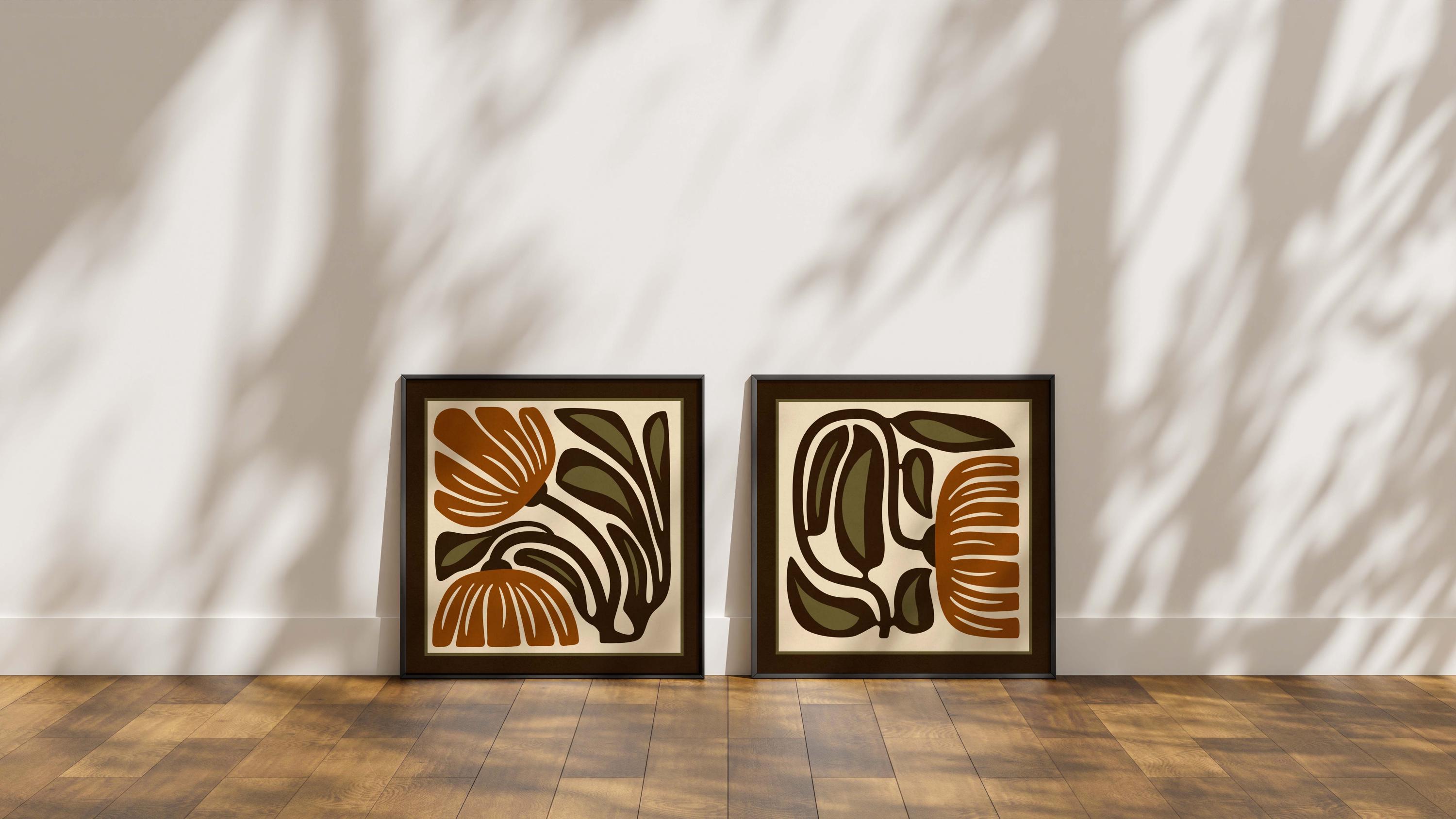 Abstract retro floral print set inspired by Matisse botanical shapes and groovy 70s design. This earthy flower duo features warm terracotta blooms, deep espresso brown leaves and olive green details layered over a soft cream background, and finished off with a dark brown border.