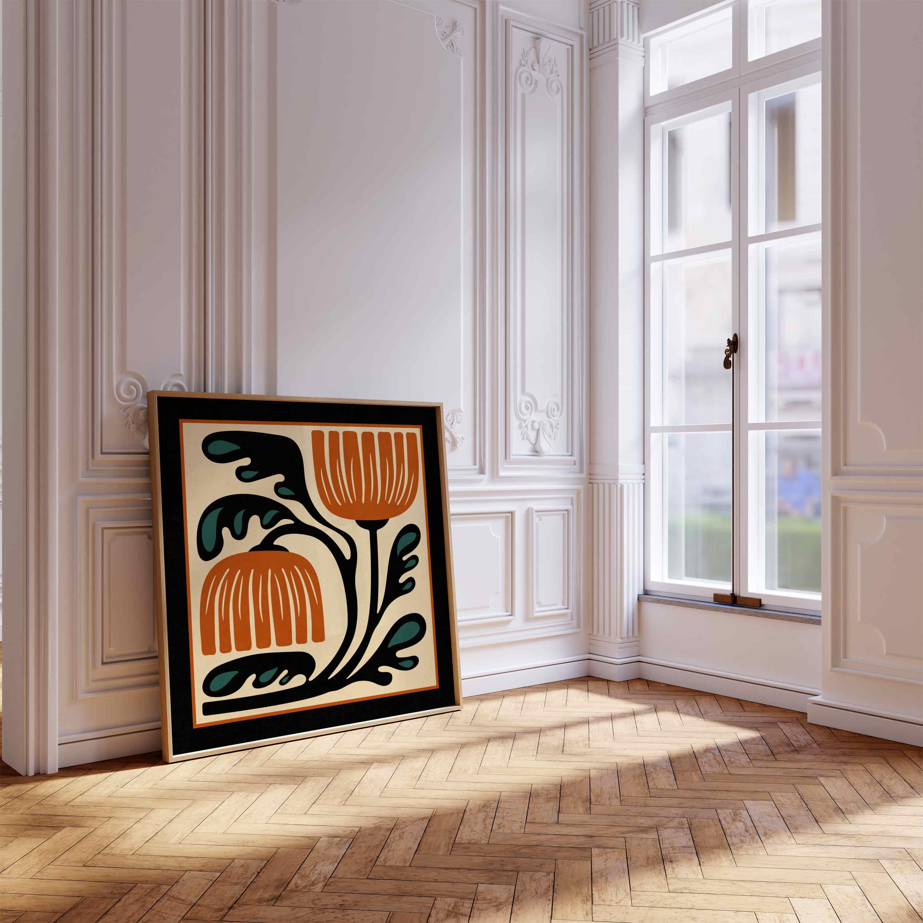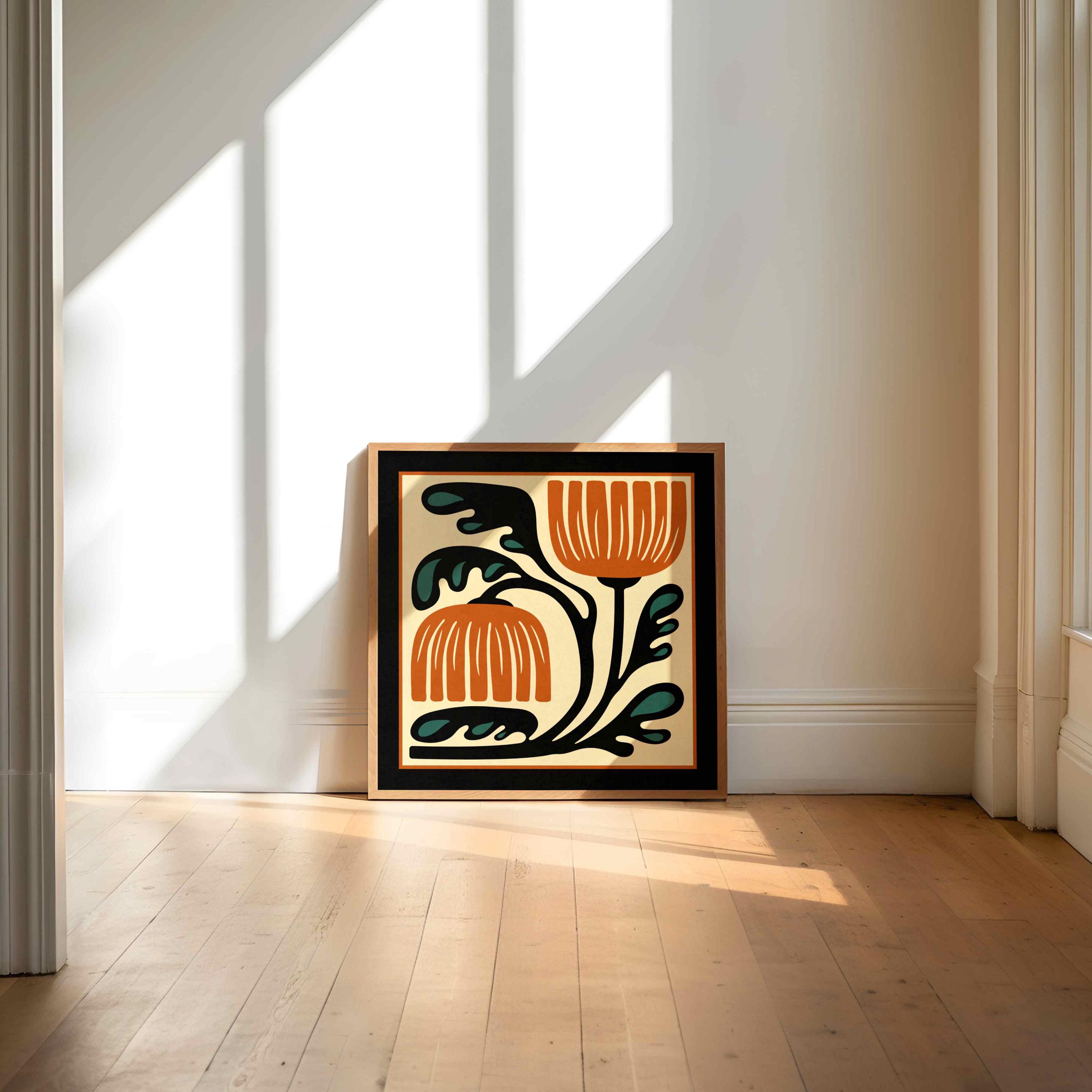This mid-century inspired floral print combines simple shapes, bold contrast, and a warm retro palette. The stylized botanical design gives the artwork a clean, modern look while keeping a vintage feel.