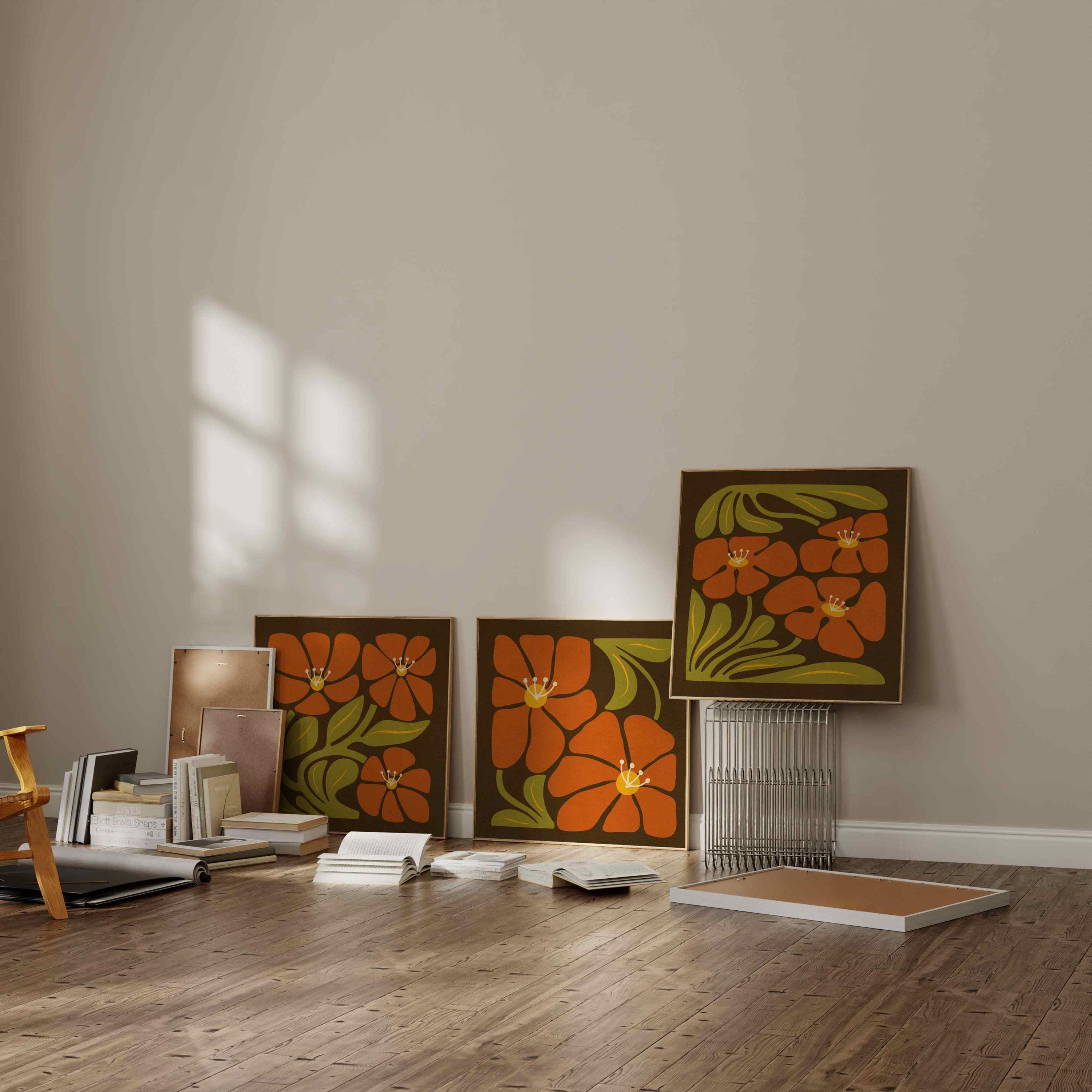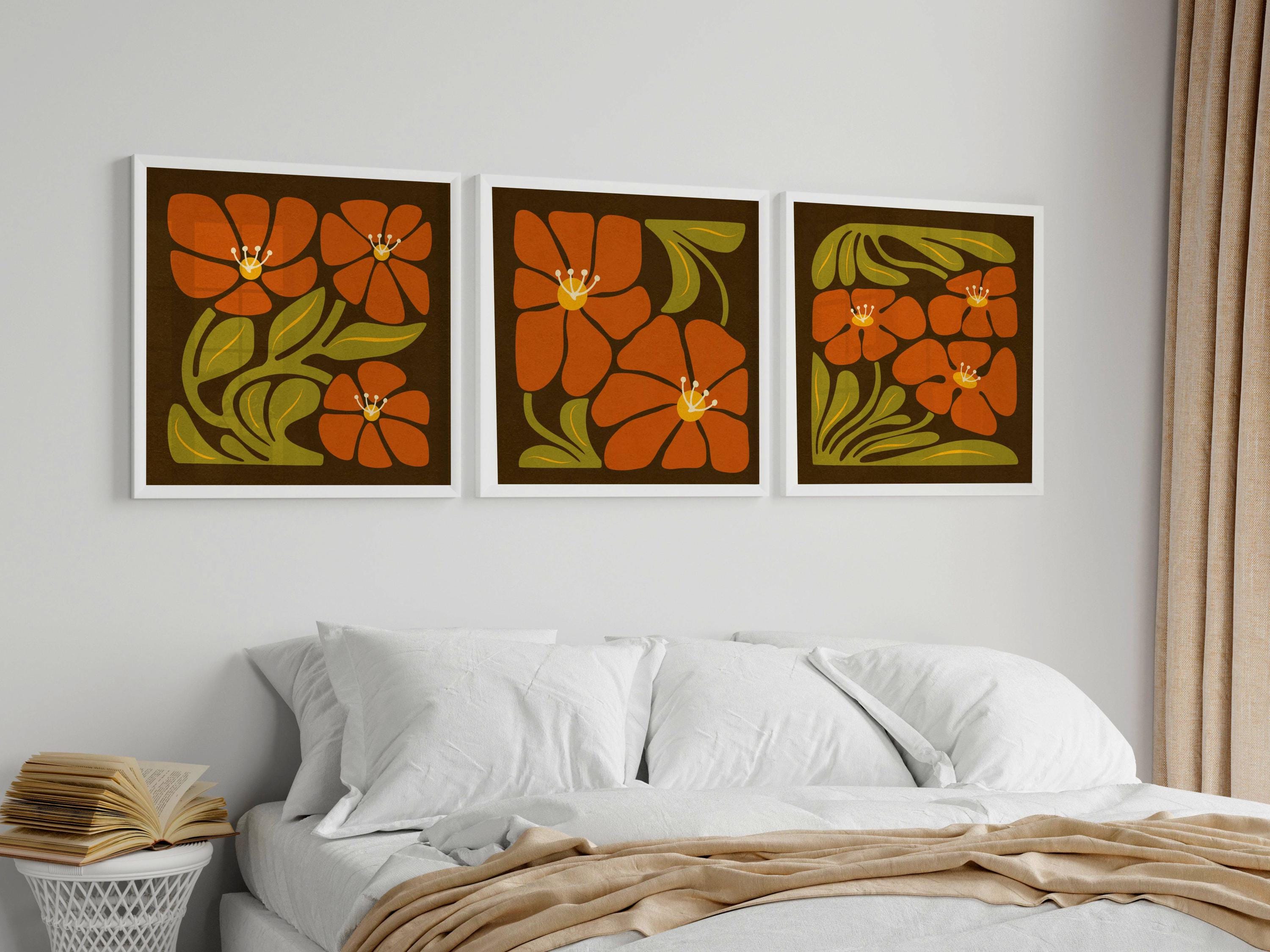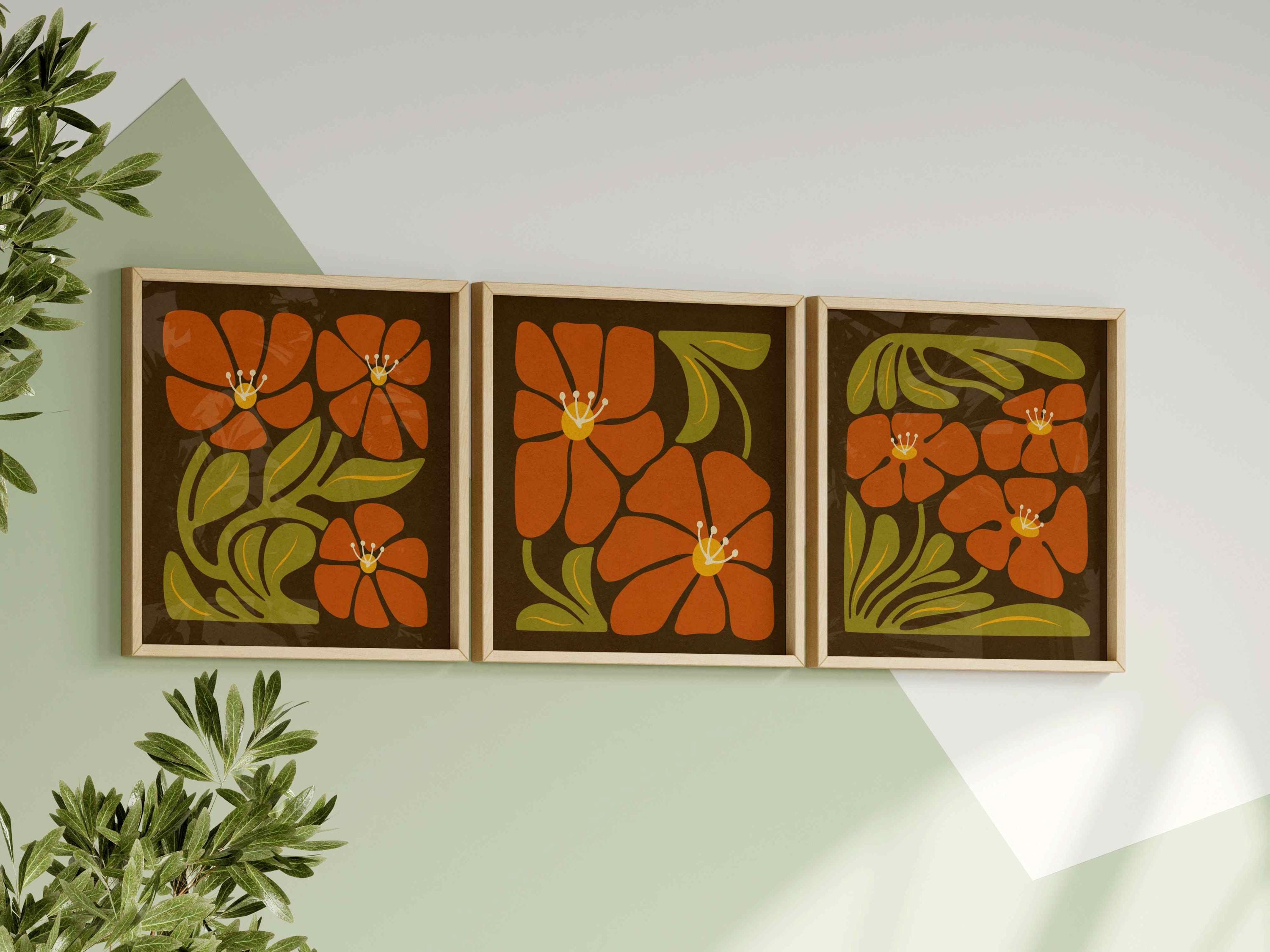 Framed retro floral print set featuring abstract Matisse-inspired botanical shapes in rich, nostalgic tones of mustard yellow, burnt orange-red, olive green, and cozy brown.