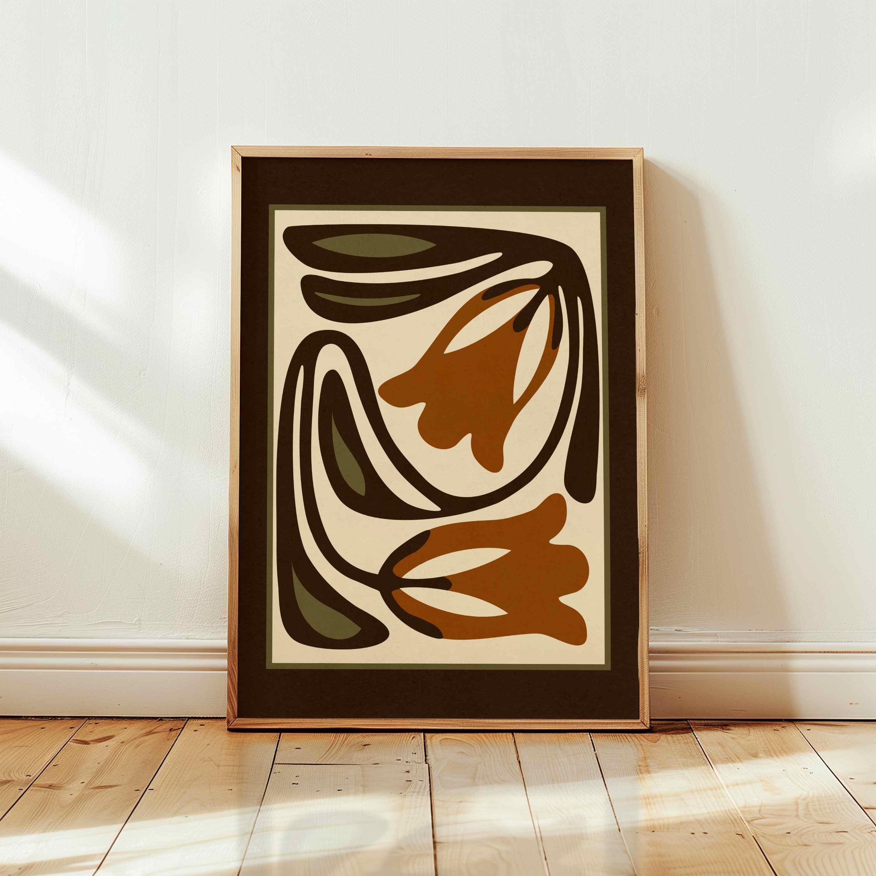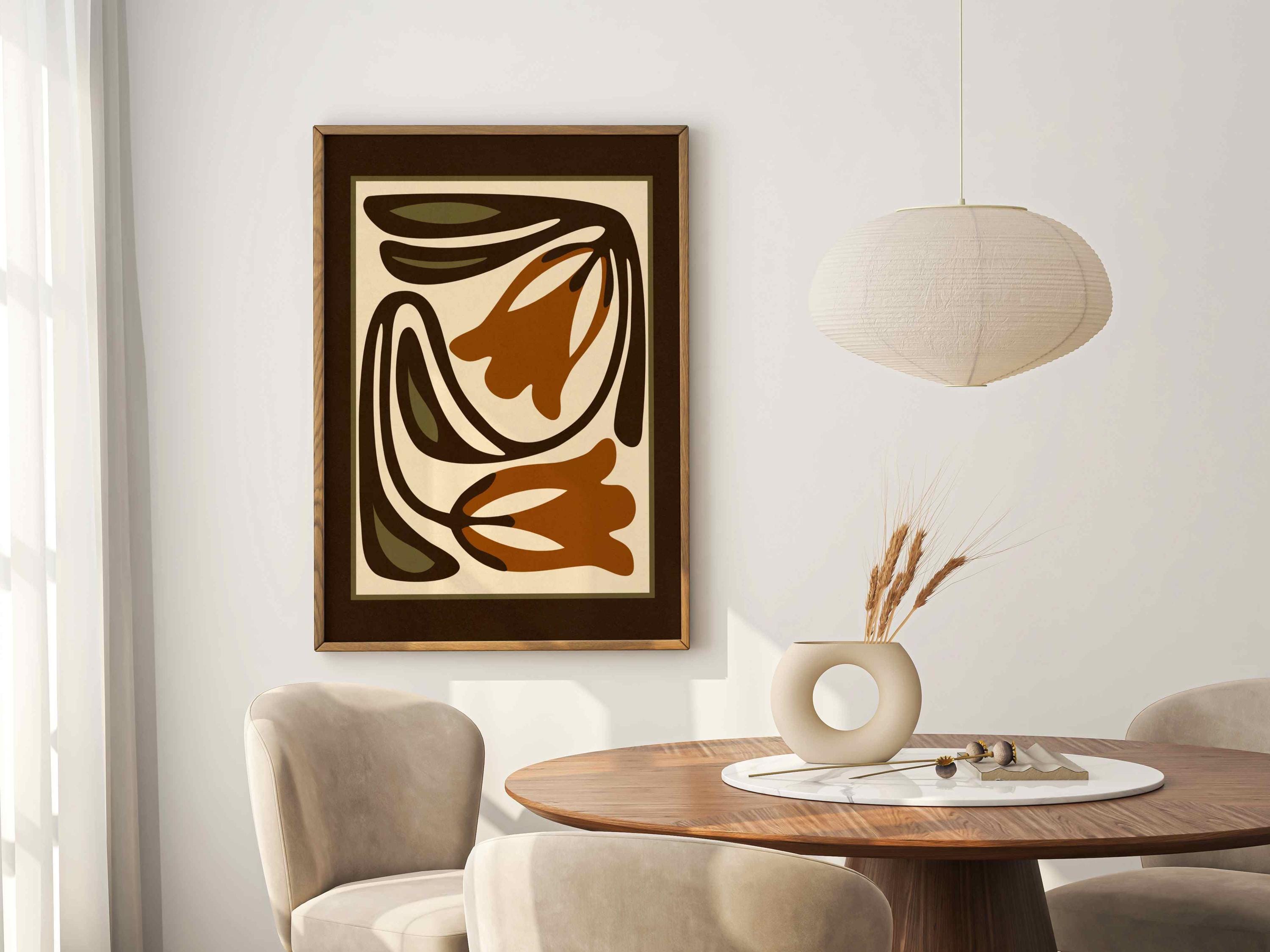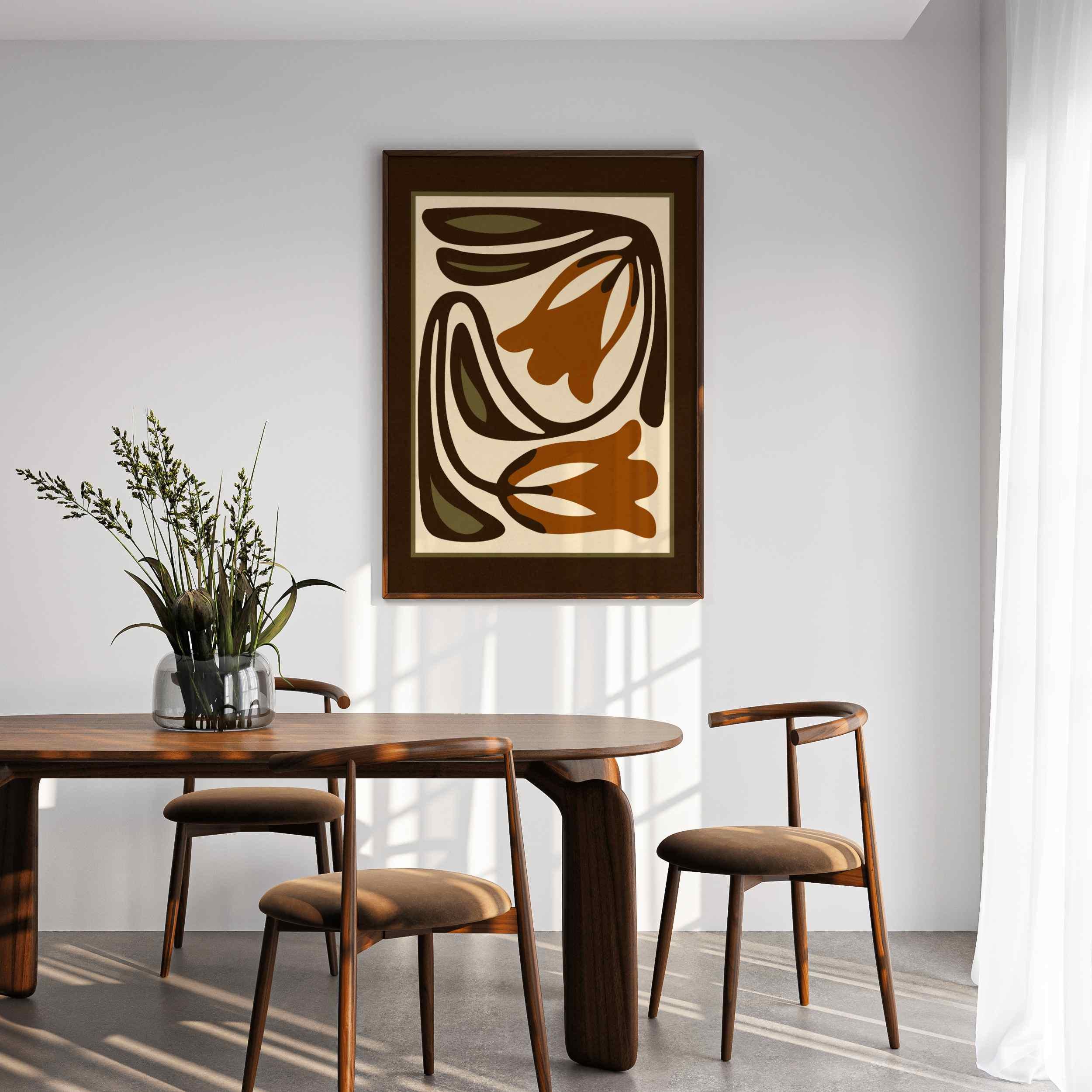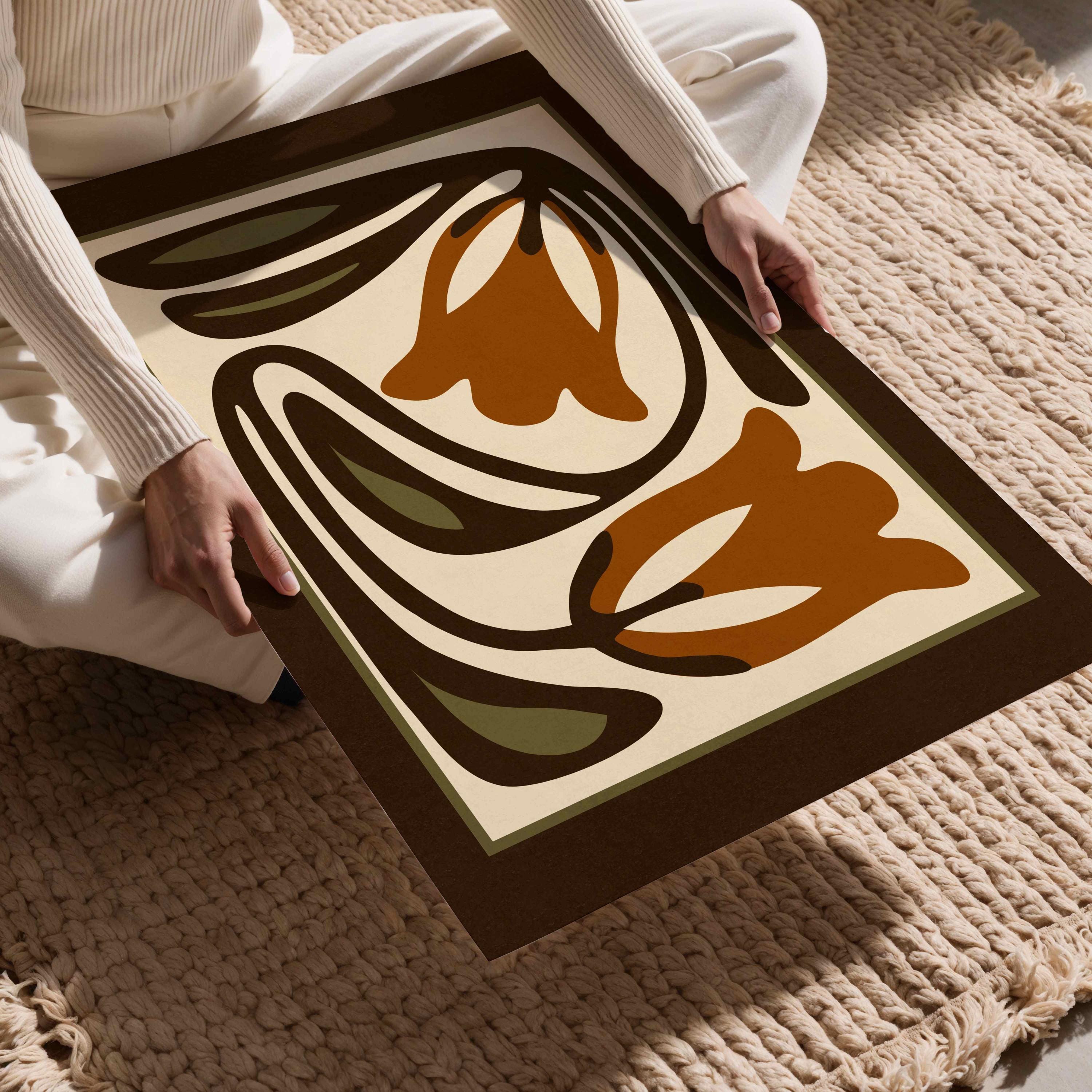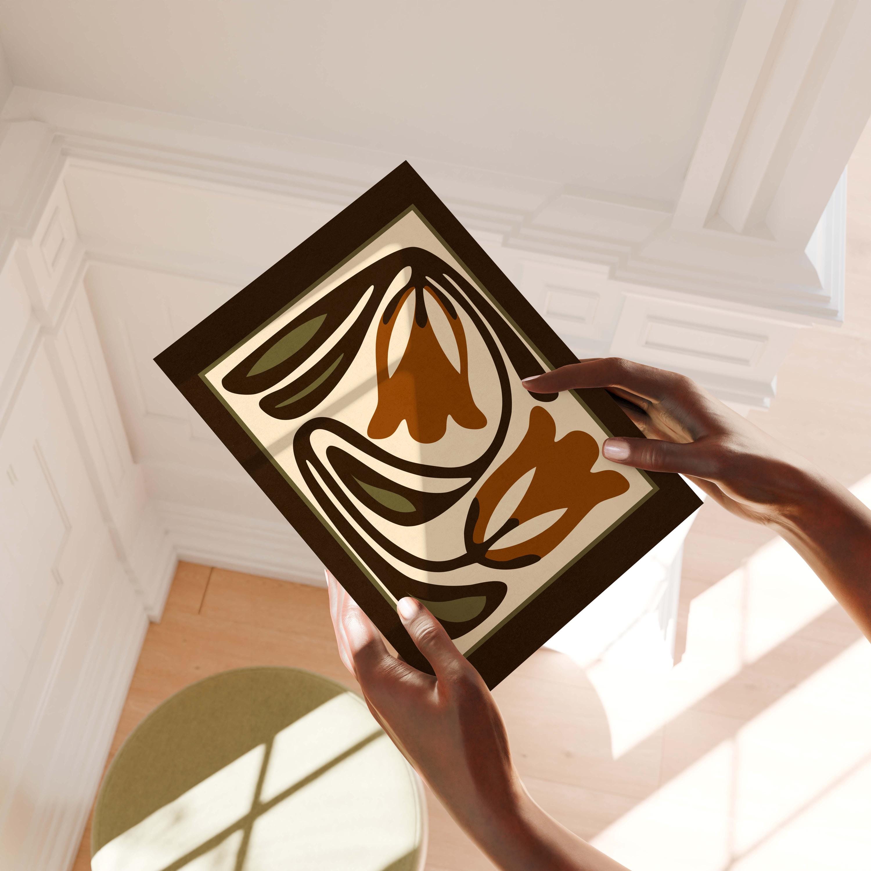 Mid-century inspired floral print combining simple shapes, bold contrast, and an earthy color palette of warm terracotta, deep espresso, olive green and soft cream. The stylized botanical design gives the artwork a clean, modern look while keeping a vintage feel.