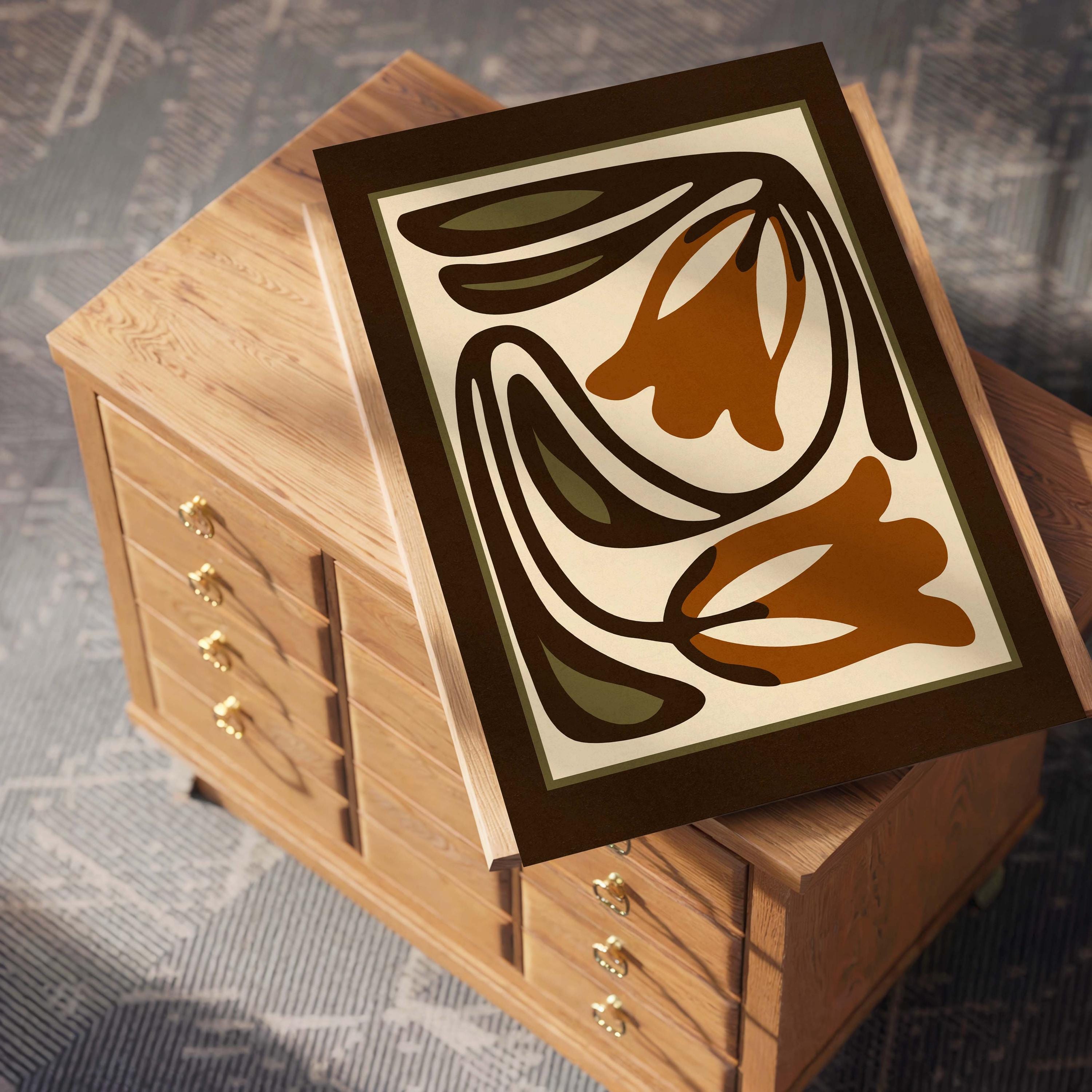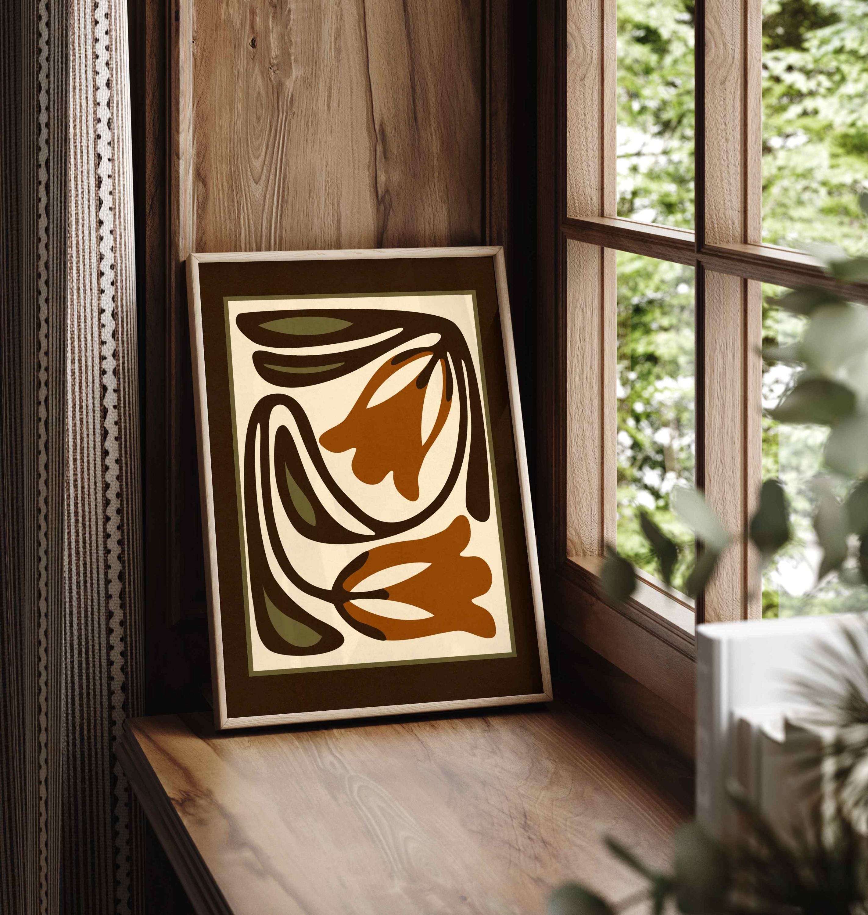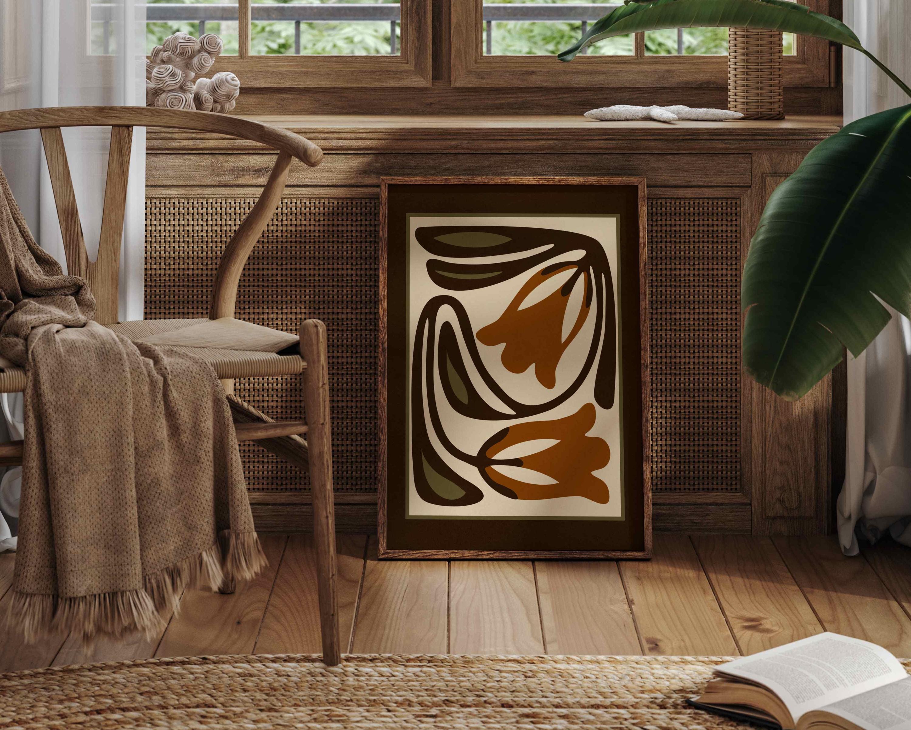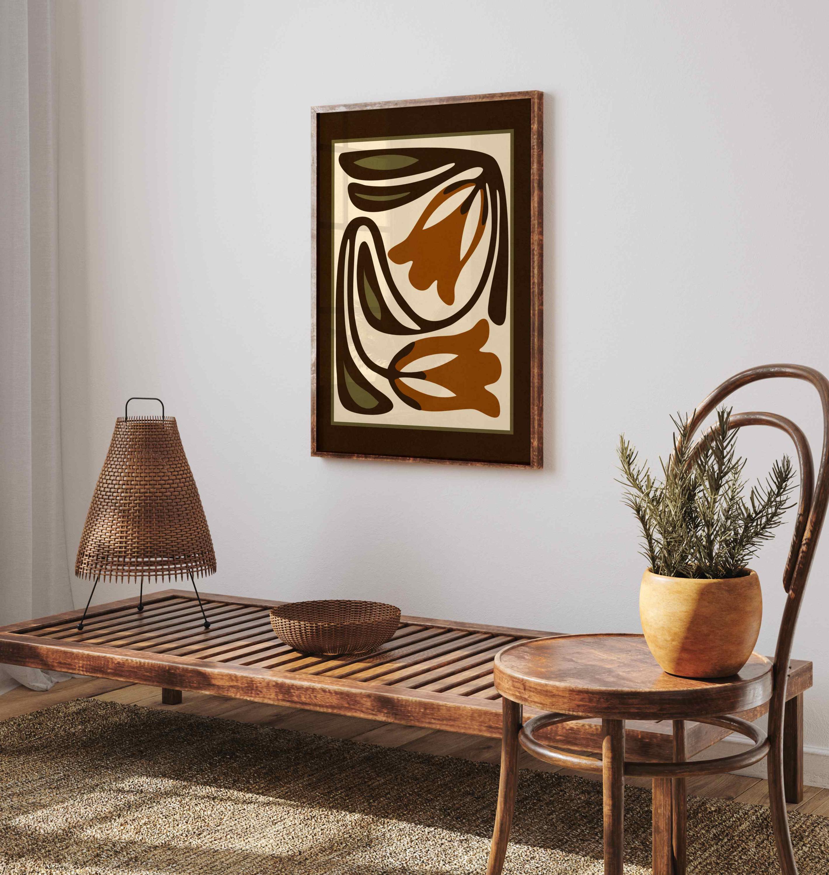 Mid-century inspired floral print combining simple shapes, bold contrast, and an earthy color palette of warm terracotta, deep espresso, olive green and soft cream. The stylized botanical design gives the artwork a clean, modern look while keeping a vintage feel.