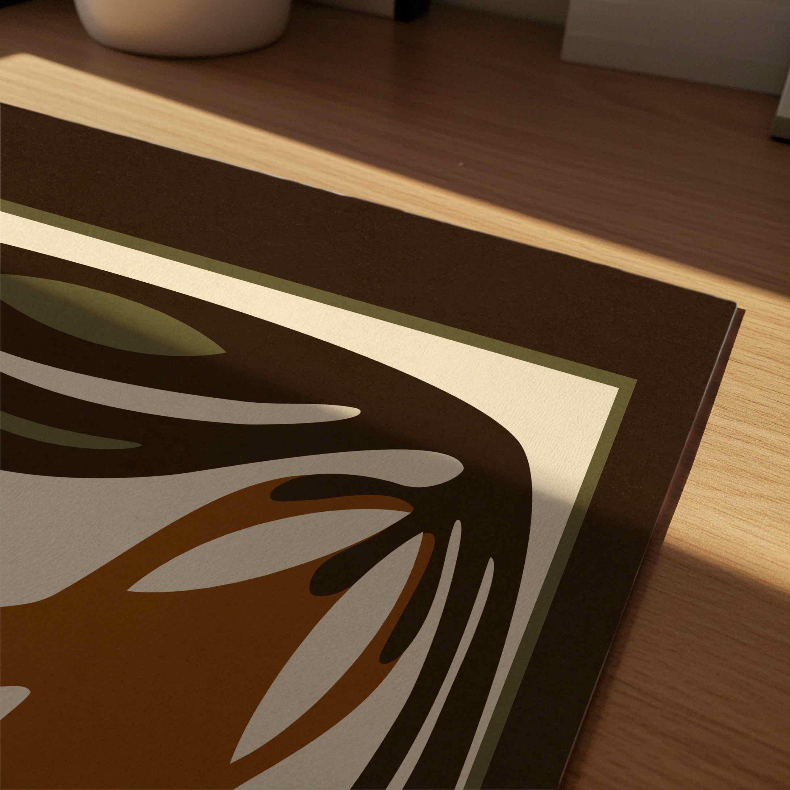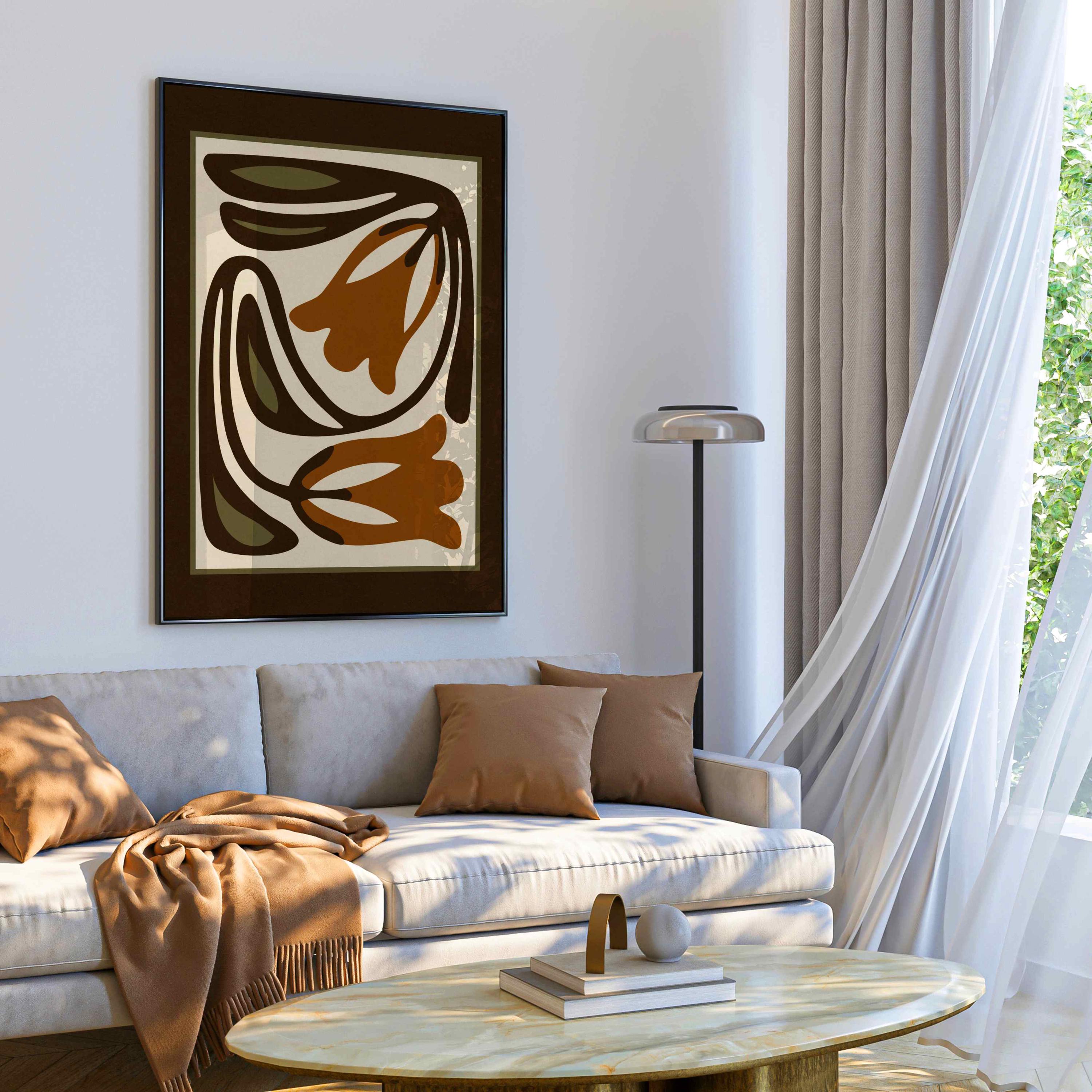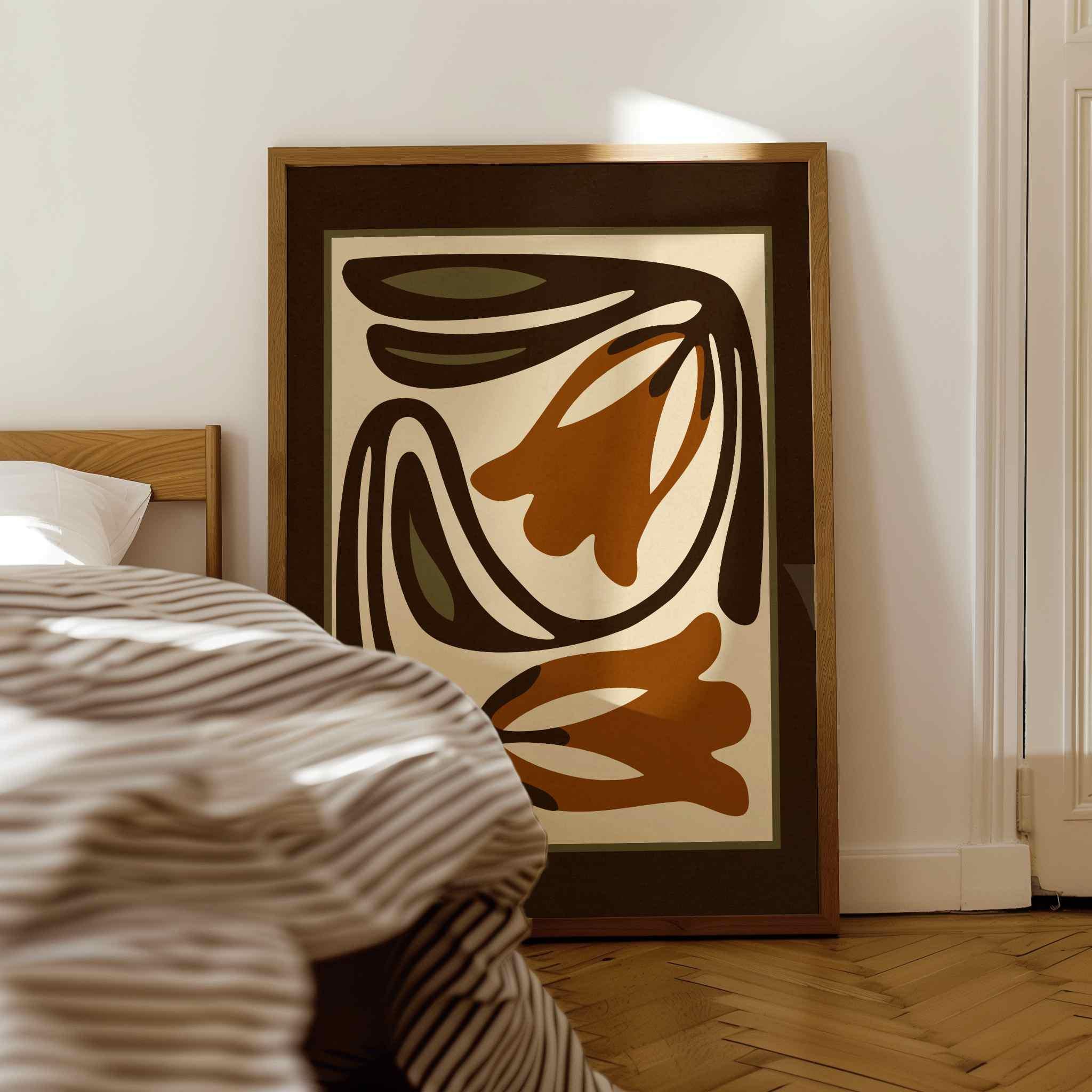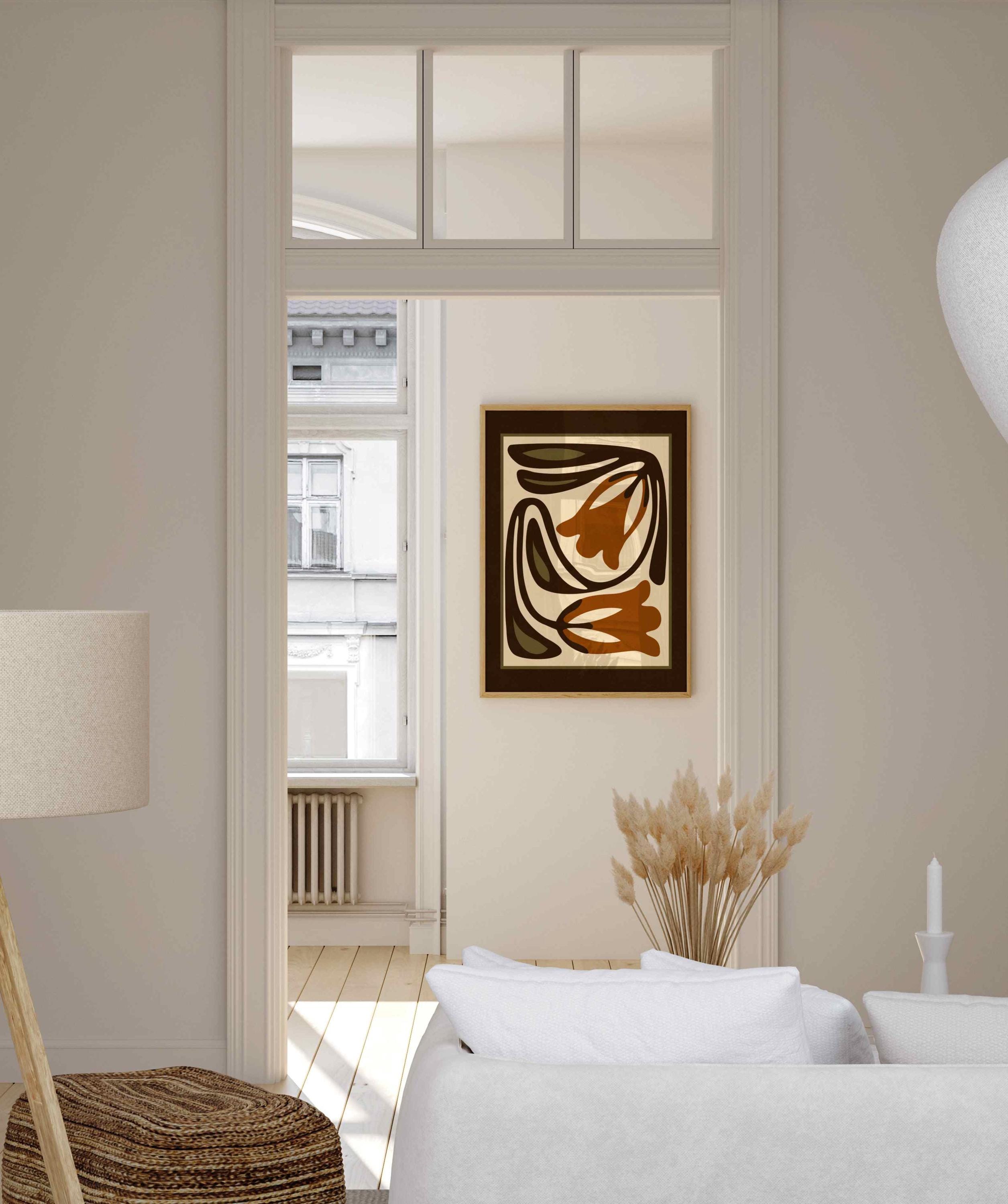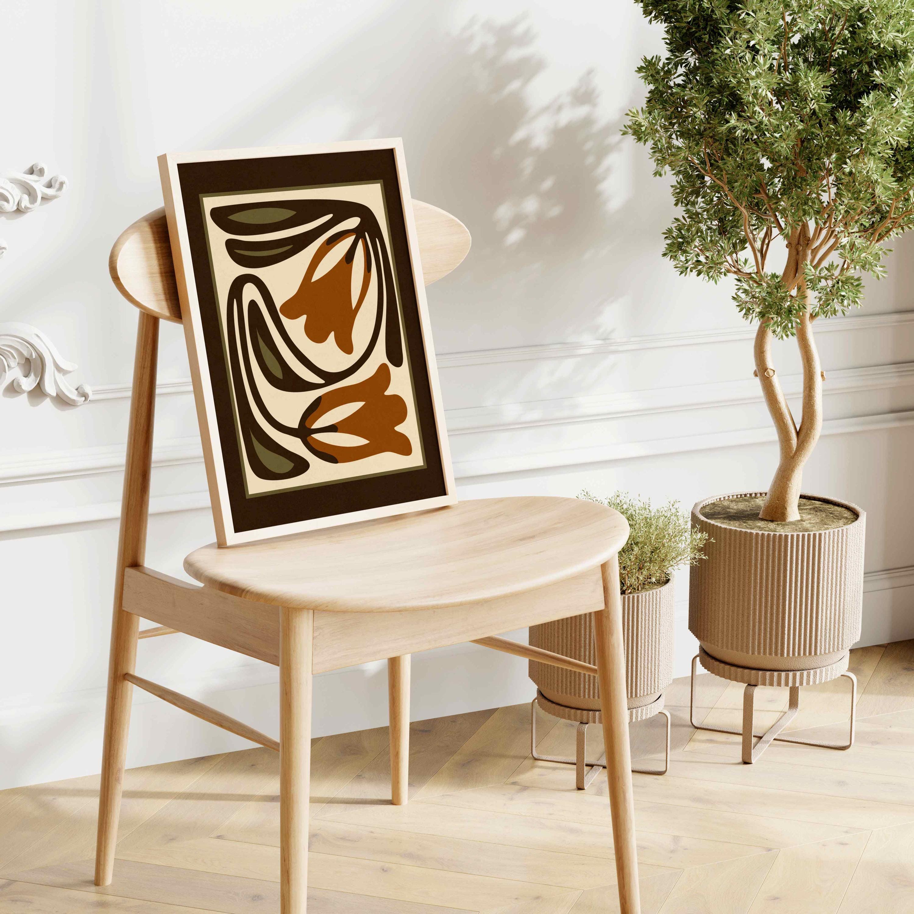 Mid-century inspired floral print combining simple shapes, bold contrast, and an earthy color palette of warm terracotta, deep espresso, olive green and soft cream. The stylized botanical design gives the artwork a clean, modern look while keeping a vintage feel.