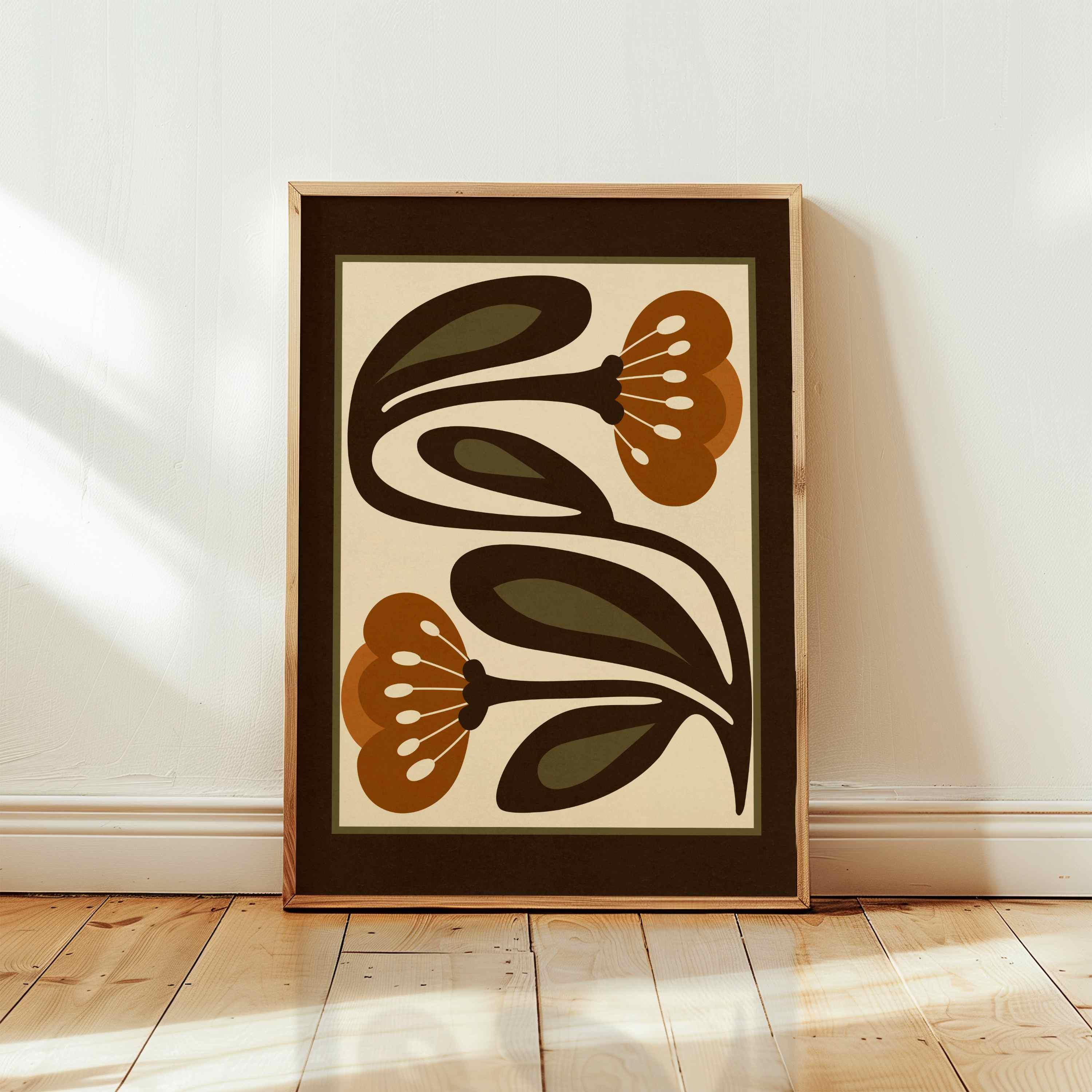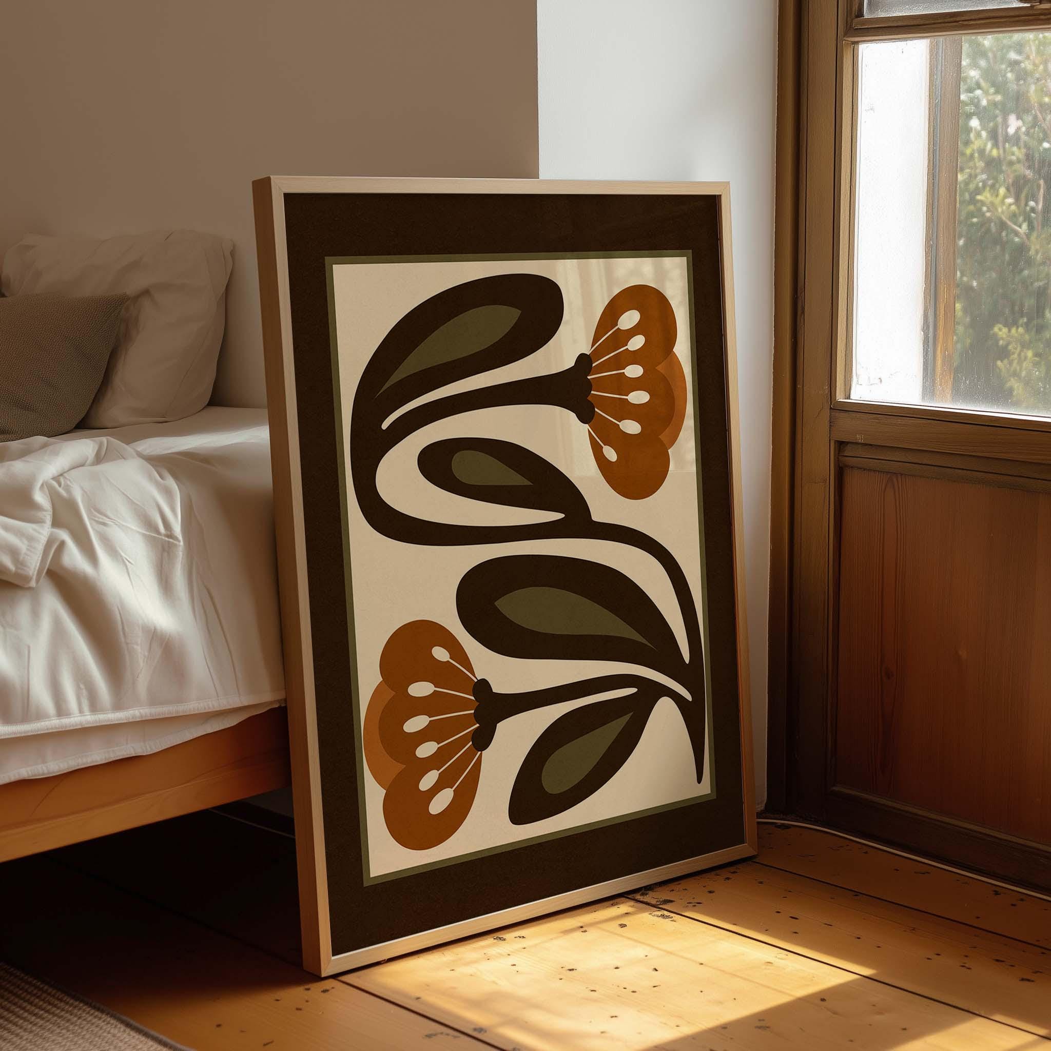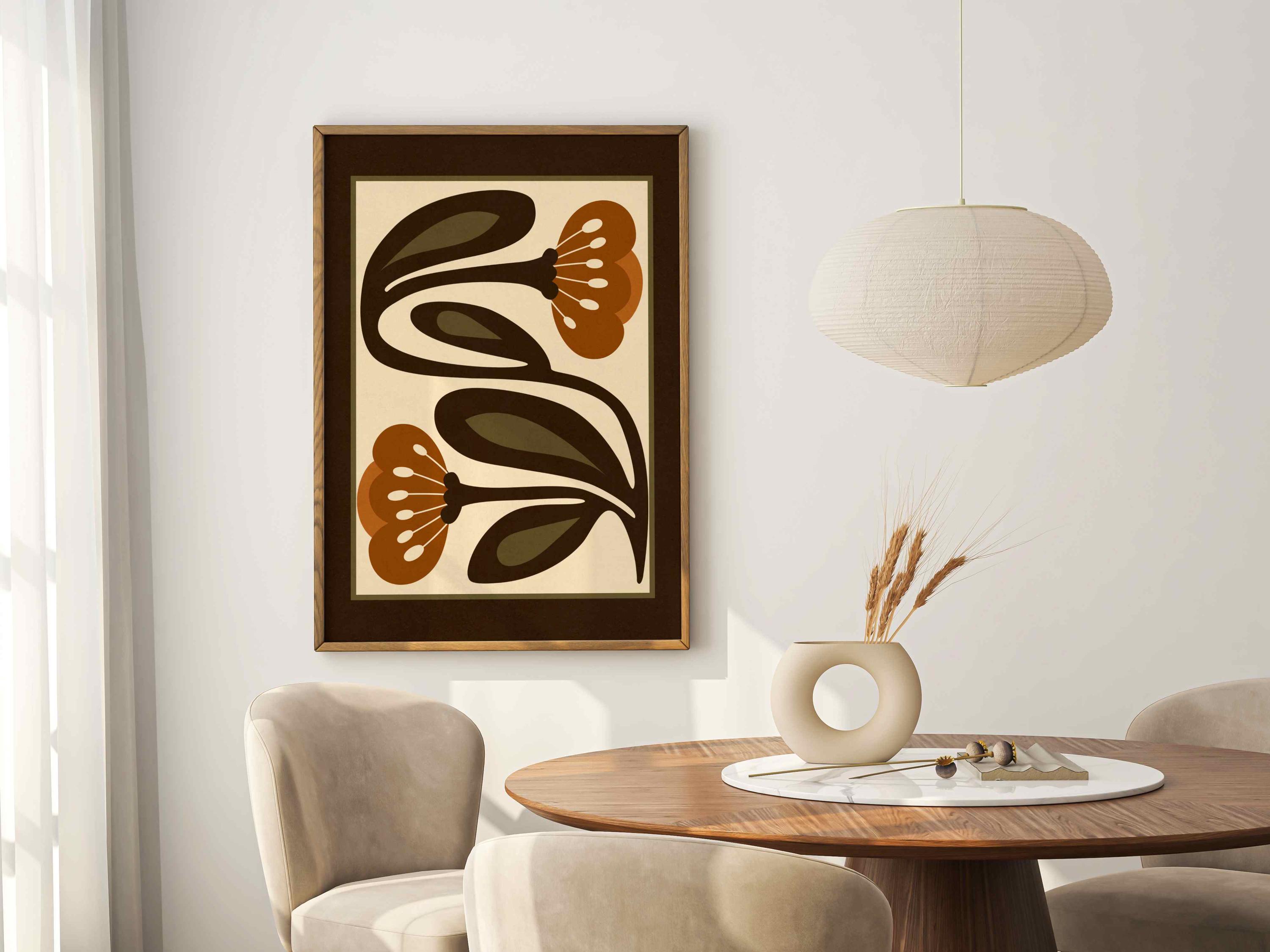 Retro floral print featuring stylized flowers and leaves in an earthy color palette of warm terracotta, deep espresso, olive green and soft cream. This piece blends retro botanical style, Scandinavian folk art and mid century modern design, creating a look that’s both earthy and bold. Perfect for living rooms, kitchens, bedrooms, or gallery walls, it brings a stylish vibe into any modern boho or vintage-inspired space.