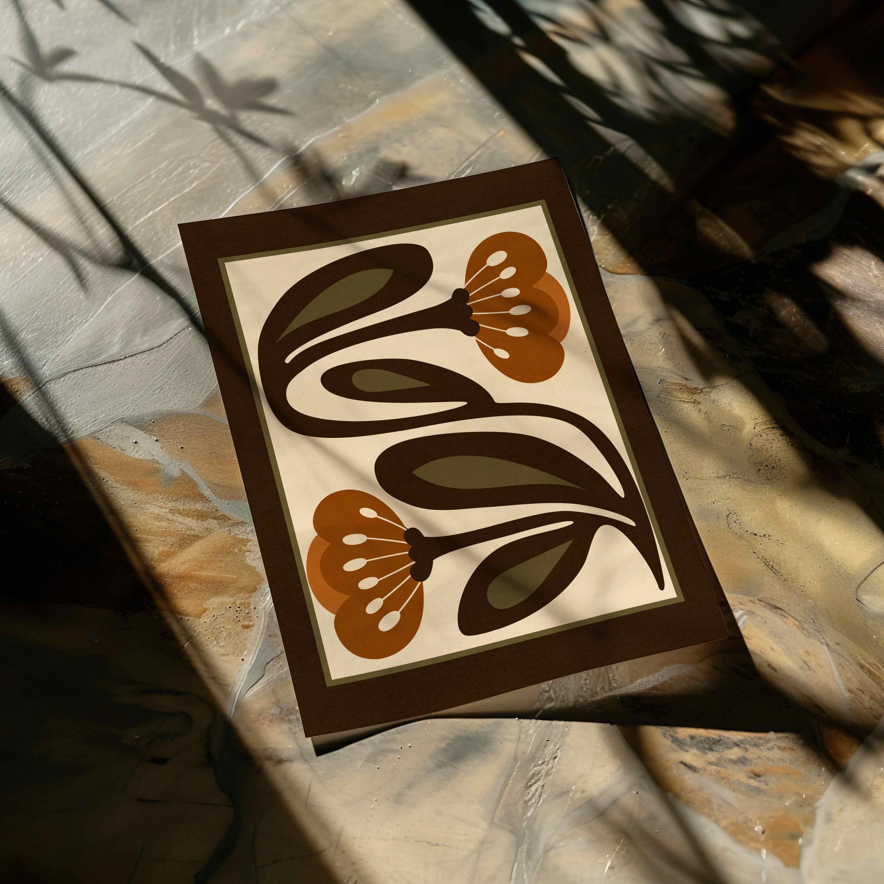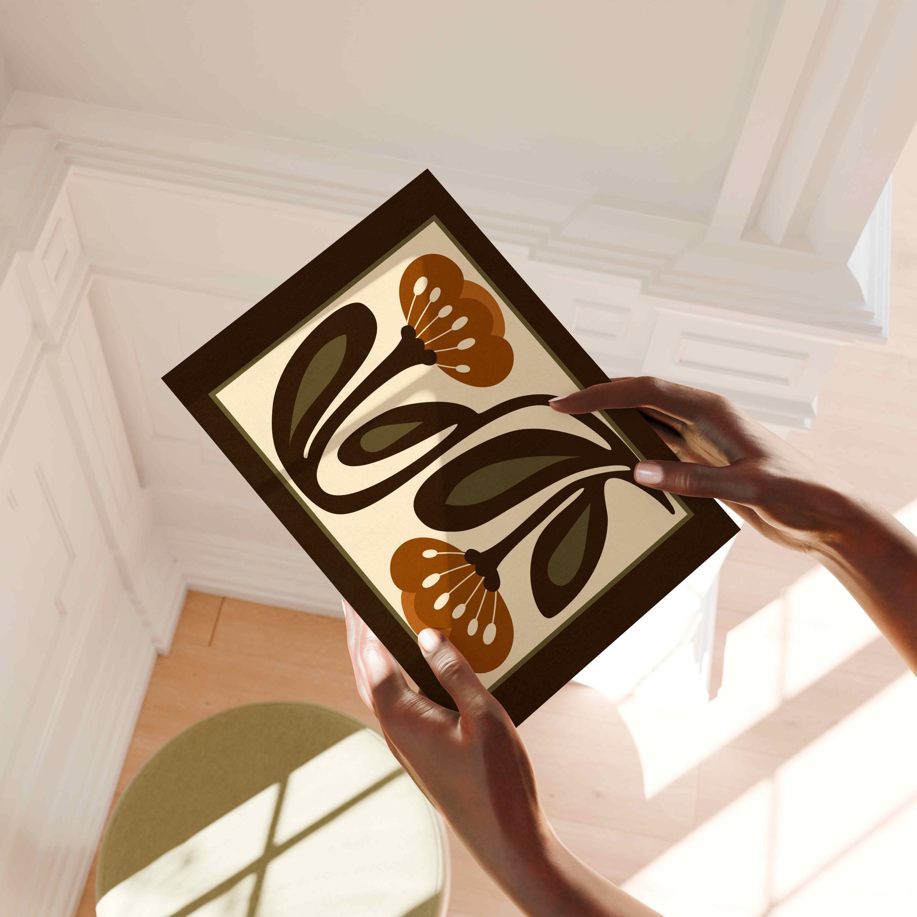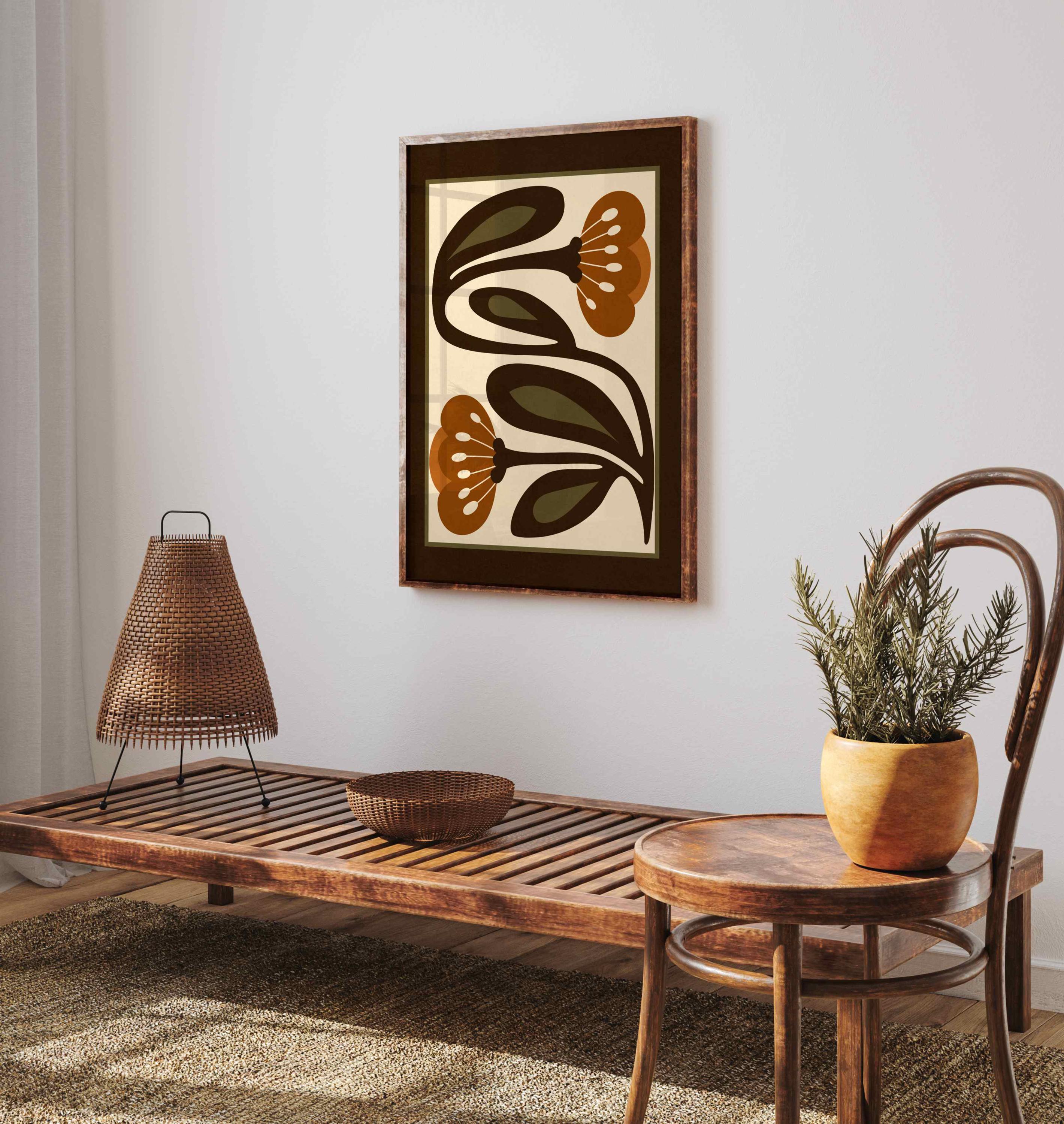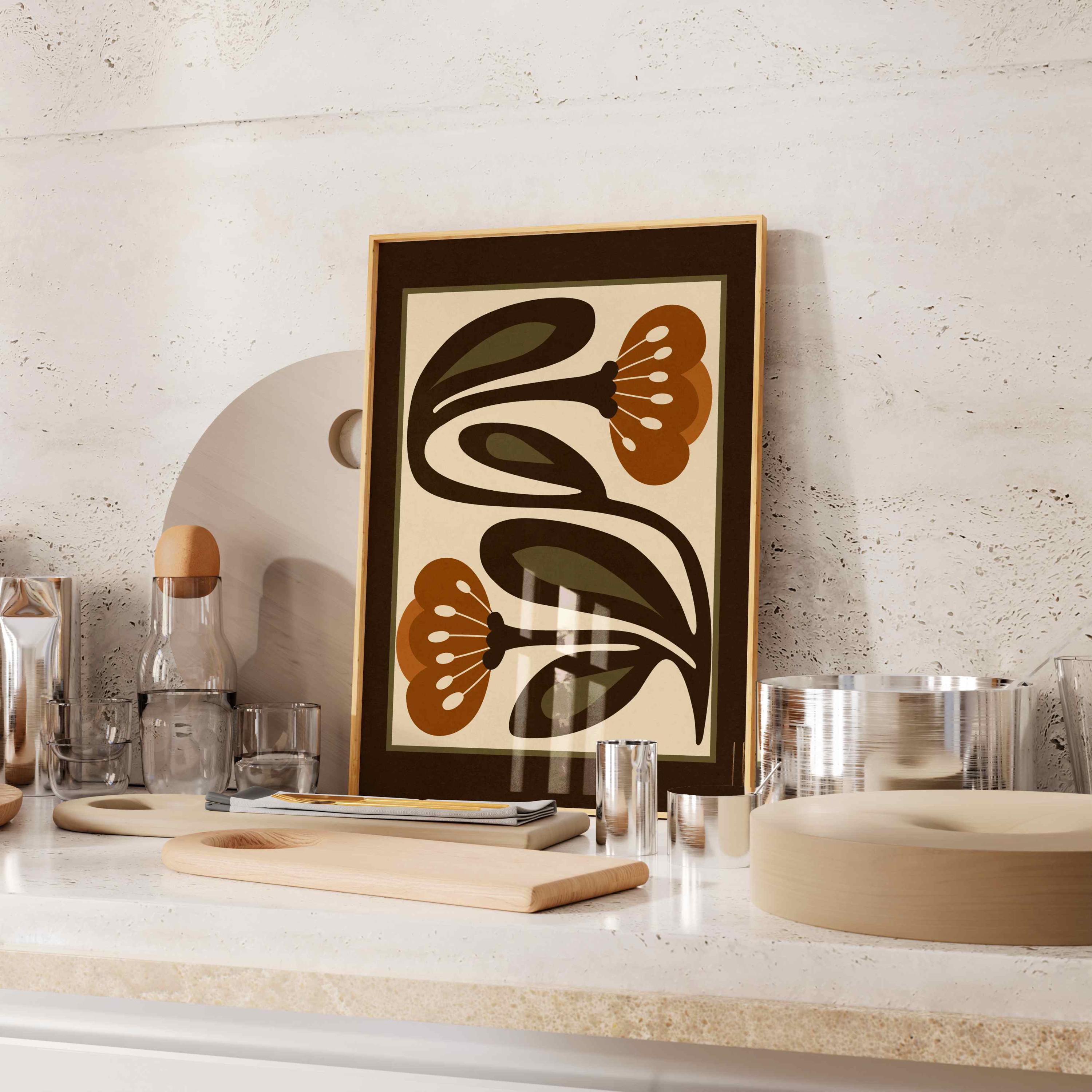 Retro floral print featuring stylized flowers and leaves in an earthy color palette of warm terracotta, deep espresso, olive green and soft cream. This piece blends retro botanical style, Scandinavian folk art and mid century modern design, creating a look that’s both earthy and bold. Perfect for living rooms, kitchens, bedrooms, or gallery walls, it brings a stylish vibe into any modern boho or vintage-inspired space.