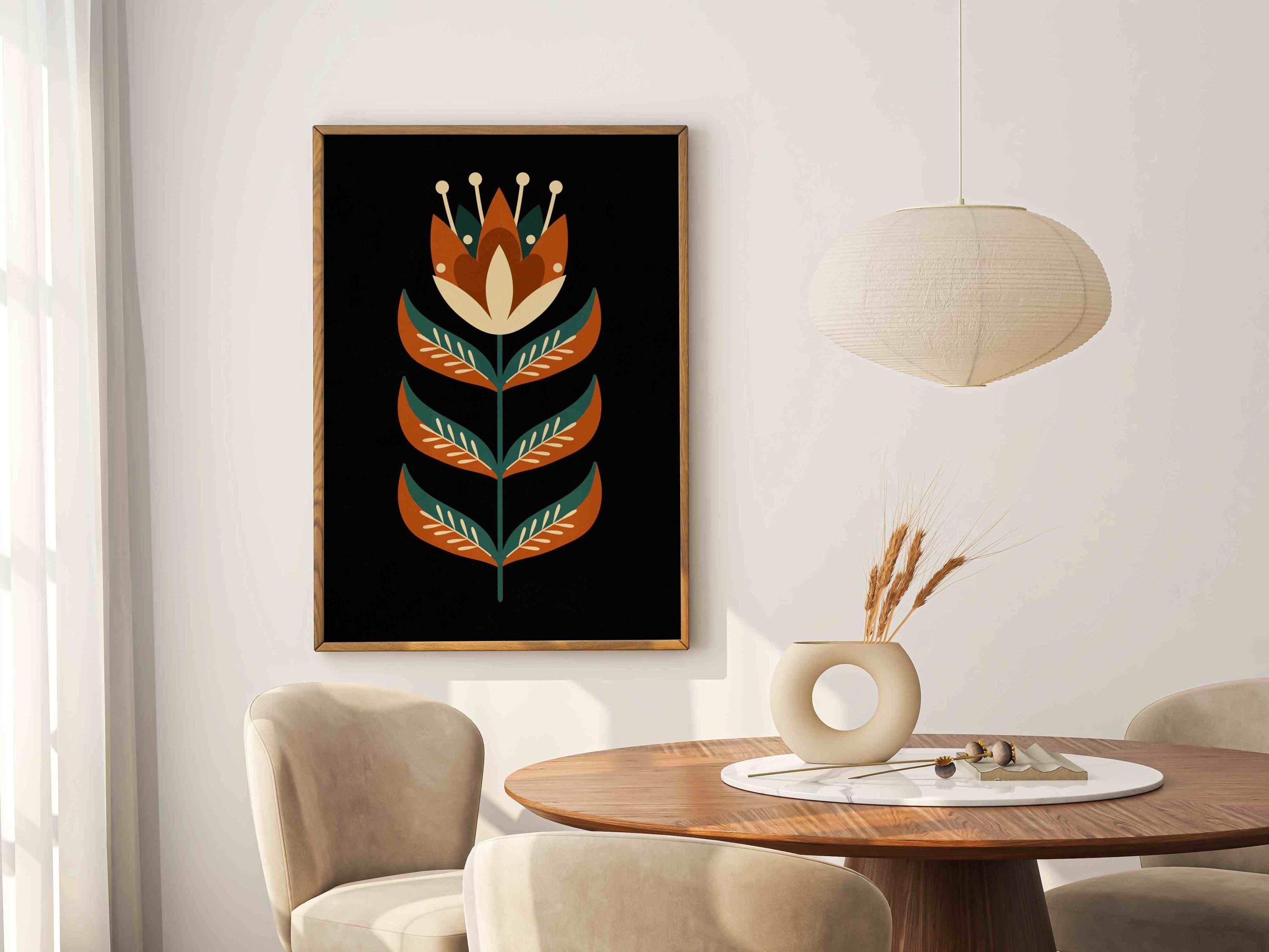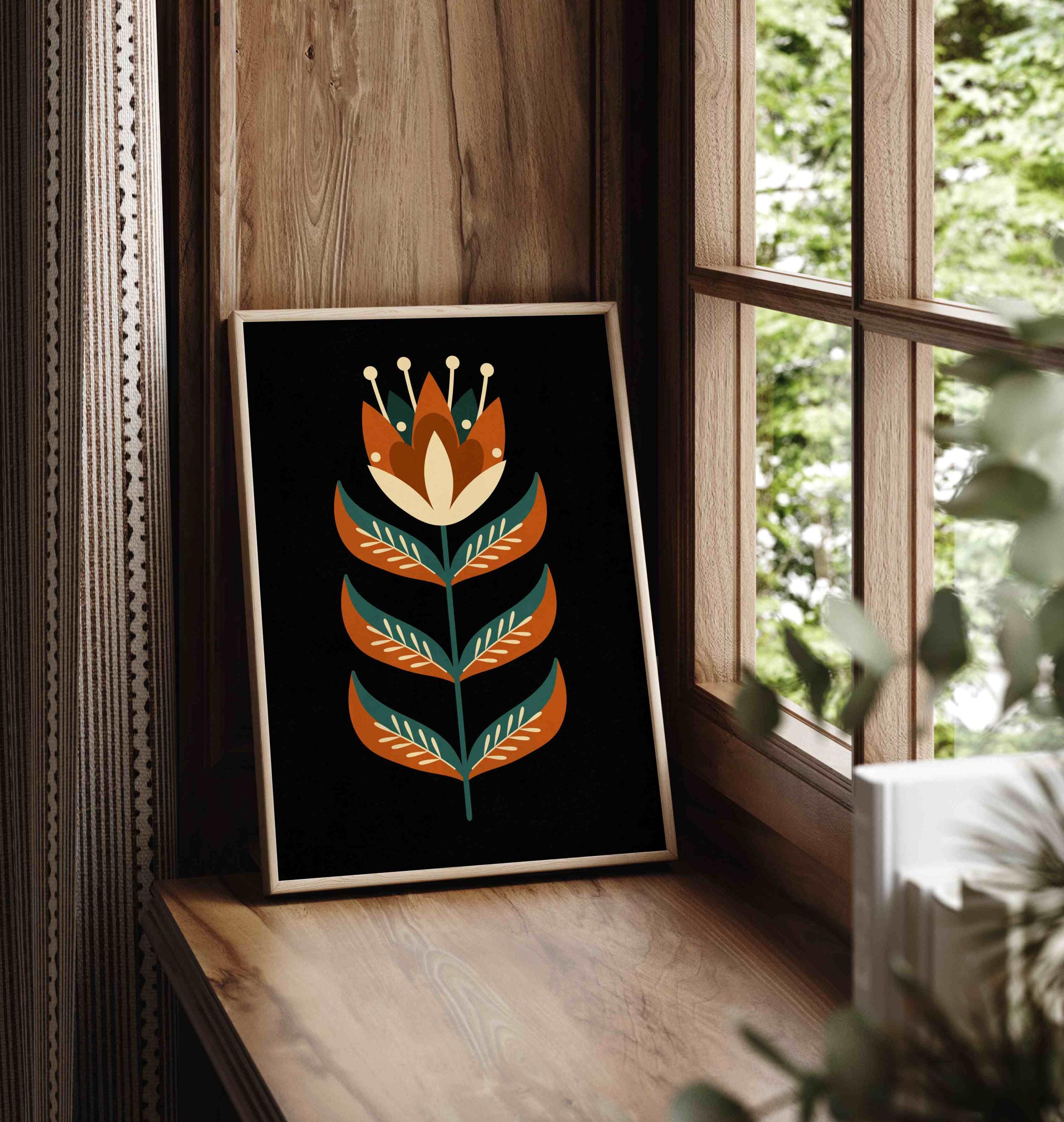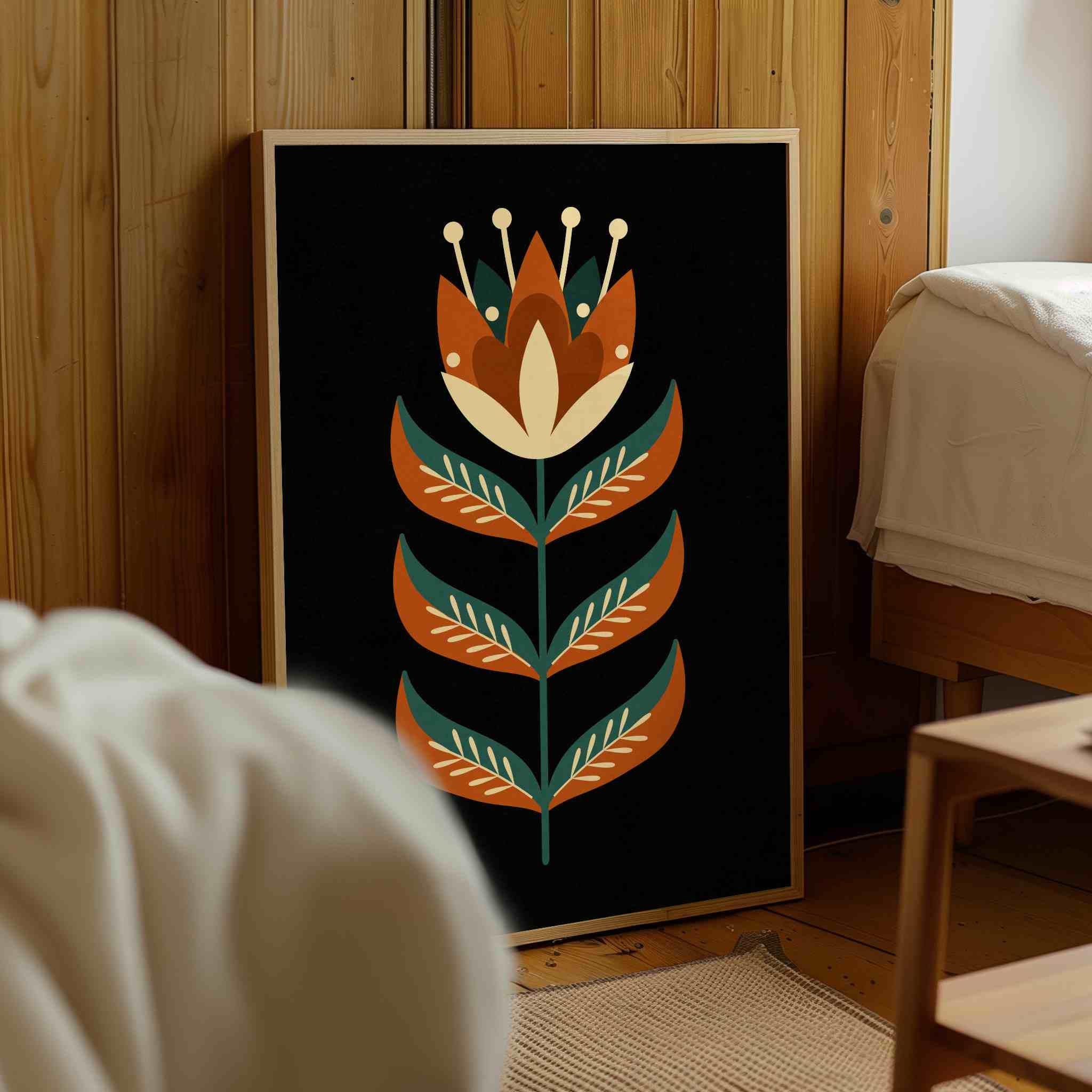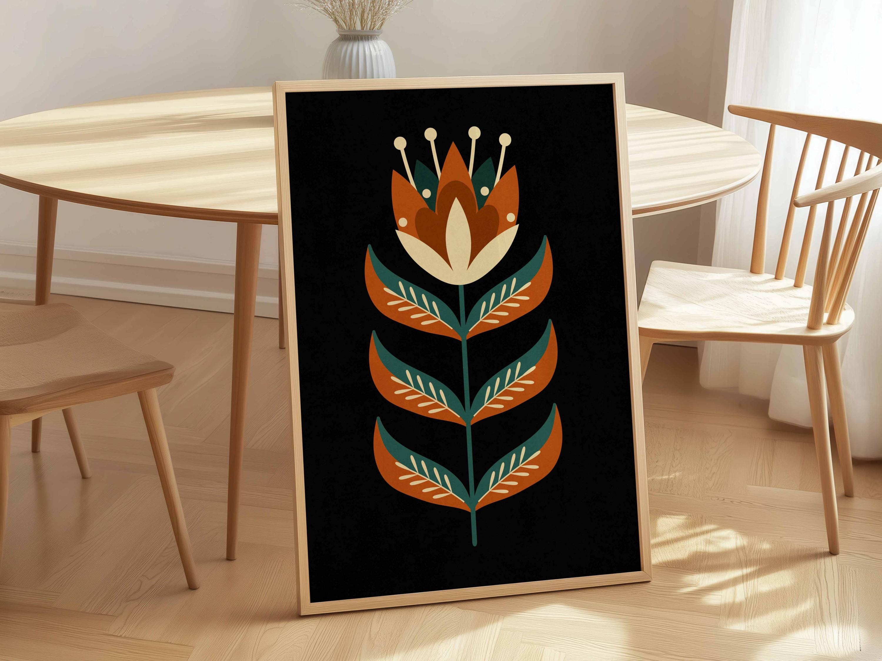 Stylized floral print inspired by Scandinavian folk art and mid-century modern aesthetics. Featuring bold geometric shapes and warm retro tones against a deep background, this piece is perfect for Nordic, mid-century modern, or vintage-inspired interiors.
