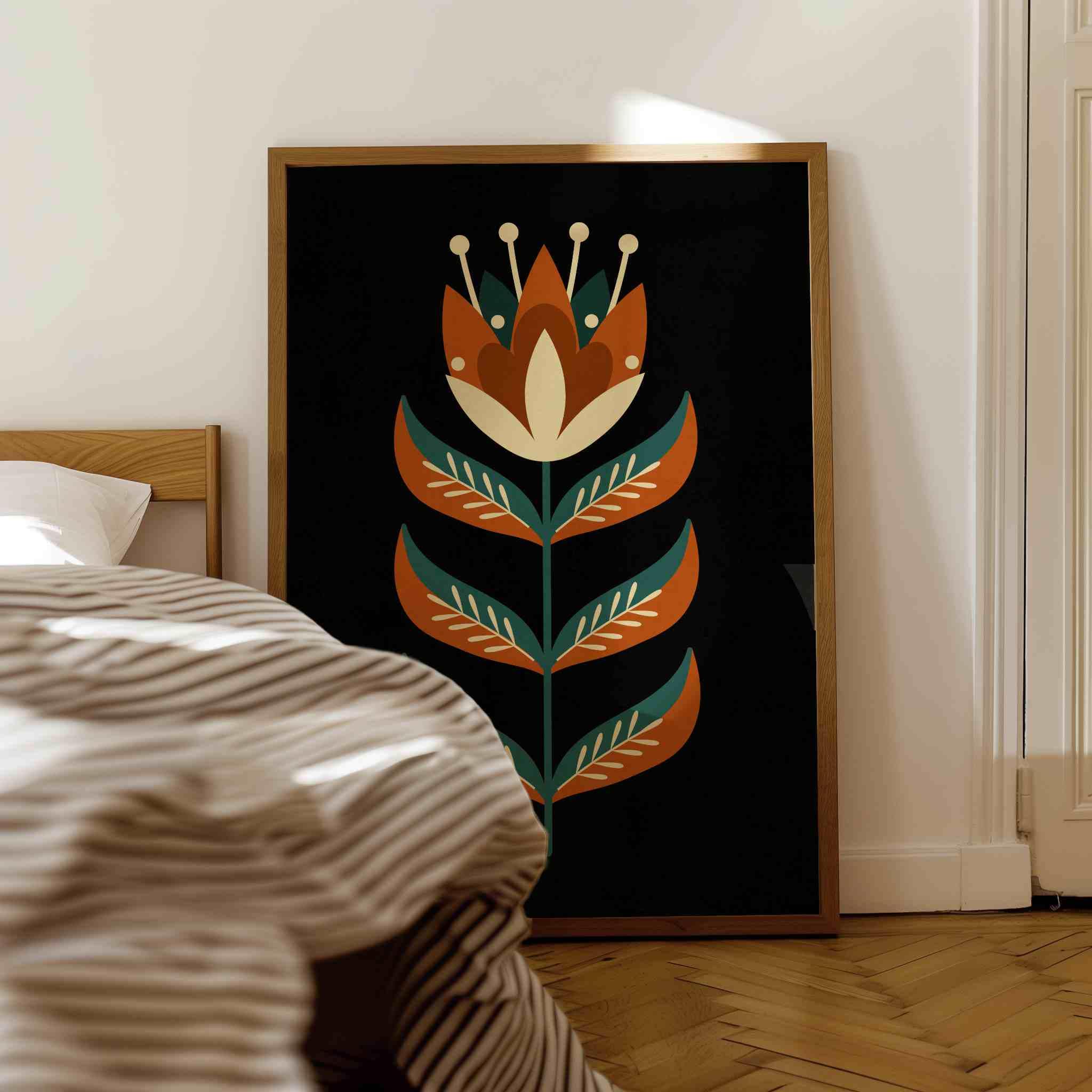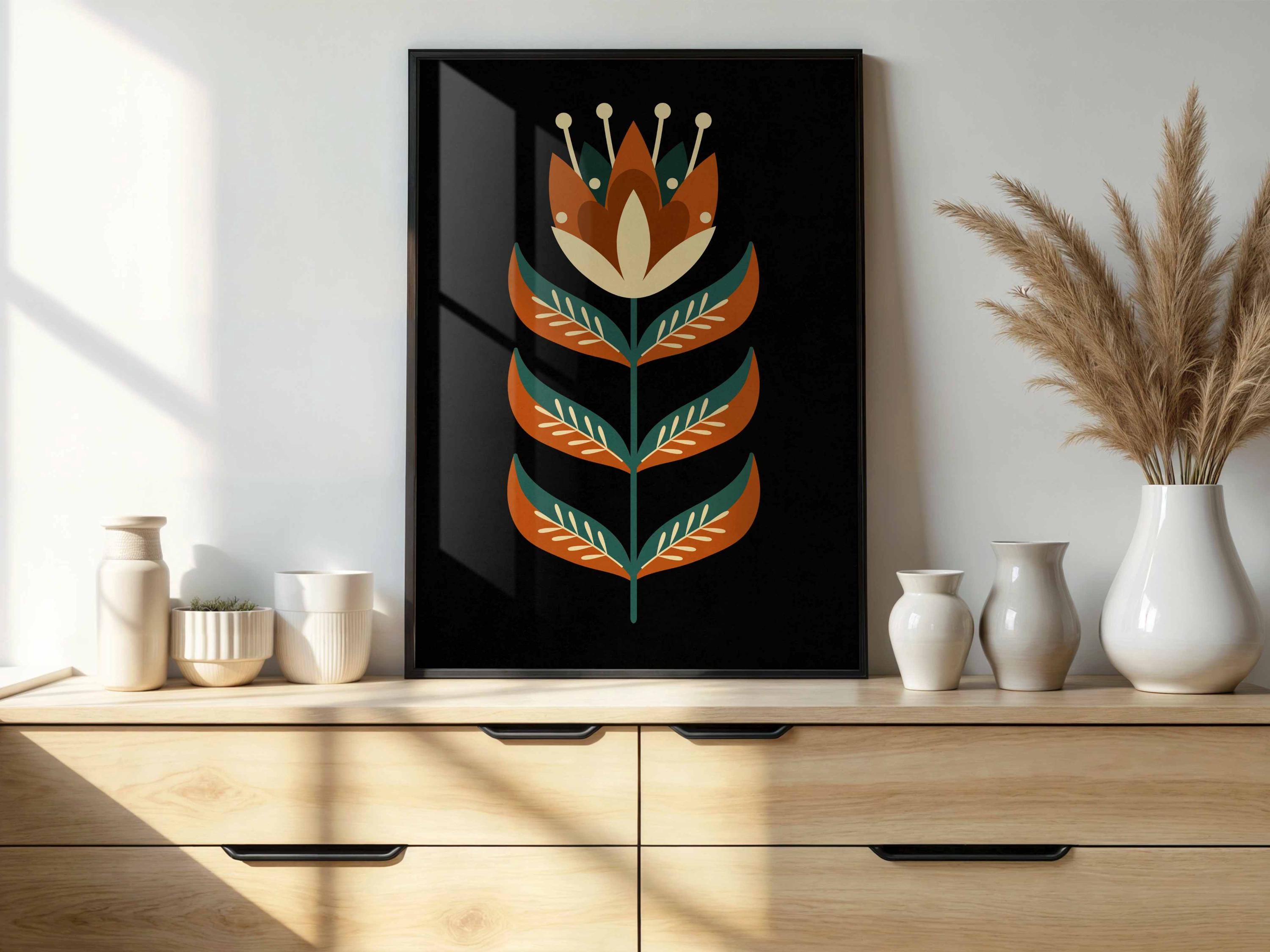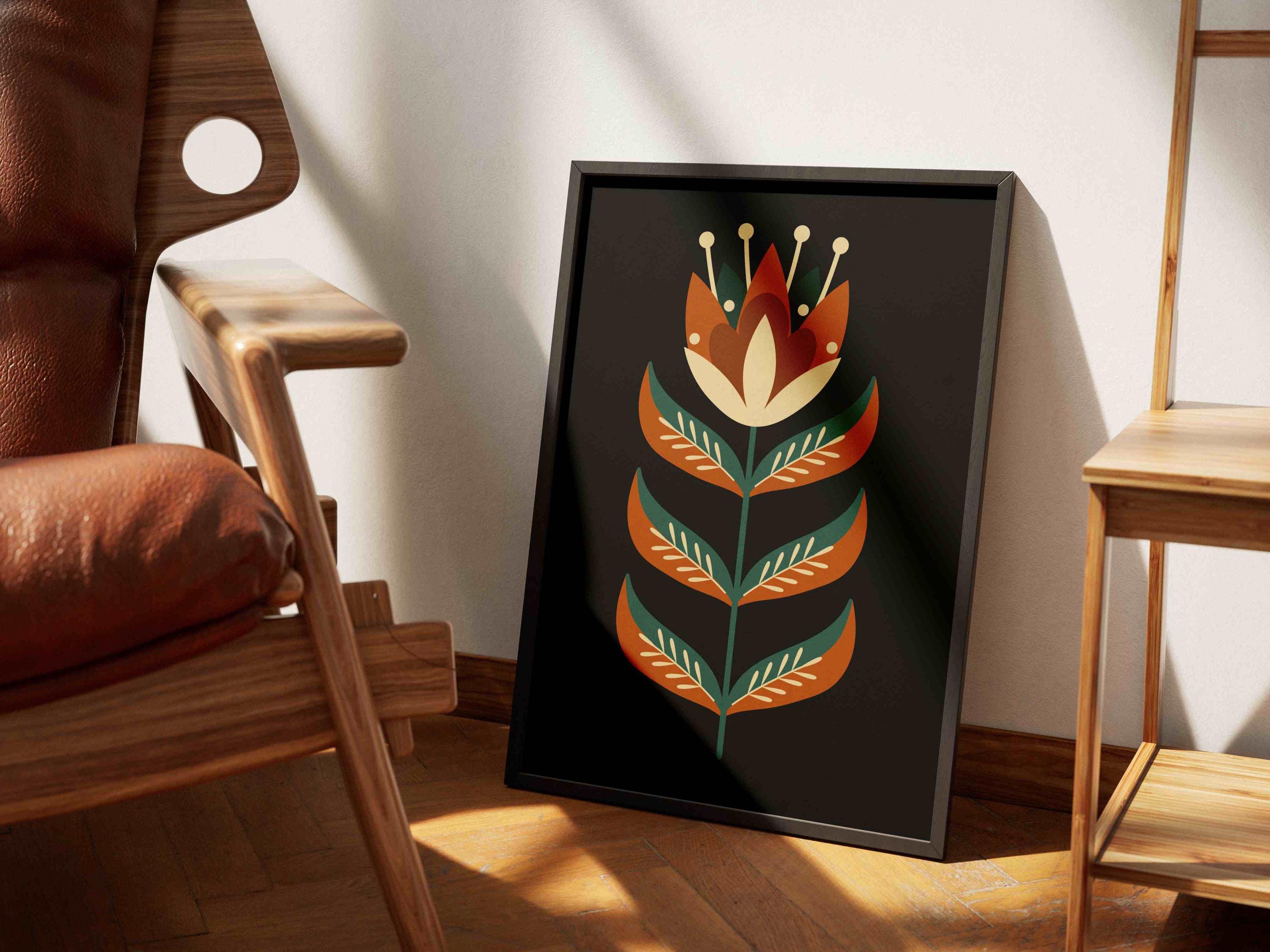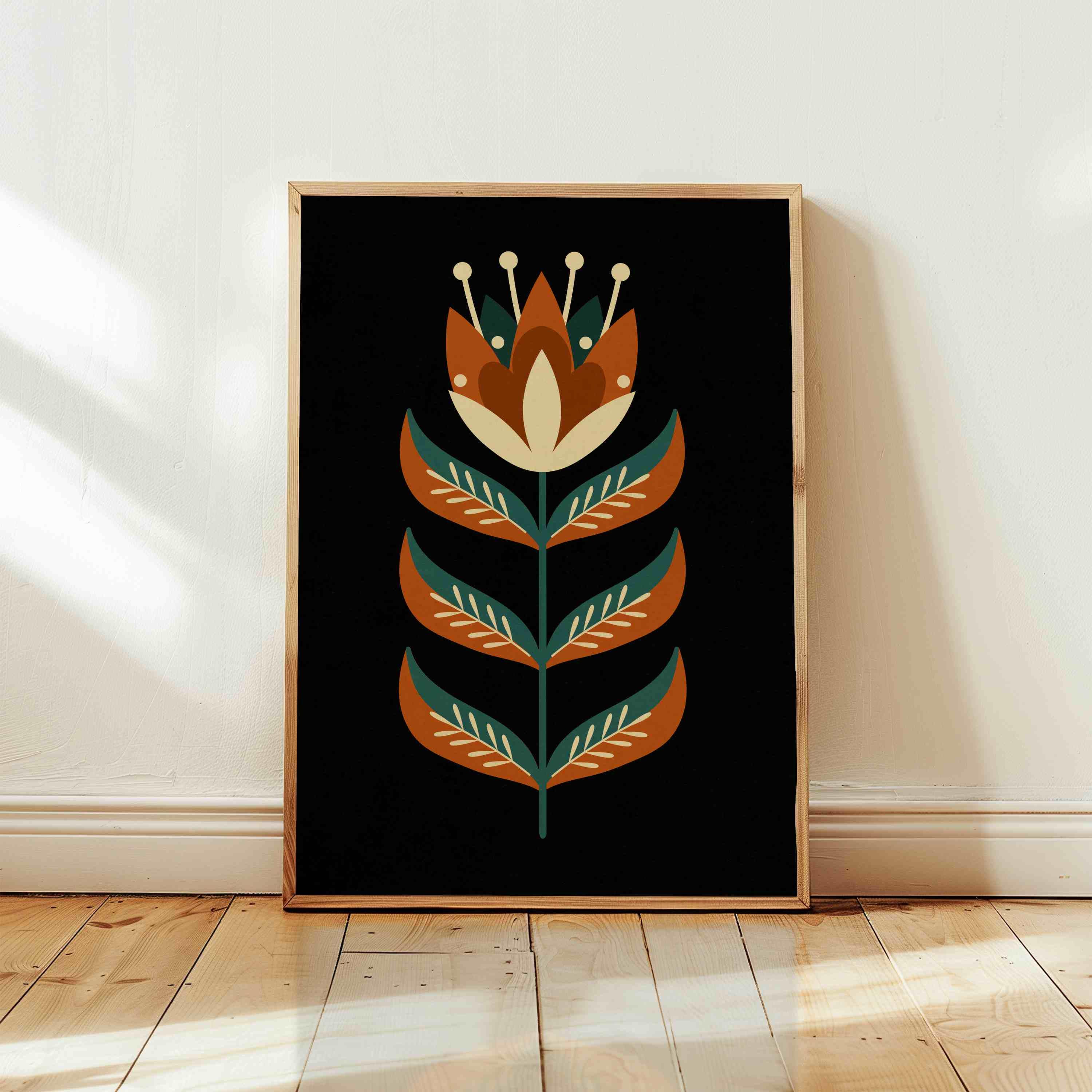 Stylized floral print inspired by Scandinavian folk art and mid-century modern aesthetics. Featuring bold geometric shapes and warm retro tones against a deep background, this piece is perfect for Nordic, mid-century modern, or vintage-inspired interiors.