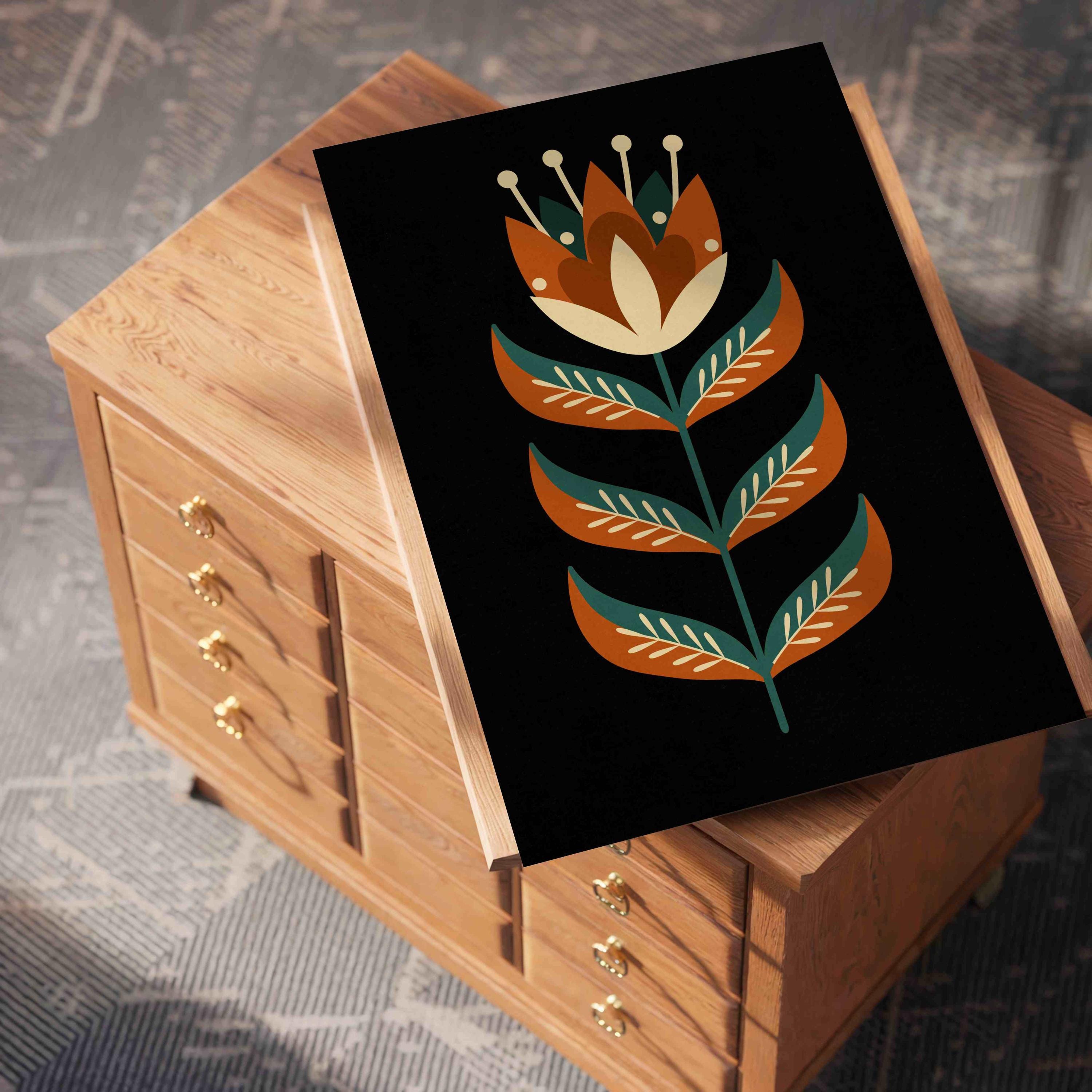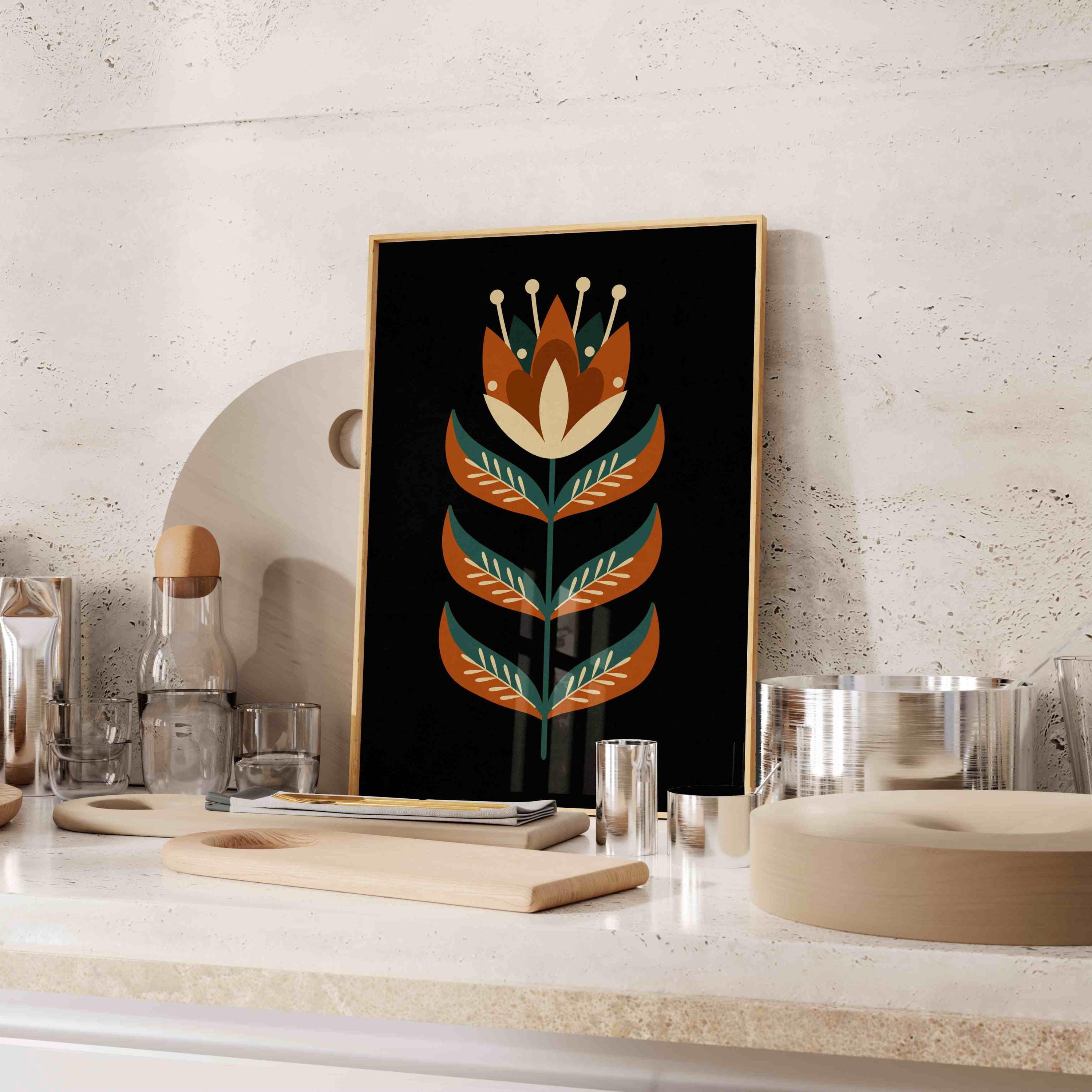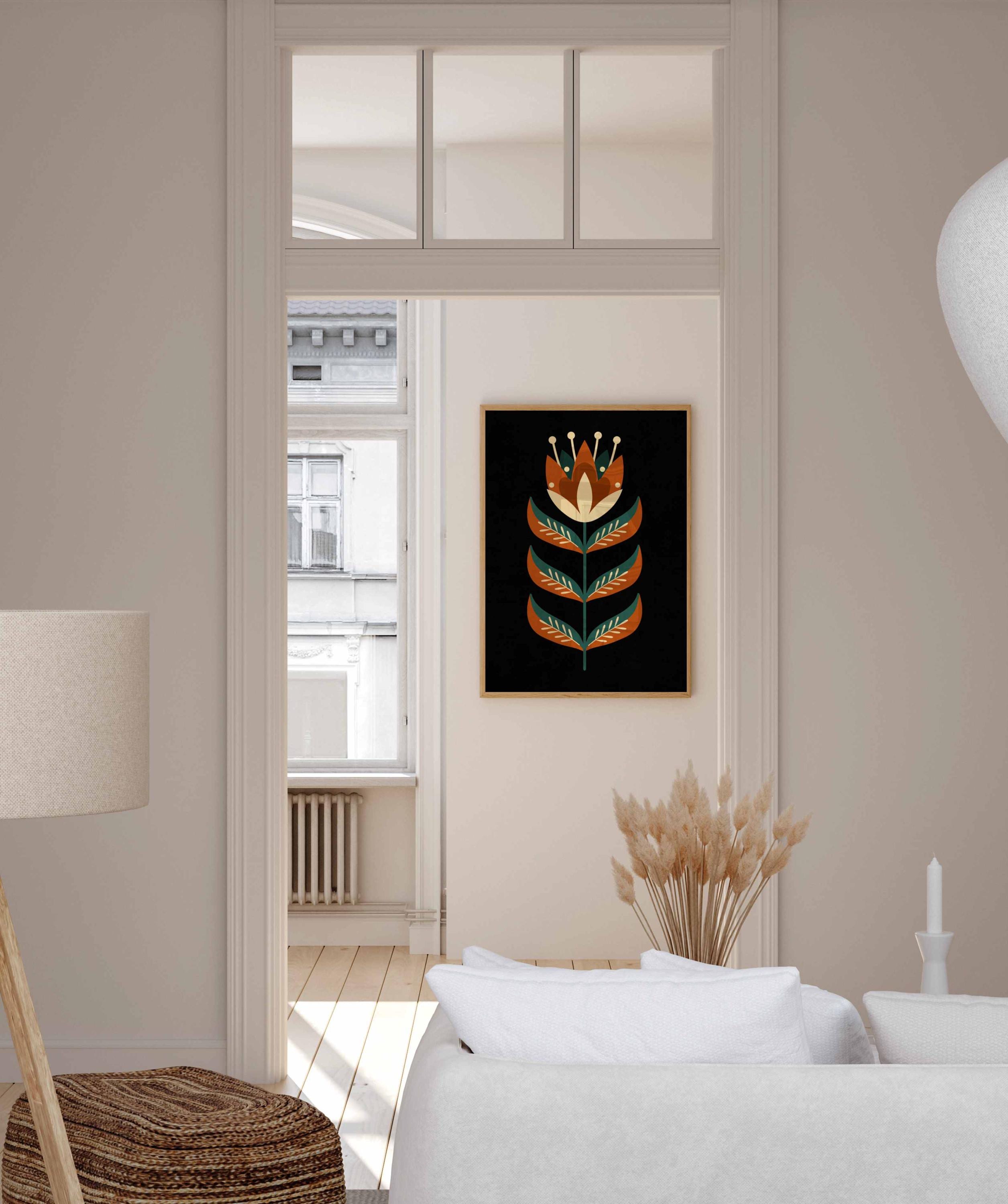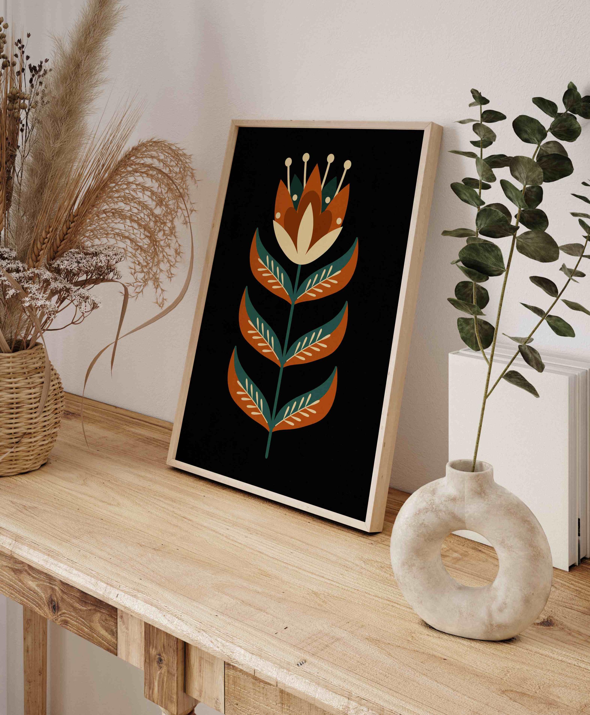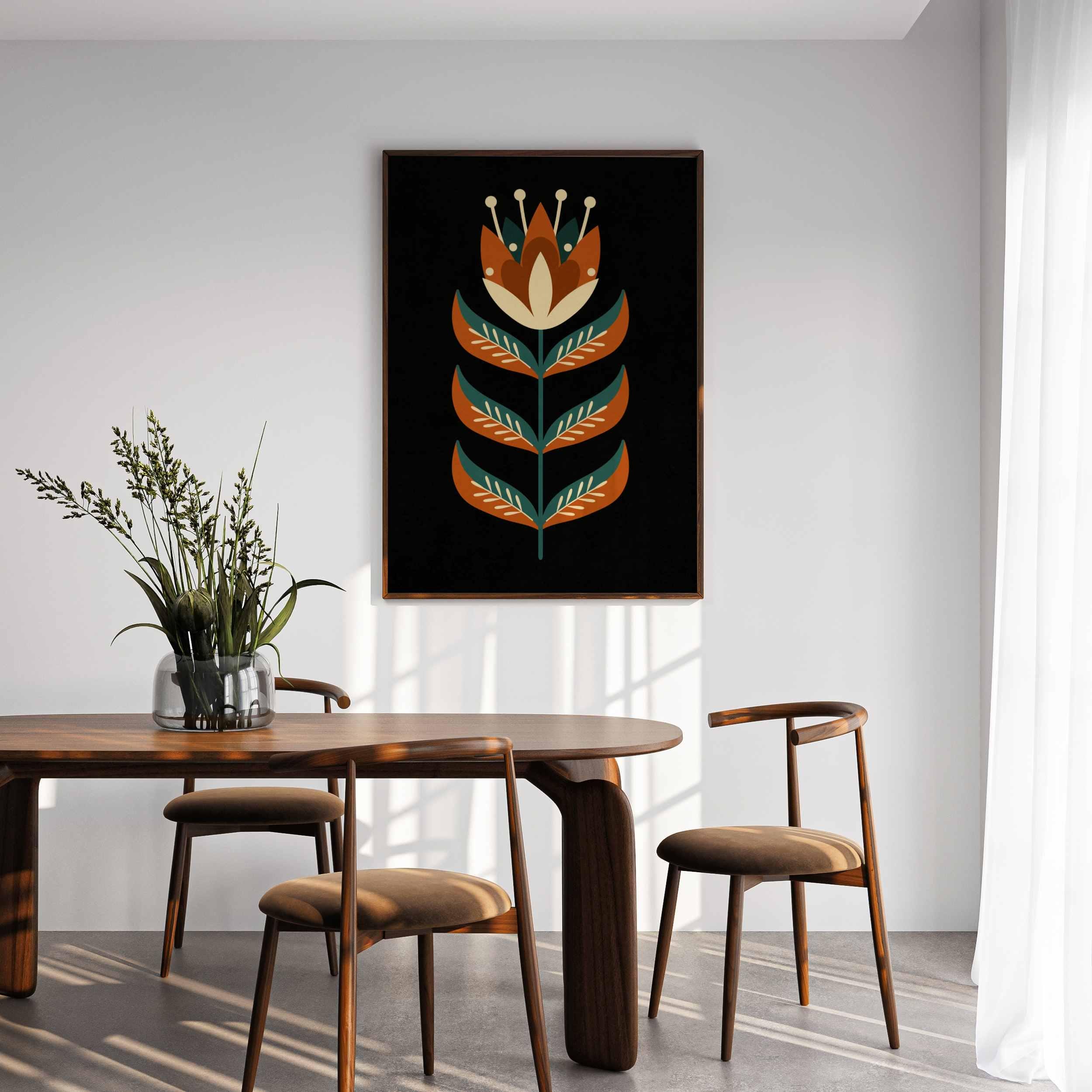Stylized floral print inspired by Scandinavian folk art and mid-century modern aesthetics. Featuring bold geometric shapes and warm retro tones against a deep background, this piece is perfect for Nordic, mid-century modern, or vintage-inspired interiors.