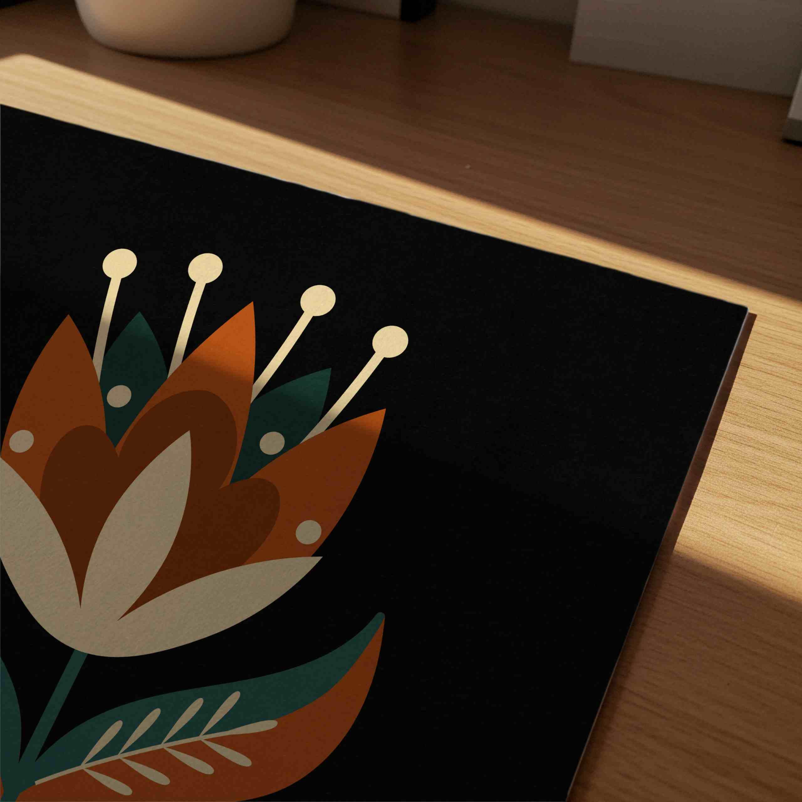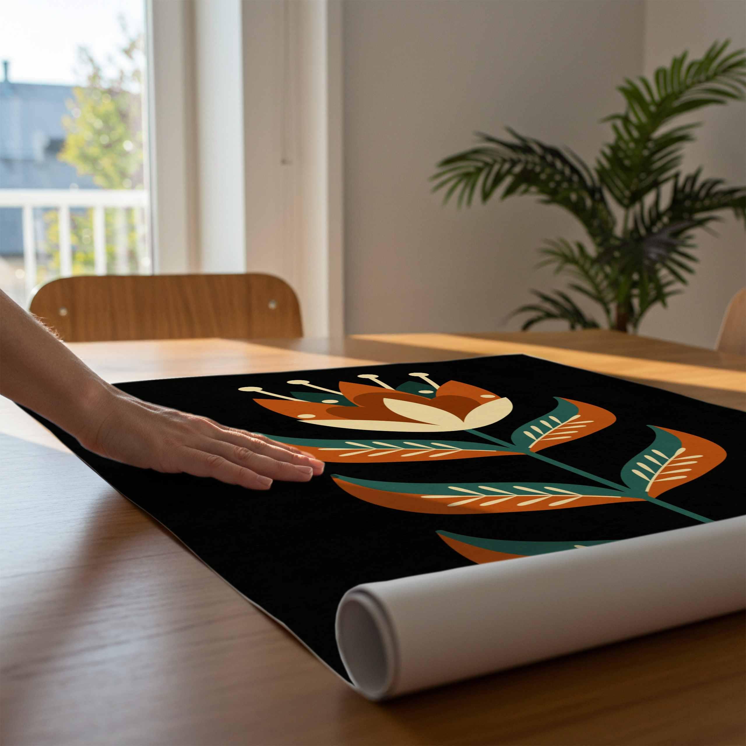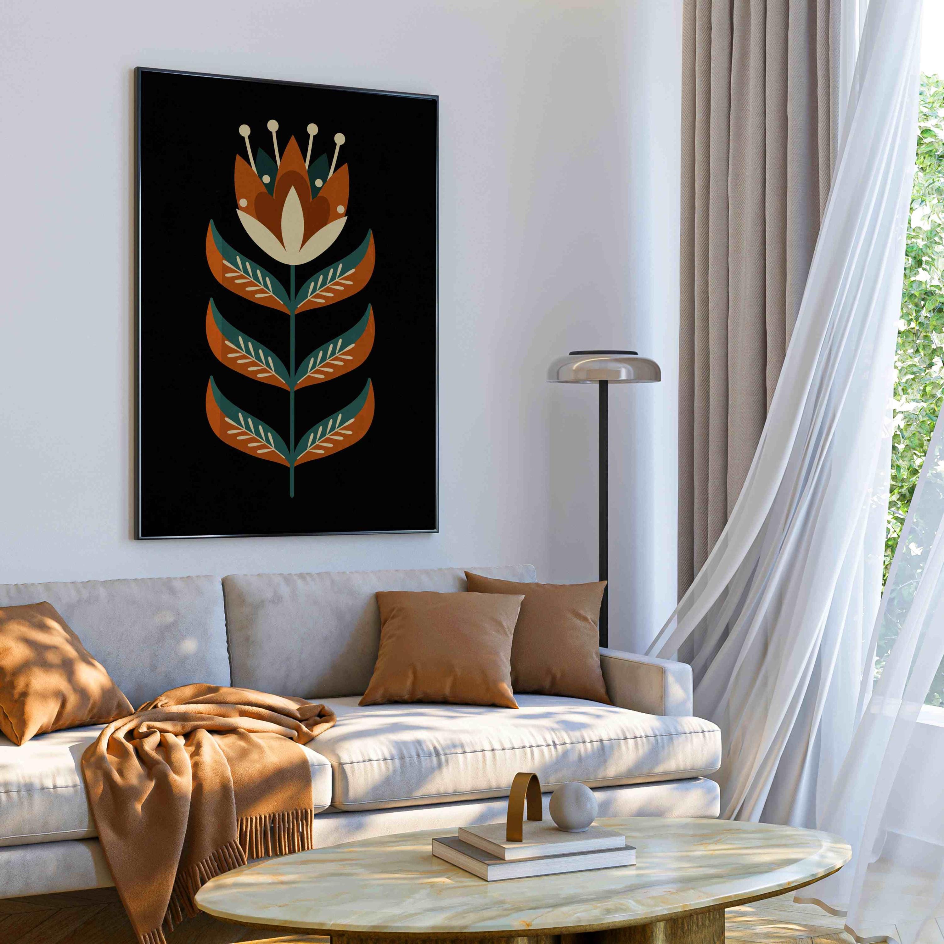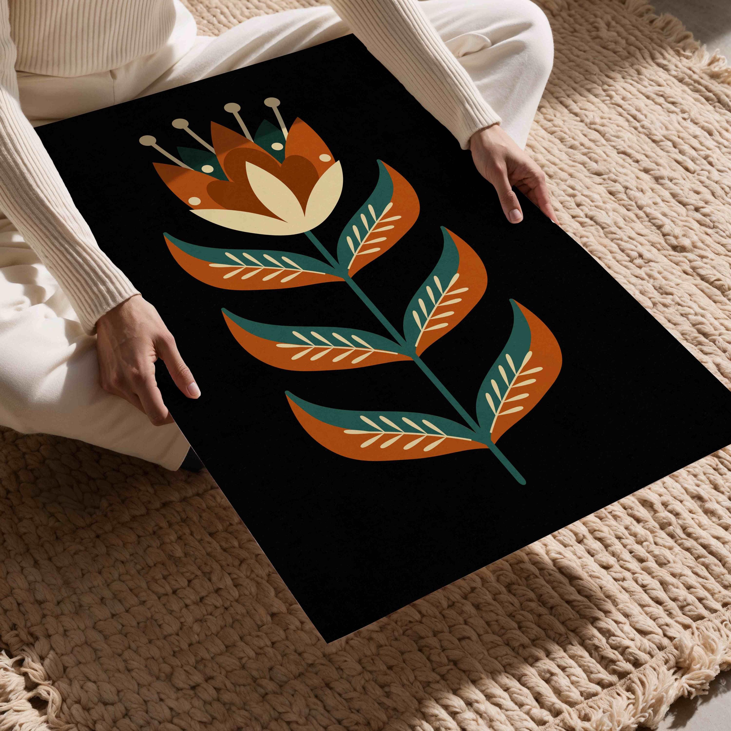 Stylized floral print inspired by Scandinavian folk art and mid-century modern aesthetics. Featuring bold geometric shapes and warm retro tones against a deep background, this piece is perfect for Nordic, mid-century modern, or vintage-inspired interiors.